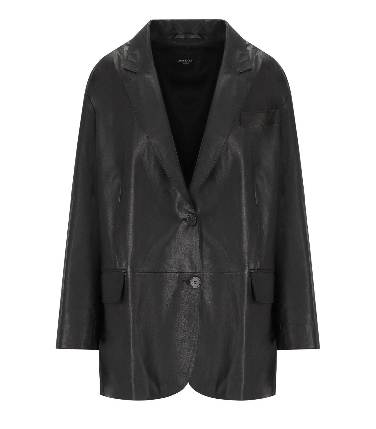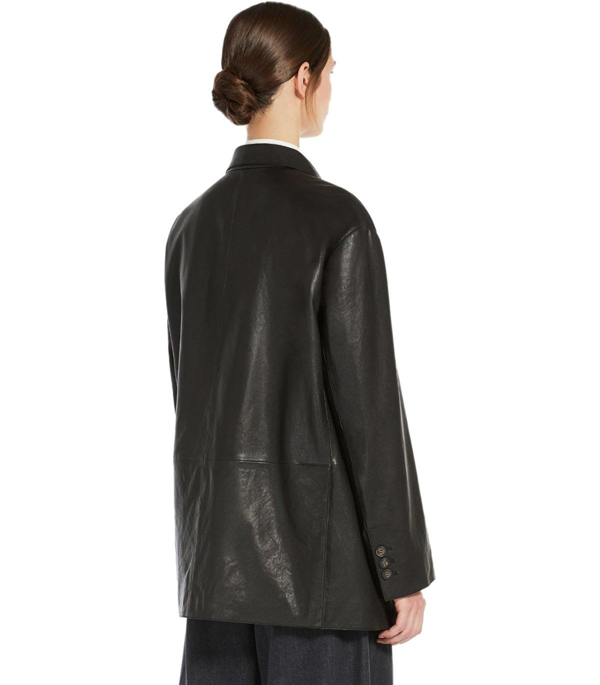 Single-breasted Marat blazer by Max Mara Weekend made of fine nappa leather in black. Characterized by a horn-button closure, it features flap pockets at the front, a smoking-style chest pocket, and a lapel collar. Internally lined, it has long raglan sleeves finished with buttoned cuffs. Adorned at the back with leather-style cuts. Oversized fit. The model wears size 40 (IT) and is 178 cm tall. Composition: lamb model; lining in 100% polyester.