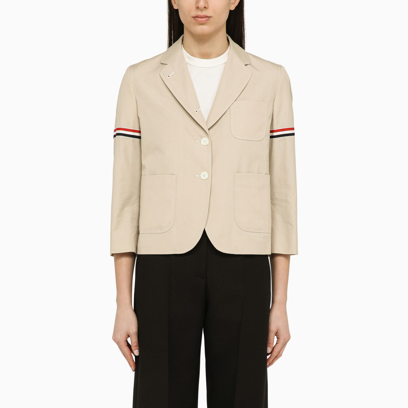 Khaki cotton-blend single-breasted jacket from Thom Browne featuring a cropped silhouette, a front button placket, tricolour sleeve ties, three patch pockets on the front and a back vent.