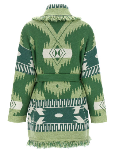 'Icon' cashmere cardigan with all-over jacquard pattern, fringed trimming, belt at the waist, pockets, long sleeves.