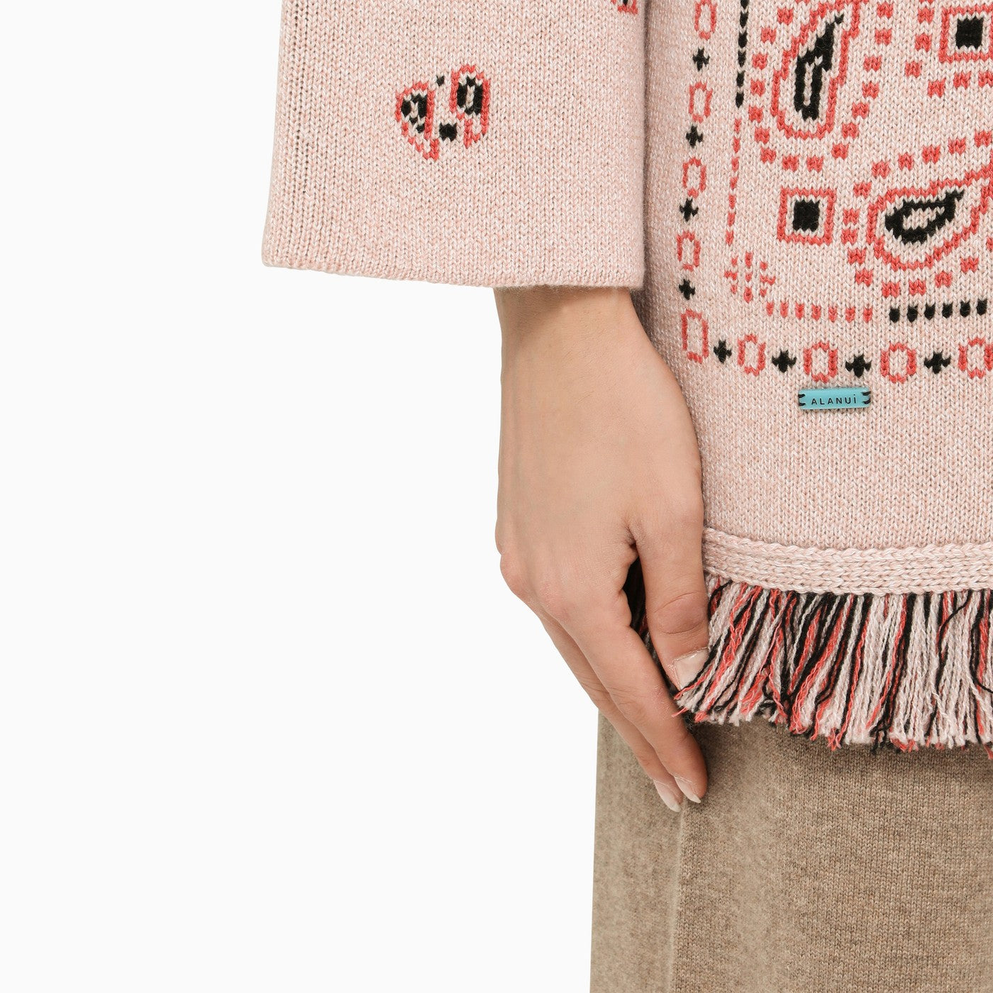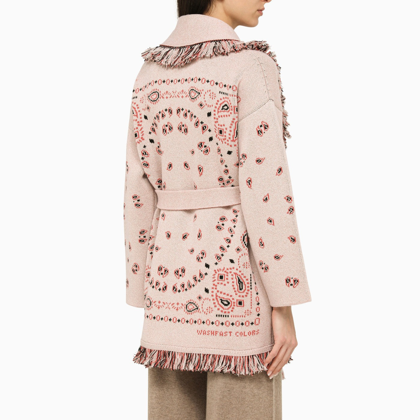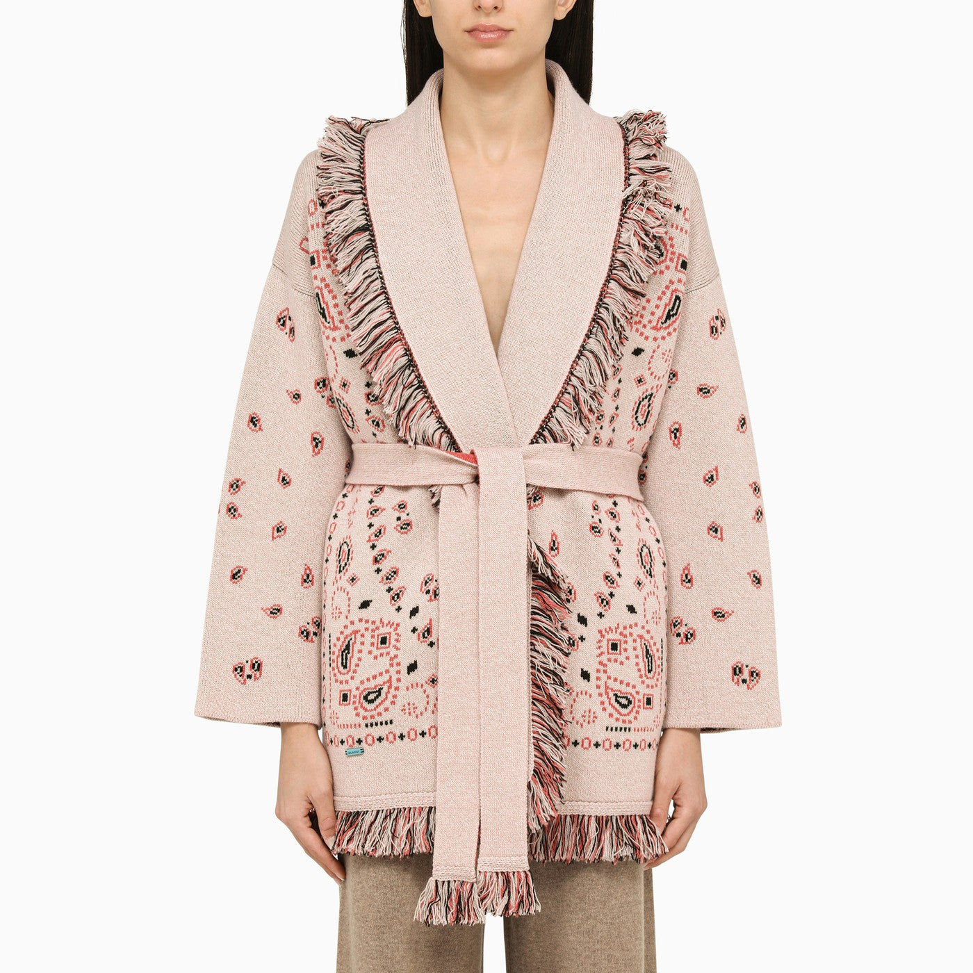 Alanui's pink cashmere cardigan with decorative fringes on the edges, long sleeves, waist belt and small logo plaque on the front.