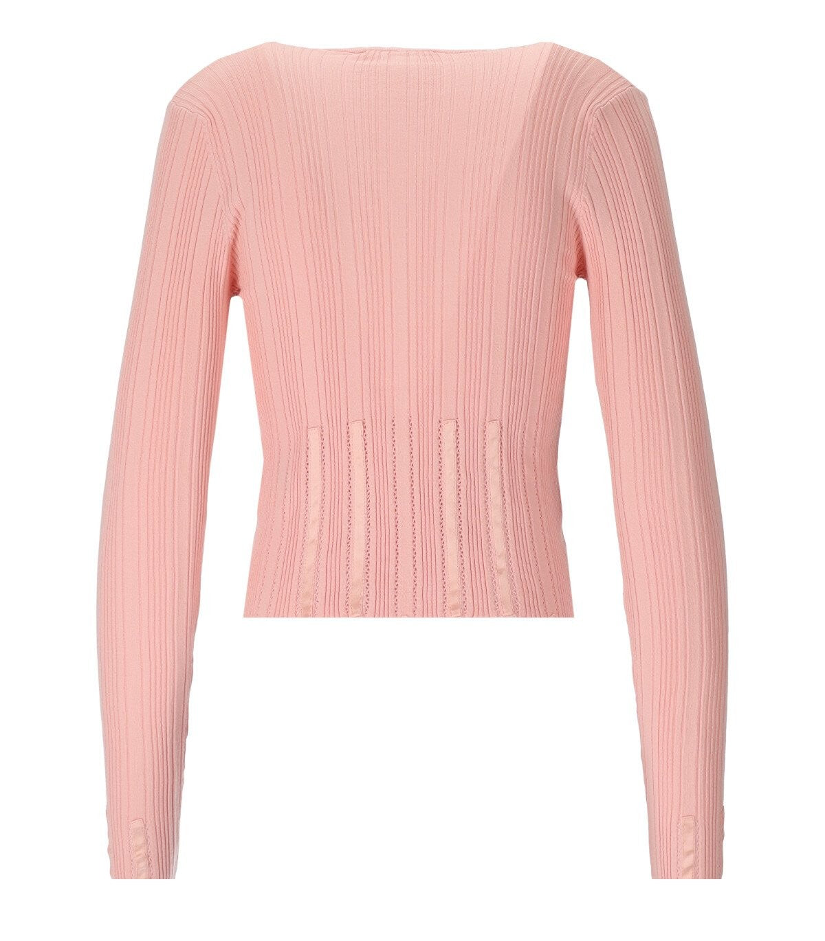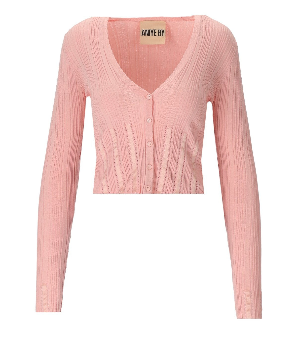 Brigitte cardigan by Aniye By made of pink viscose blend with ribbed pattern and satin inserts on the bottom. V-neck and button closure. Tight fit. Composition: 68% viscose, 32% polyester.