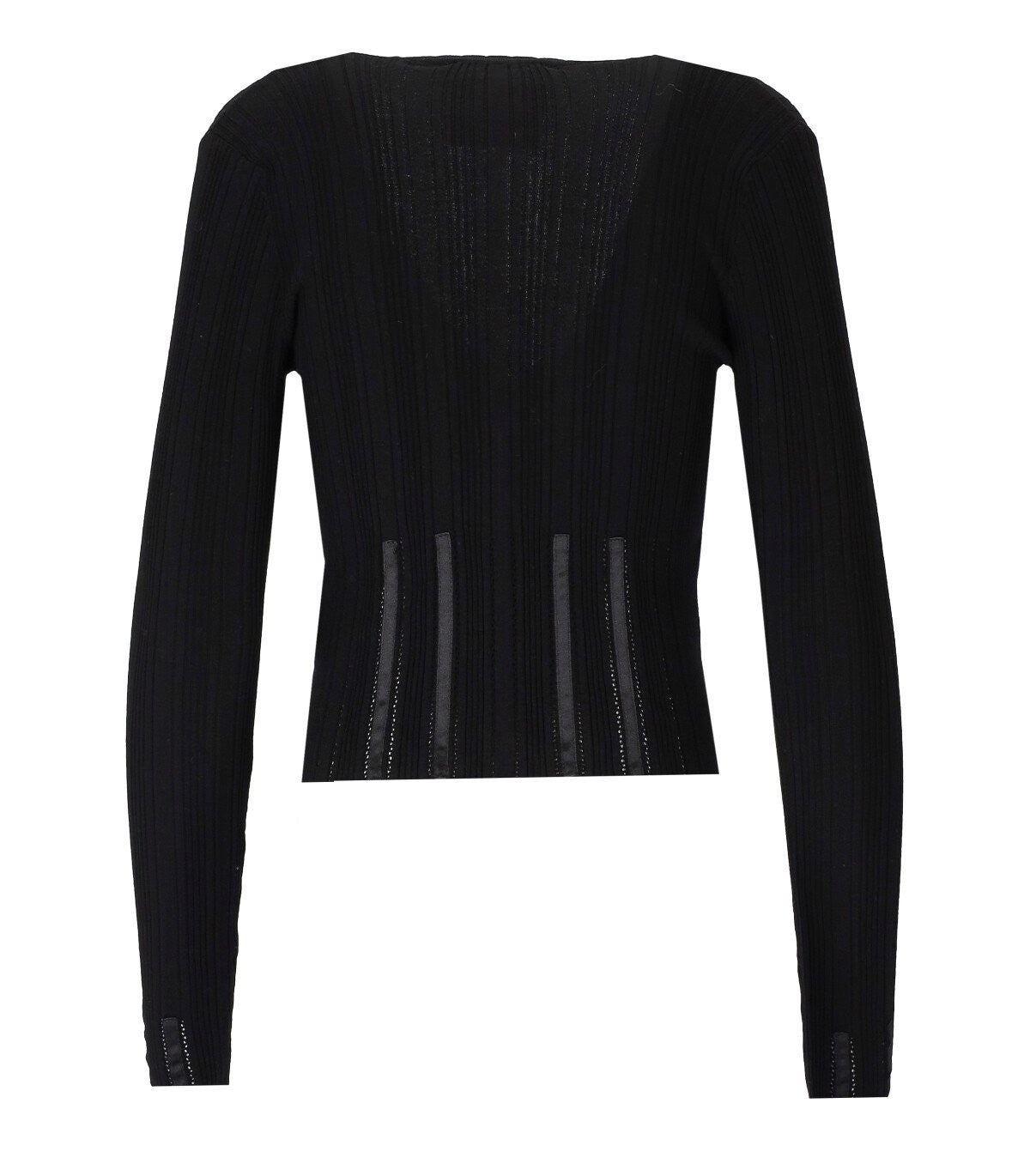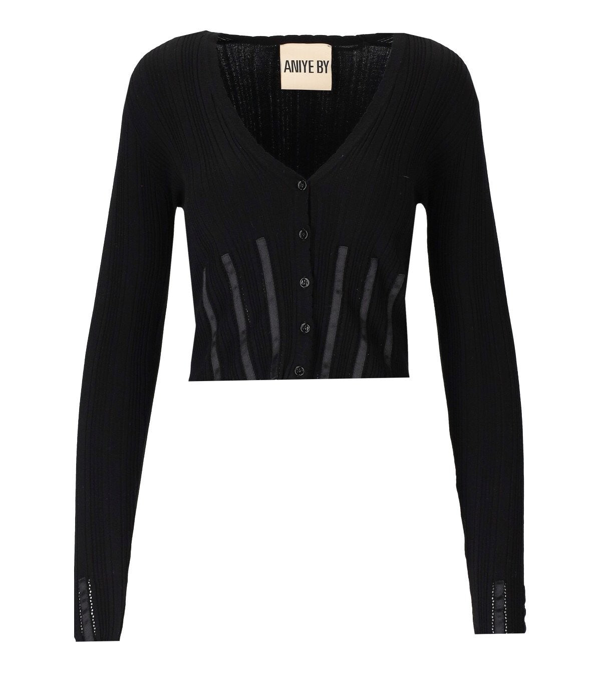 Aniye By Brigitte cardigan made of ribbed black viscose blend, featuring matching satin inserts. V-neck and button closure. Tight fit. Composition: 68% viscose, 32% polyester.