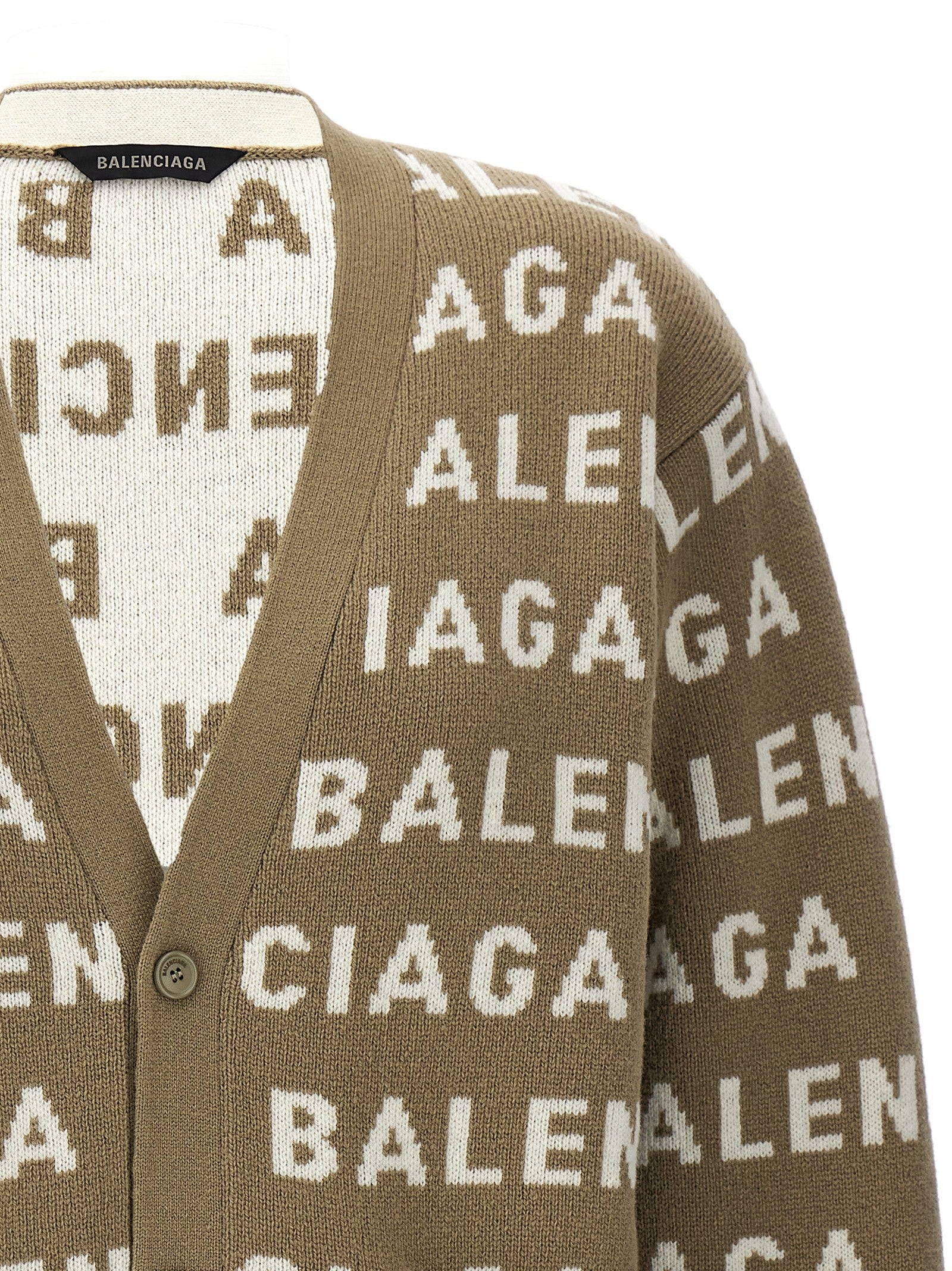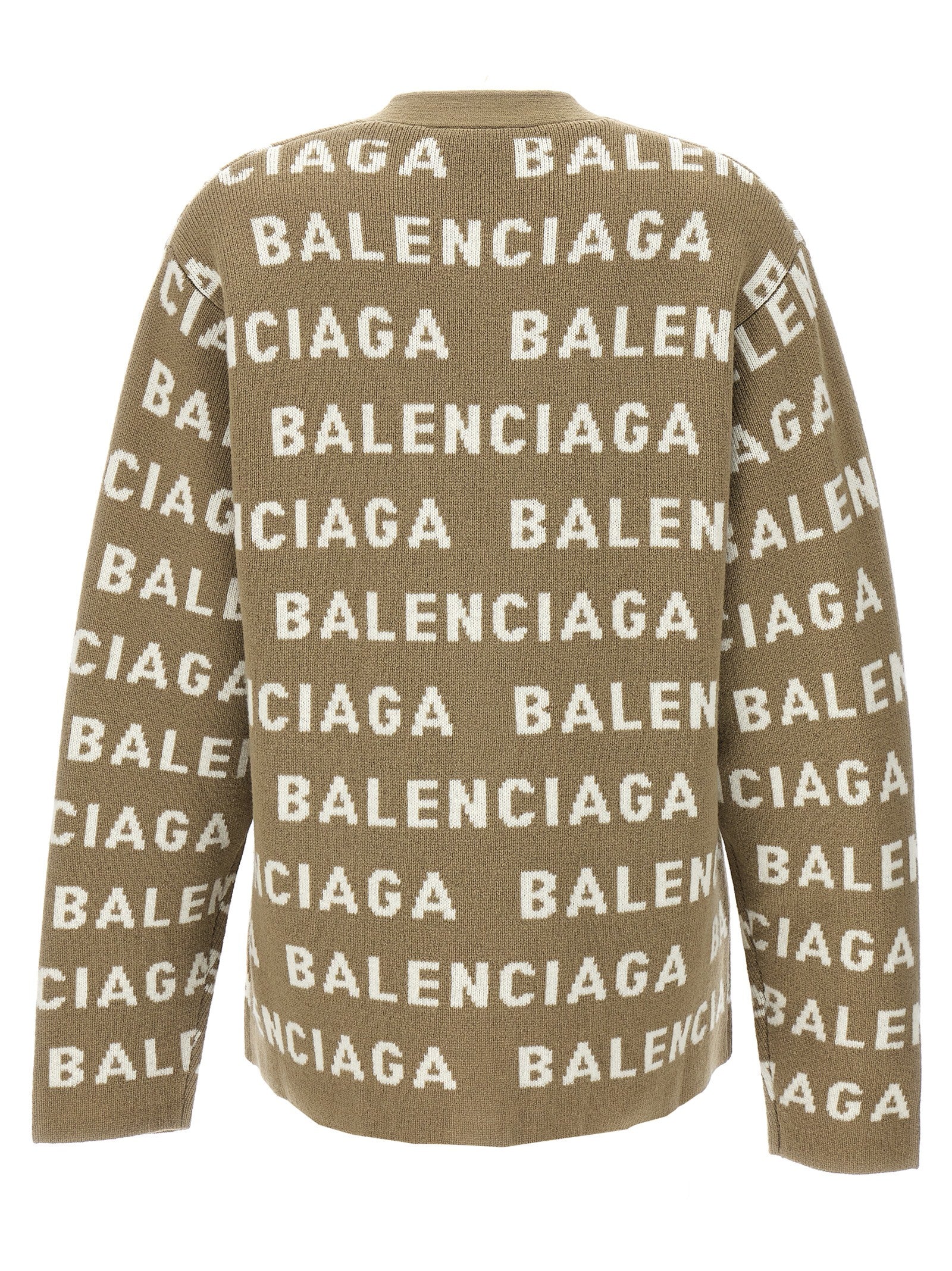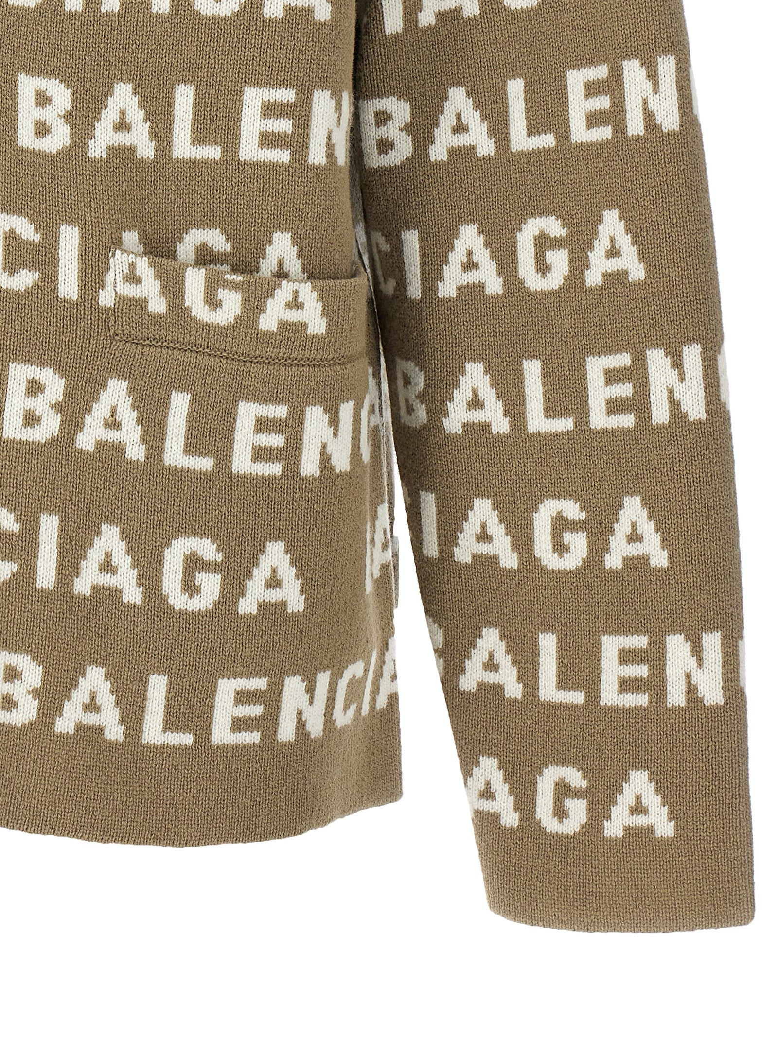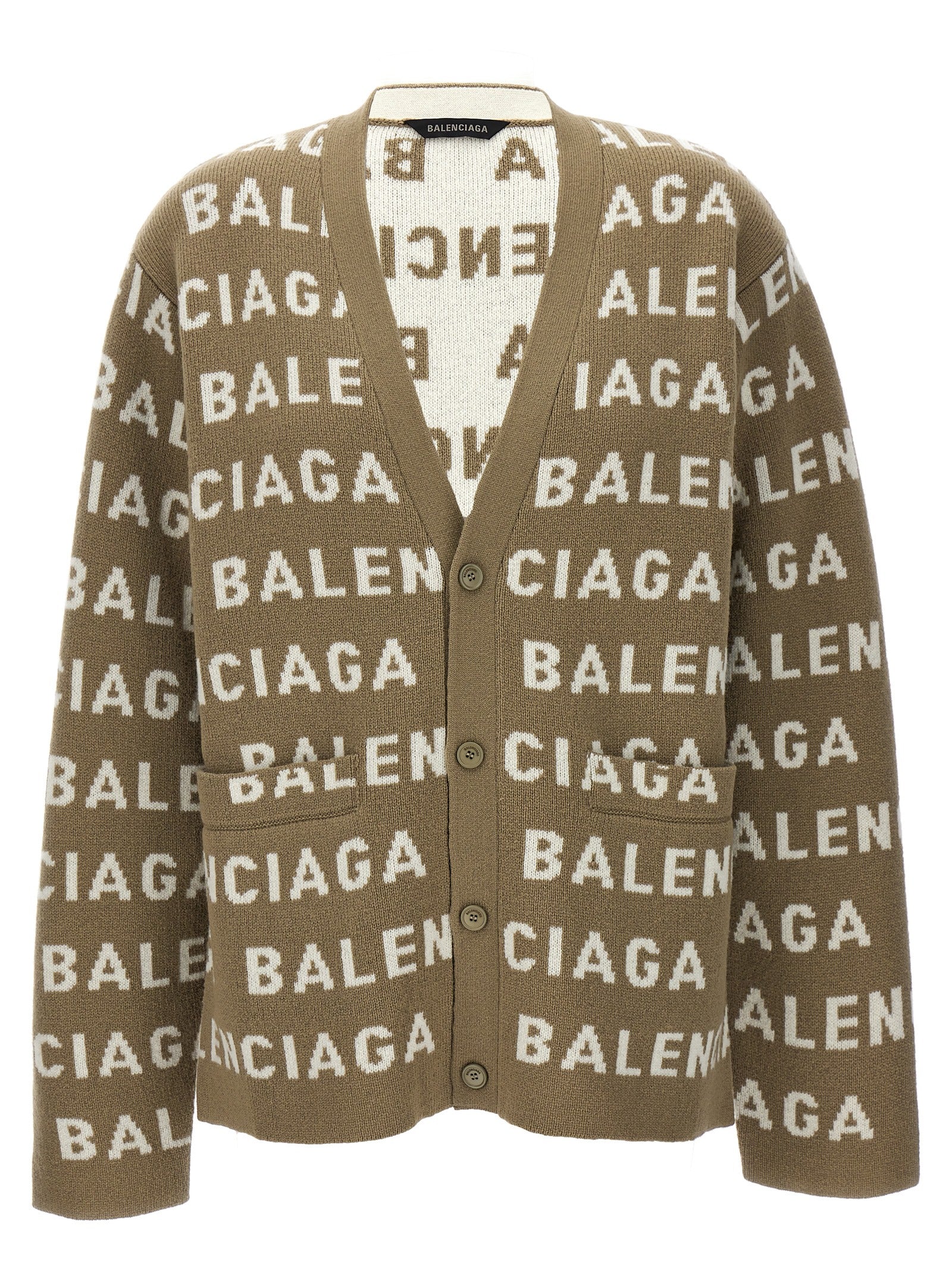 Jacquard wool cardigan with all-over logo, button closure, pockets, long sleeves.