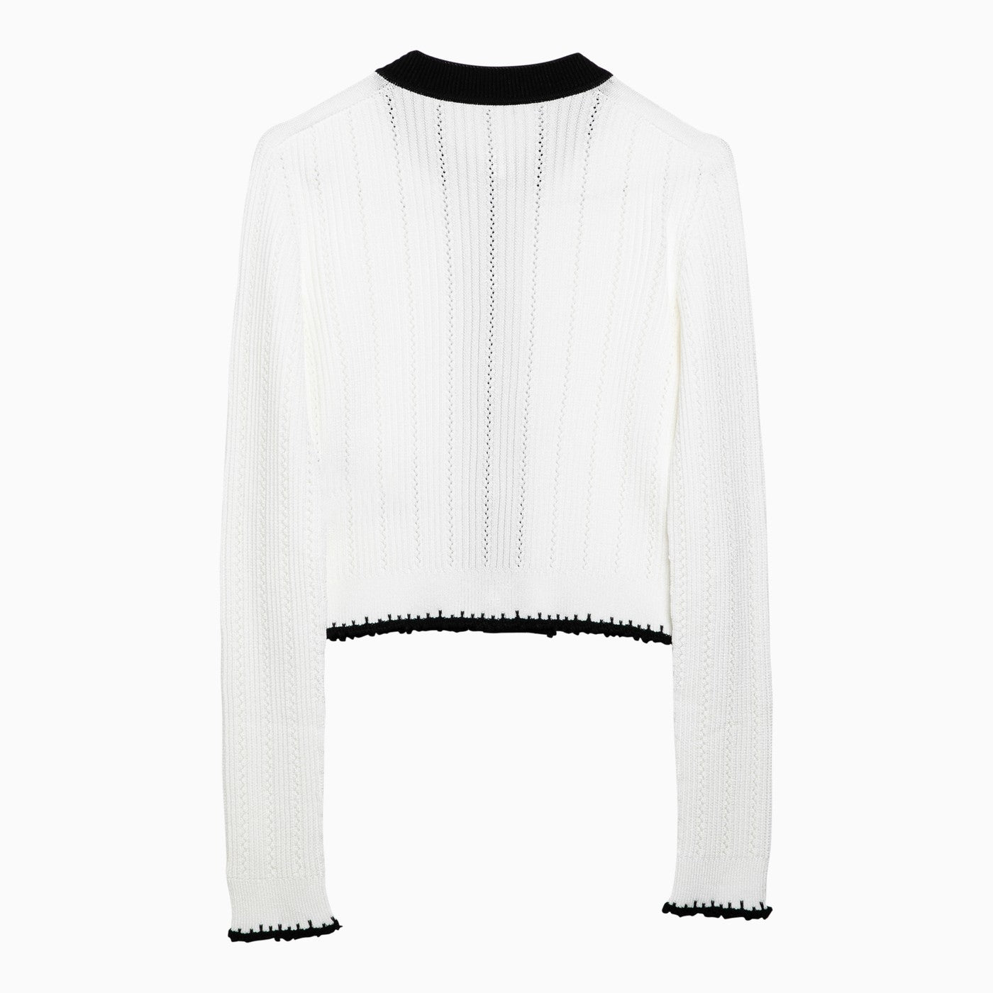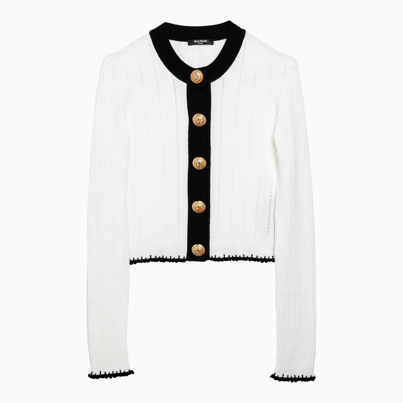 Black and white viscose blend crew-neck cardigan by Balmain features a ribbed design, gold logo buttons on the front and long sleeves.