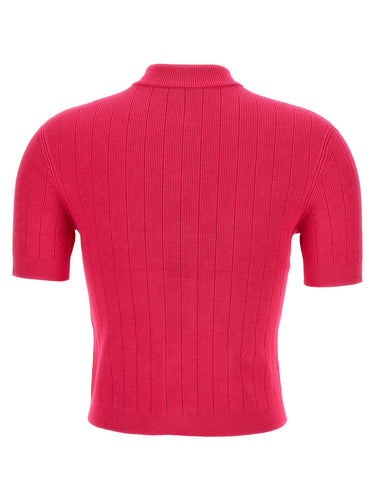 Knitted cardigan in viscose blend, logo button appliqué, button closure, and short sleeves.