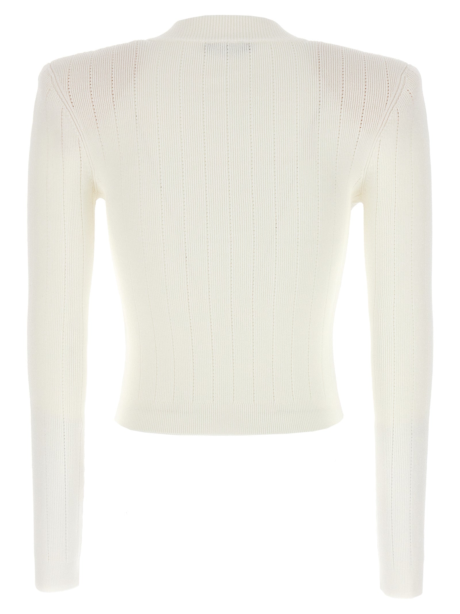 Cropped cardigan in viscose blend knit with logo button closure, V-neck, padded shoulders, long sleeves.