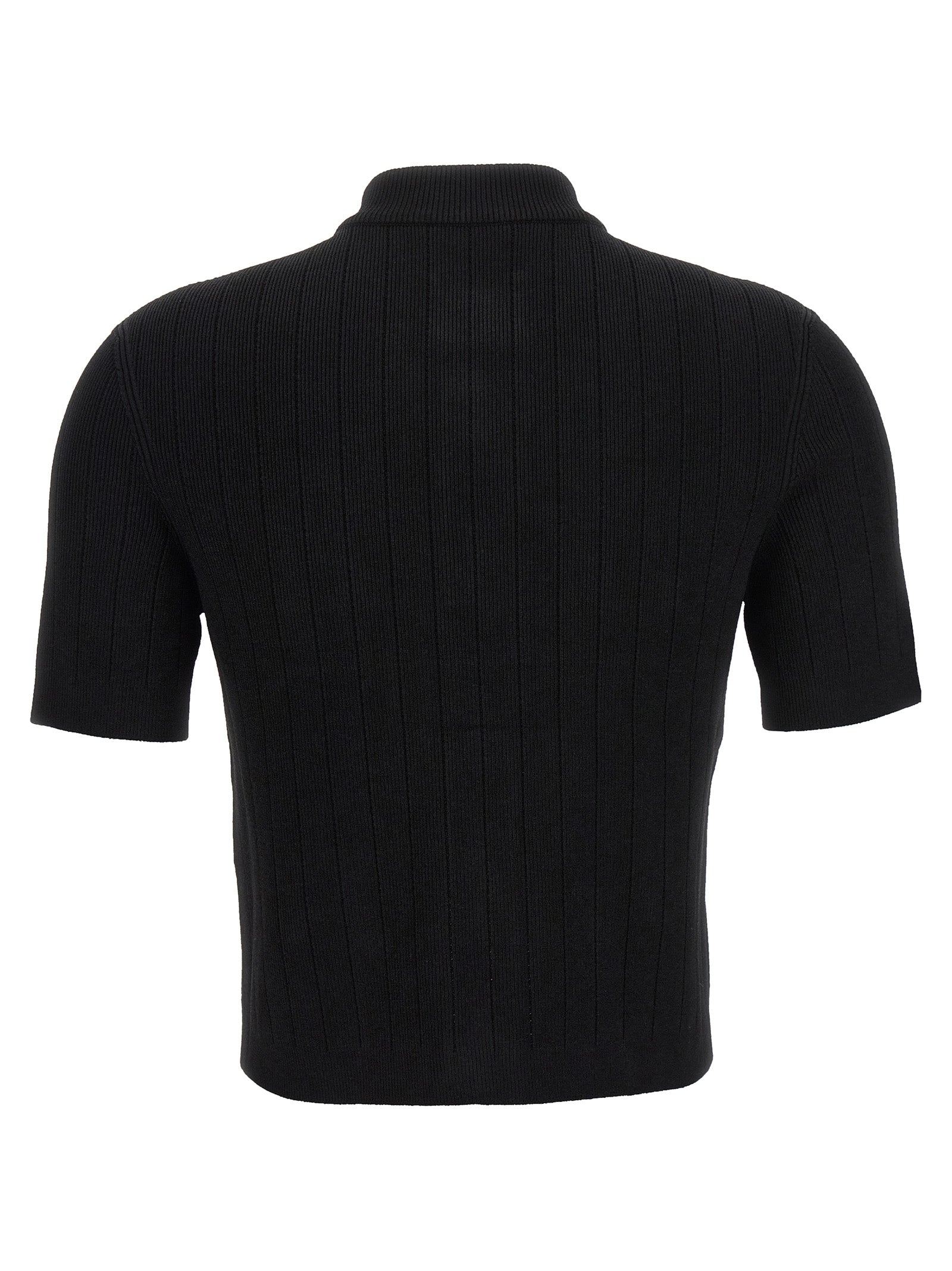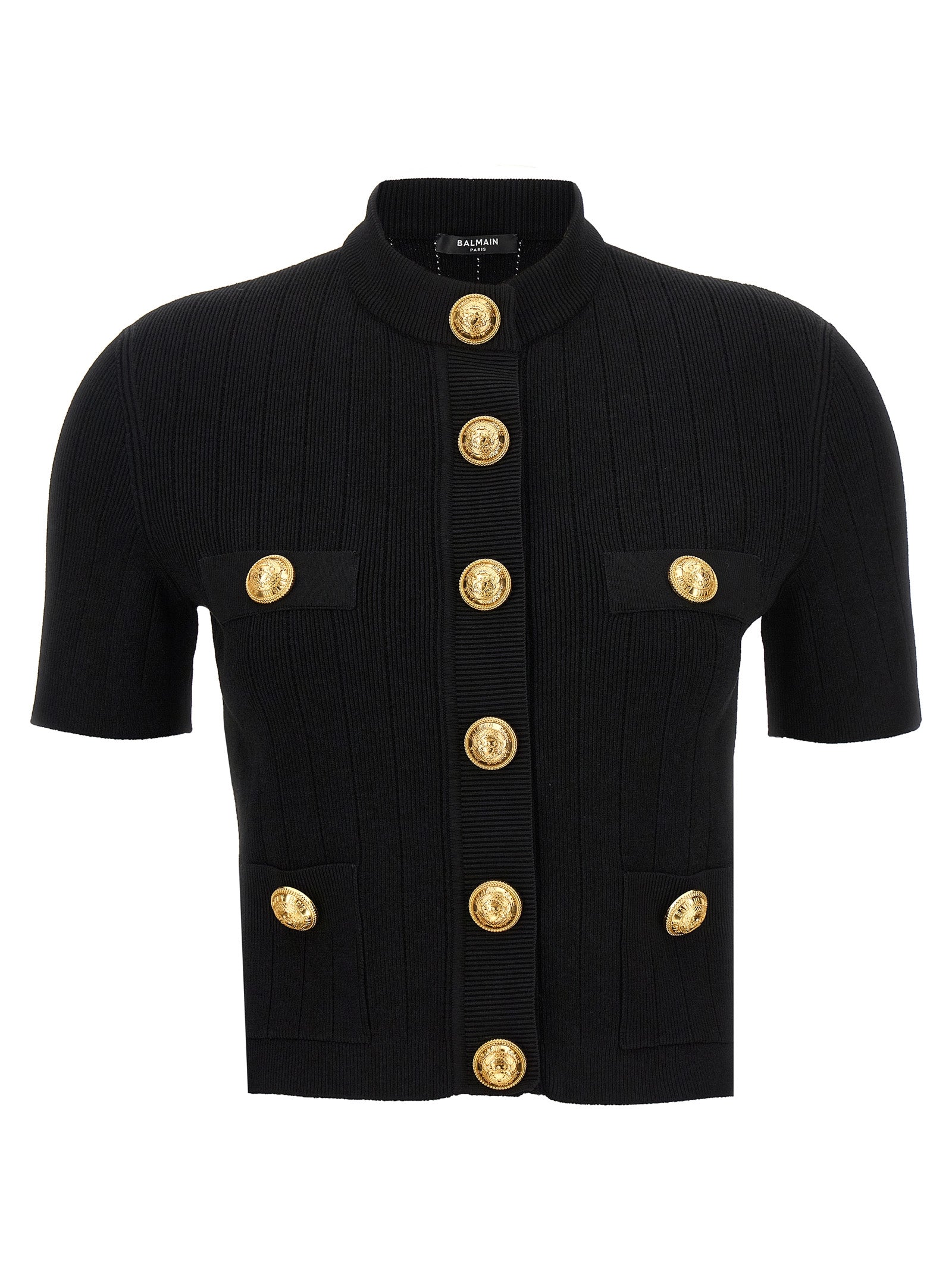 Knitted cardigan in viscose blend, logo button appliqué, button closure, and short sleeves.