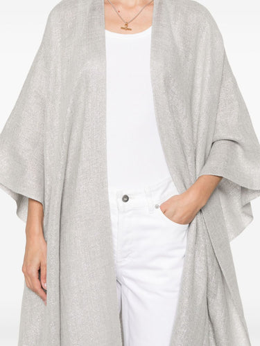 silver-tone lamé effect textured finish long sleeves mid-length fringed hem open front