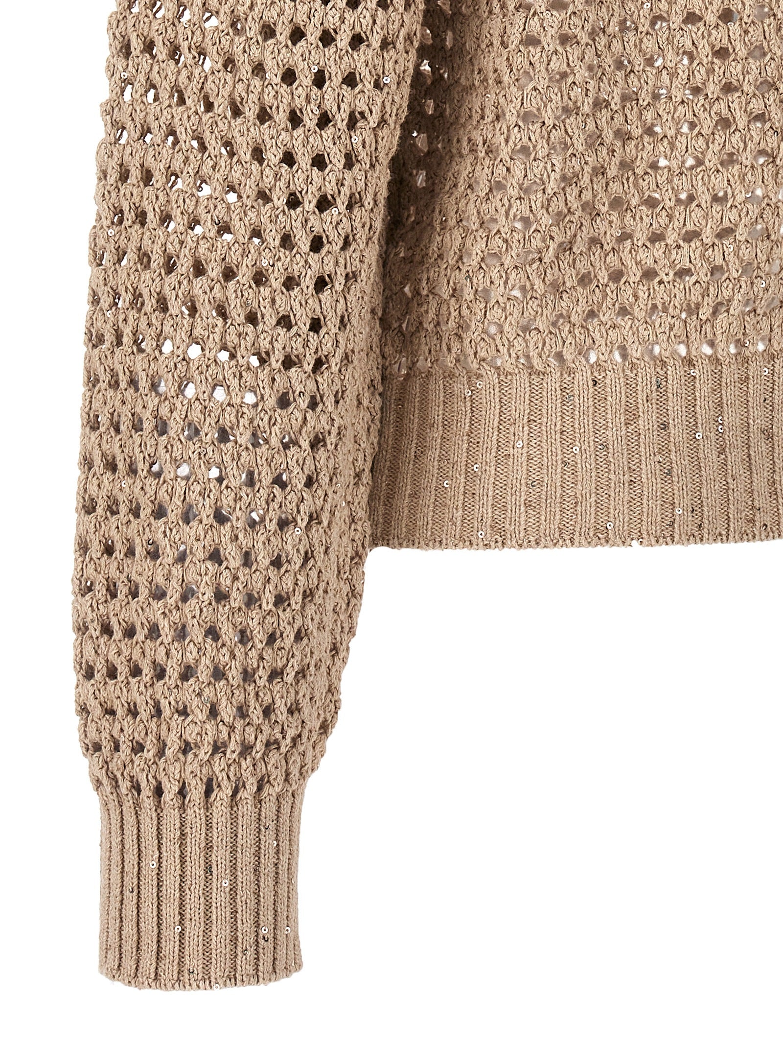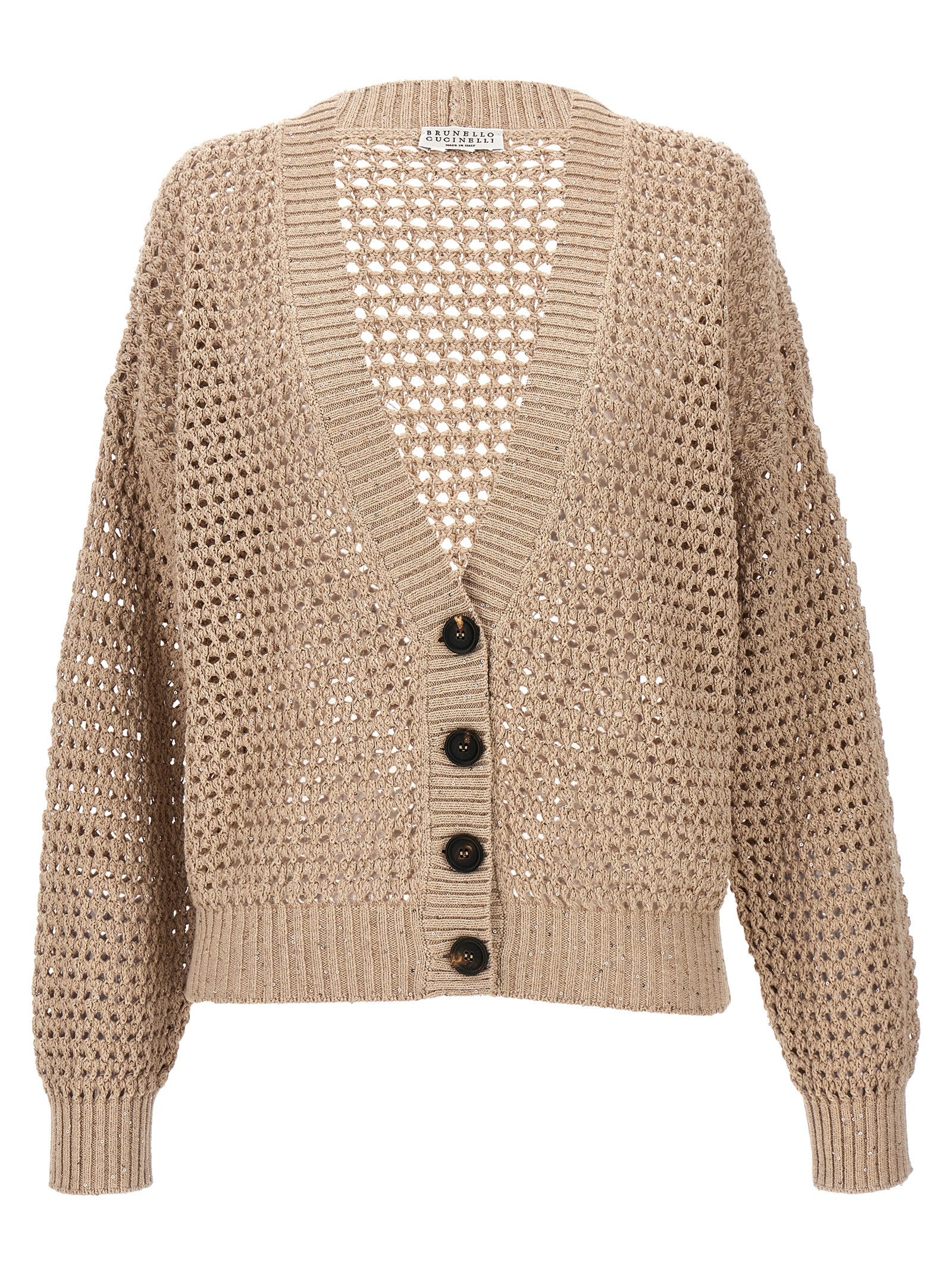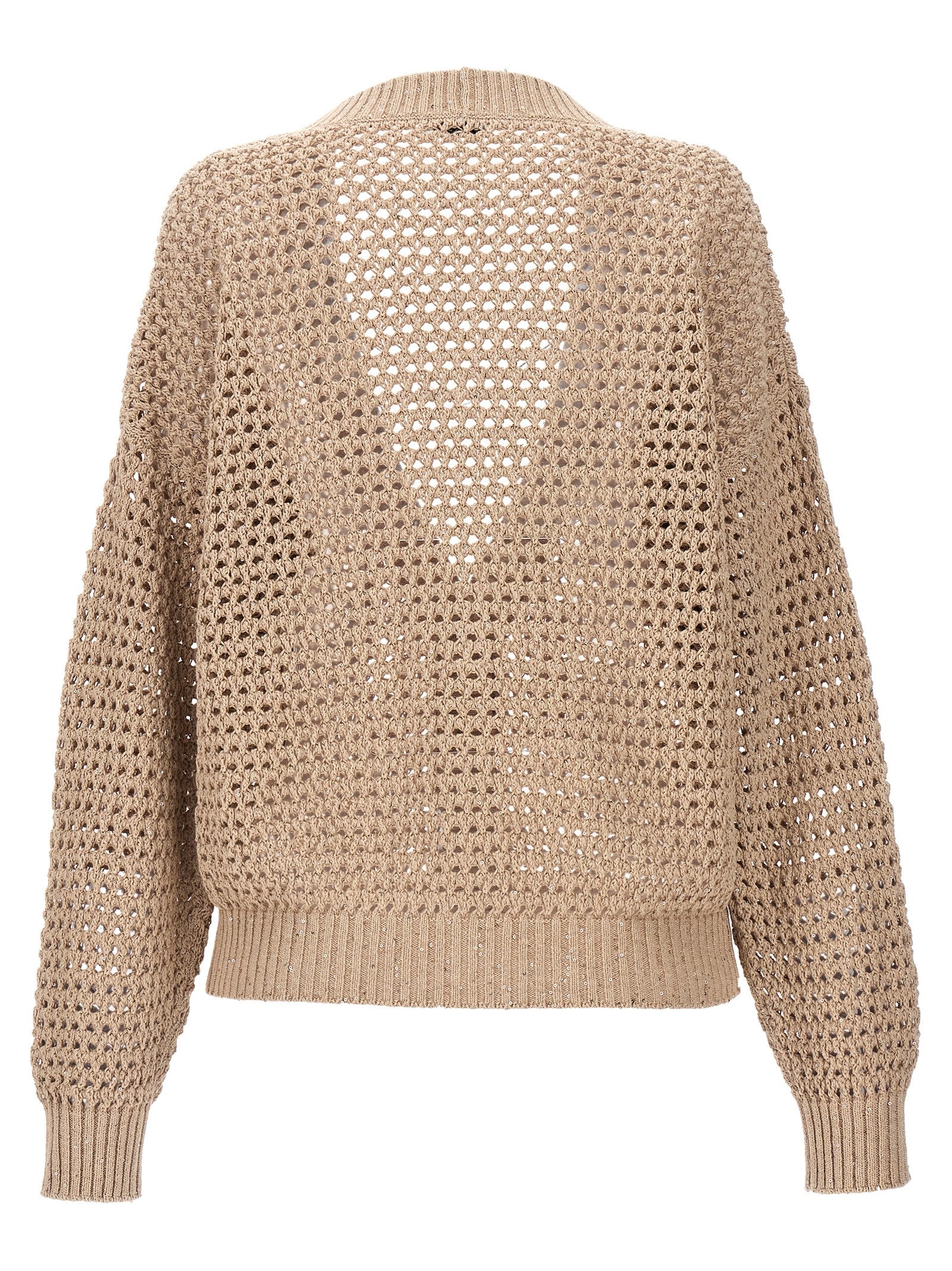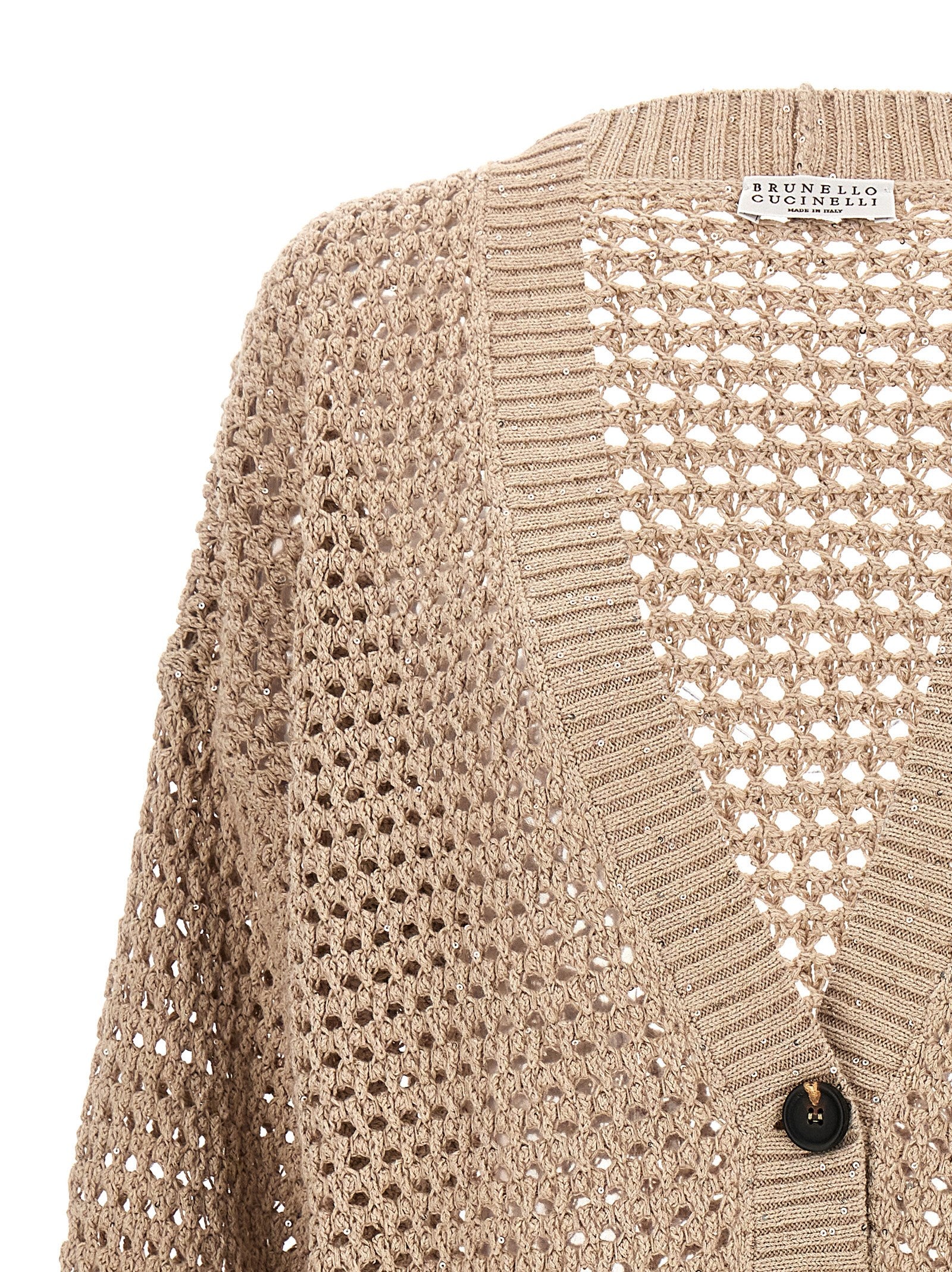 Cotton knit cardigan with sequin appliqué, button closure, long cuffed sleeves.