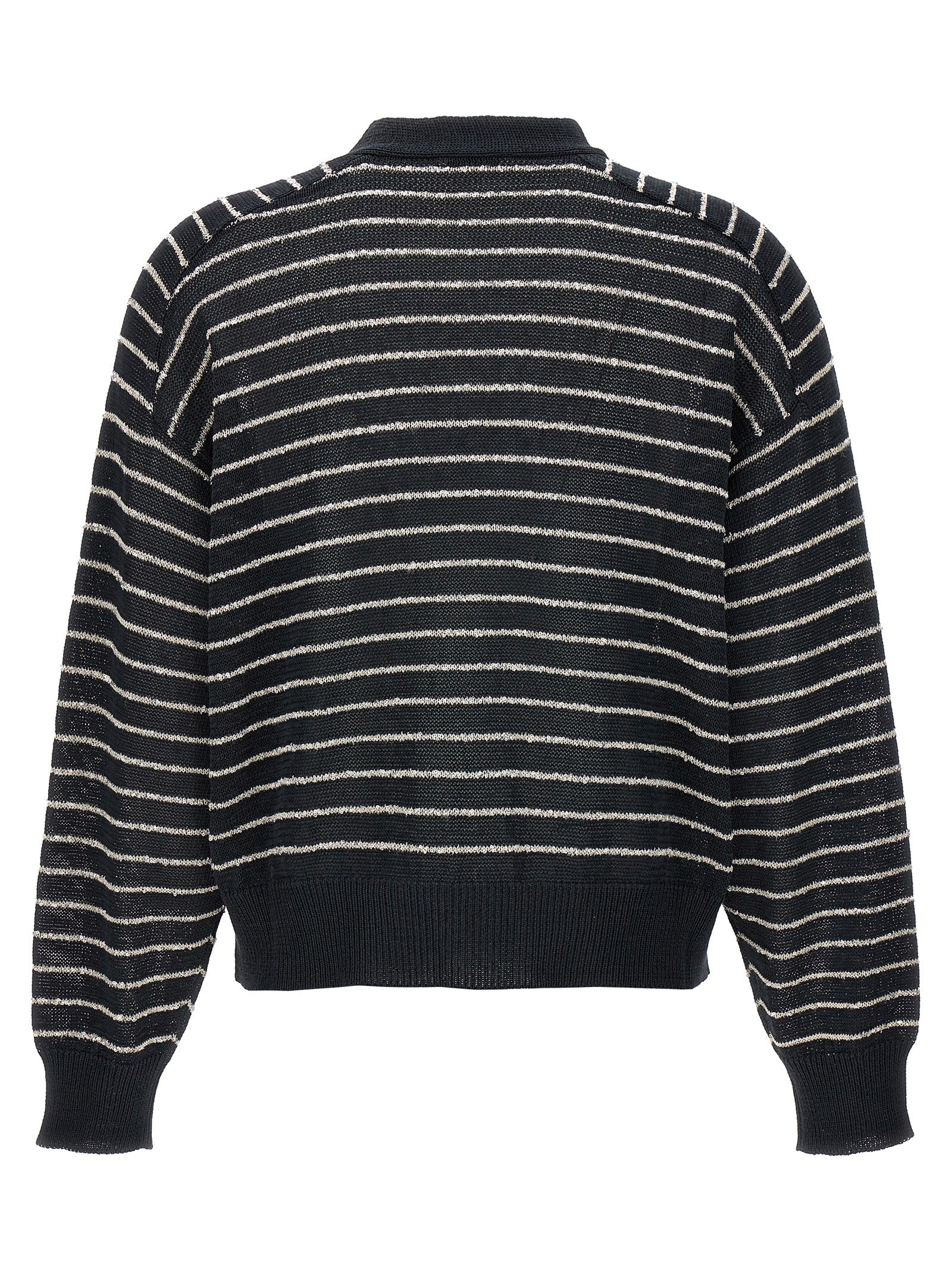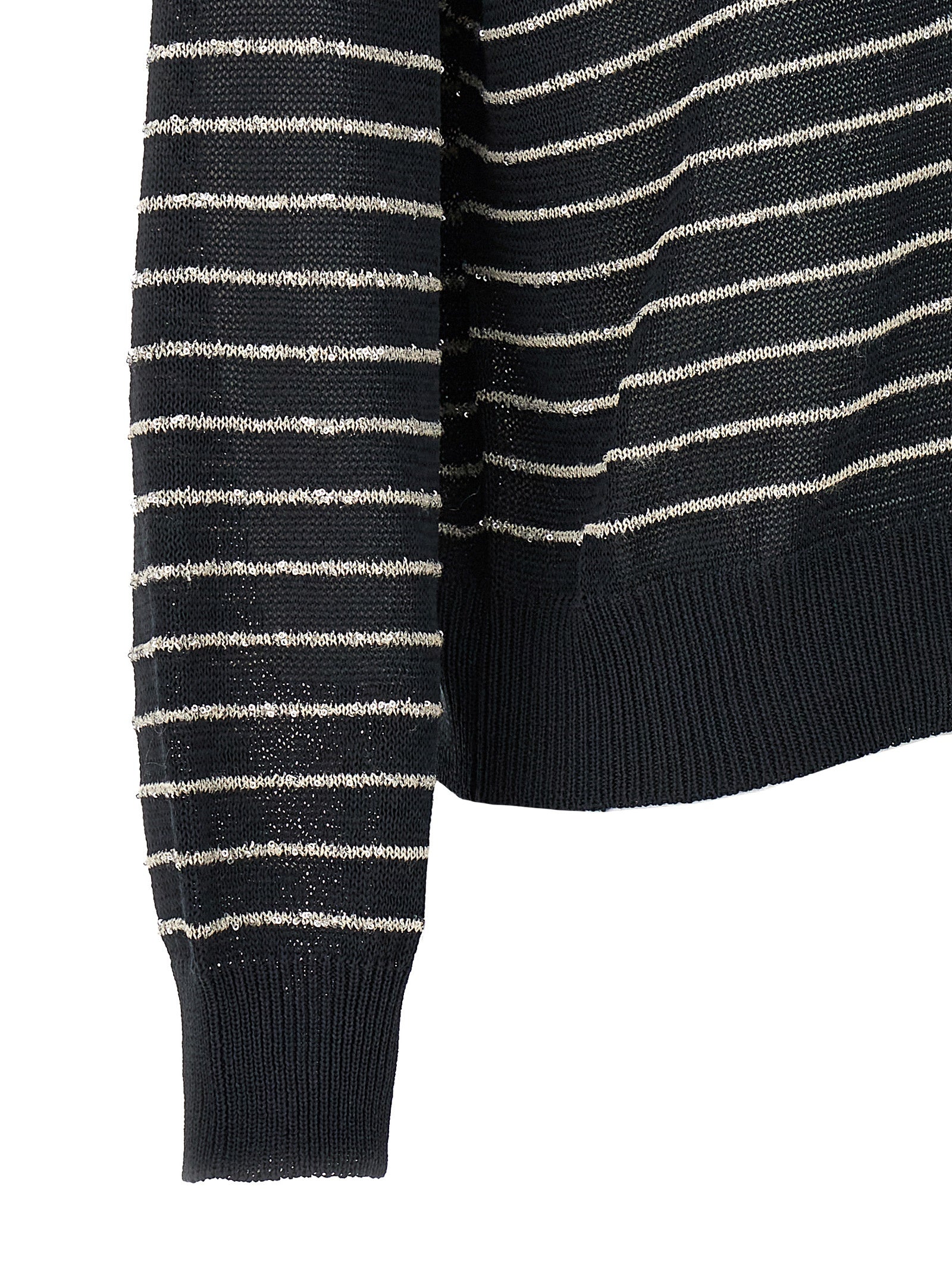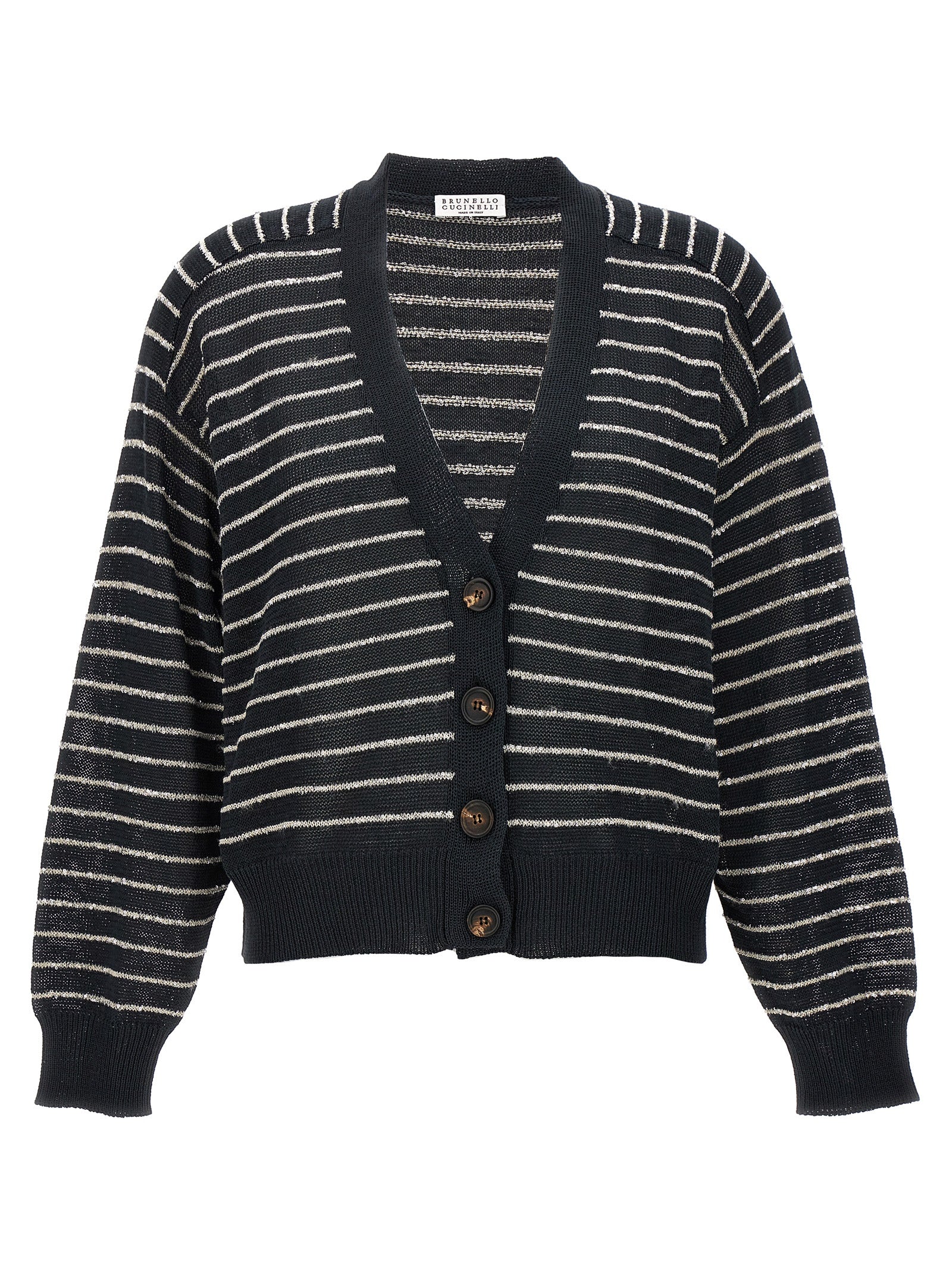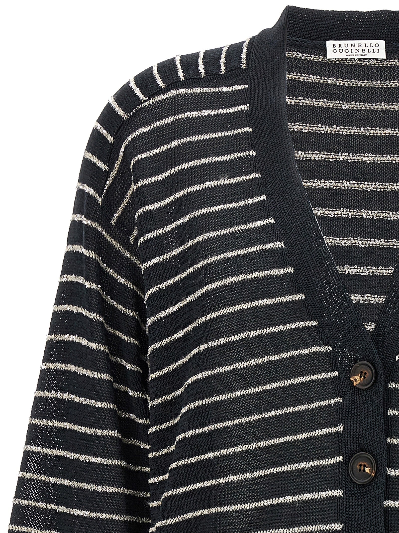 Striped cotton cardigan with all-over sequin appliqué, button closure, long cuffed sleeves.
