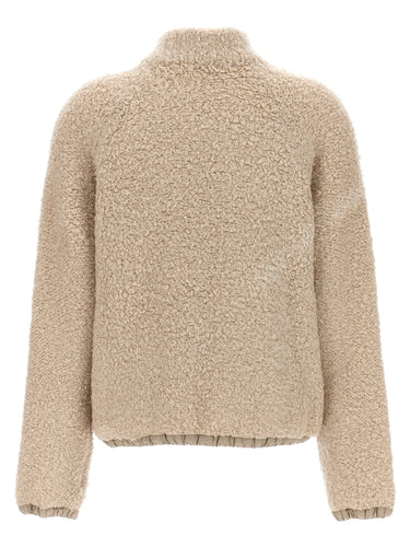 Teddy fabric cardigan, nylon and Monile inserts, zip closure, pockets, long sleeves with elastic cuffs.
