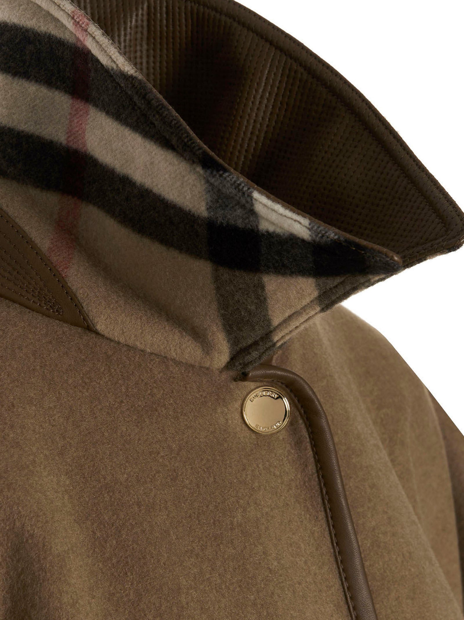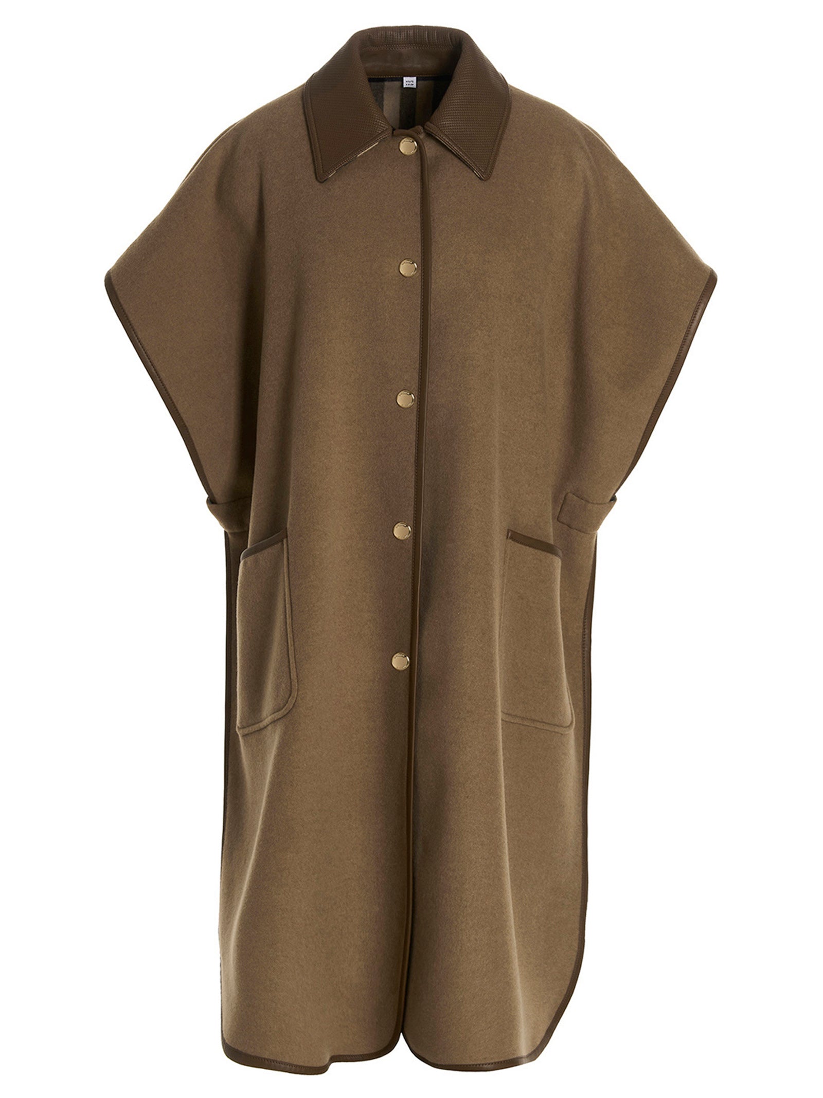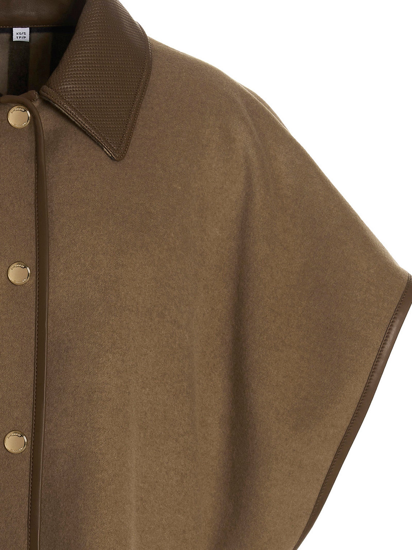 Reversible cape with tartan pattern in wool with leather finishing and a snap button closure.