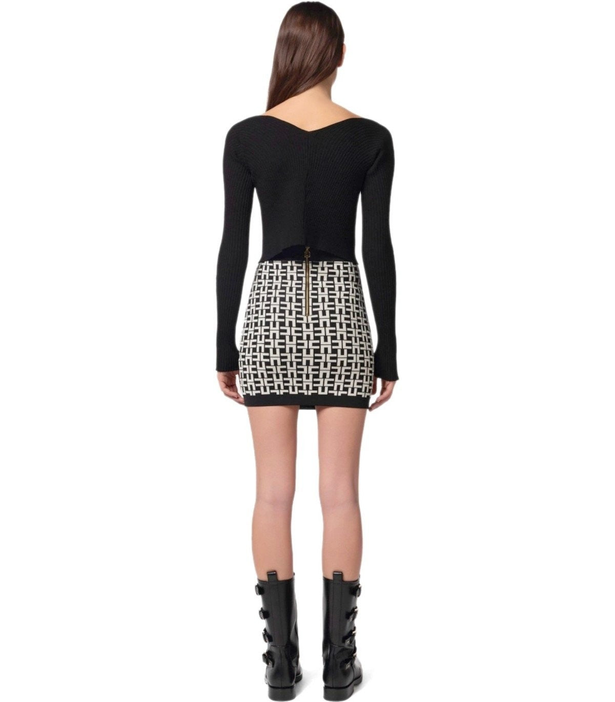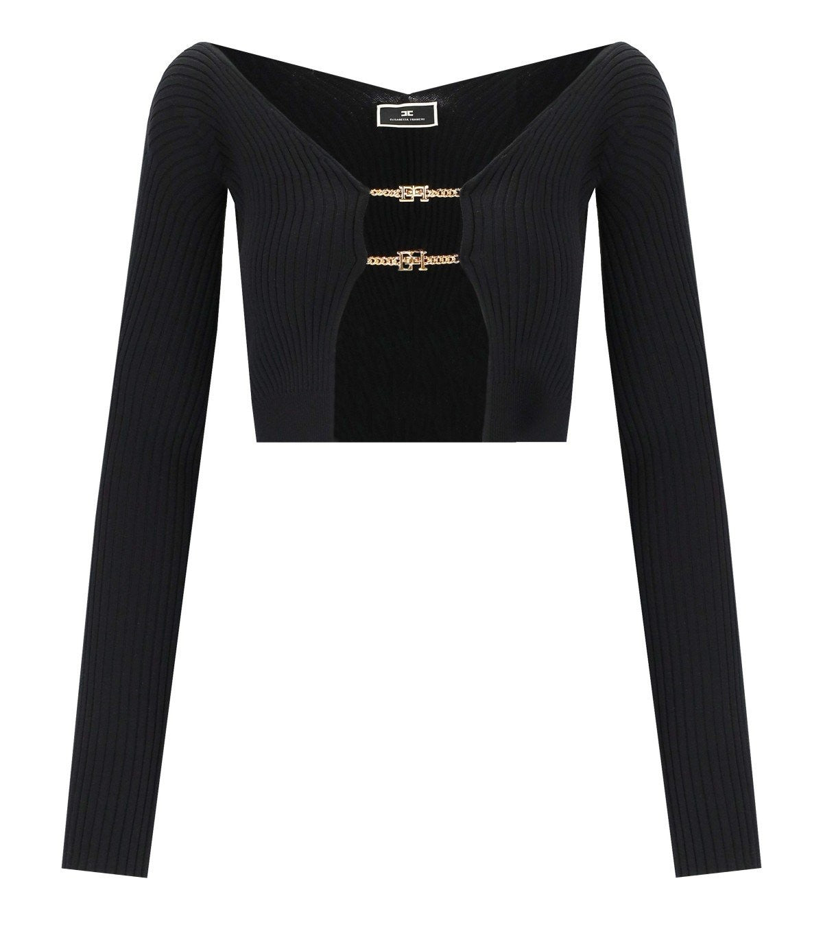 Elisabetta Franchi cardigan is made of ribbed viscose blend in black tones, featuring a wide neckline with a golden logo detail. It has a fitted fit. The model is 177 cm tall and wears size 40 IT. Composition: 59% viscose, 23% polyester, 15% polyamide, 3% elastane.