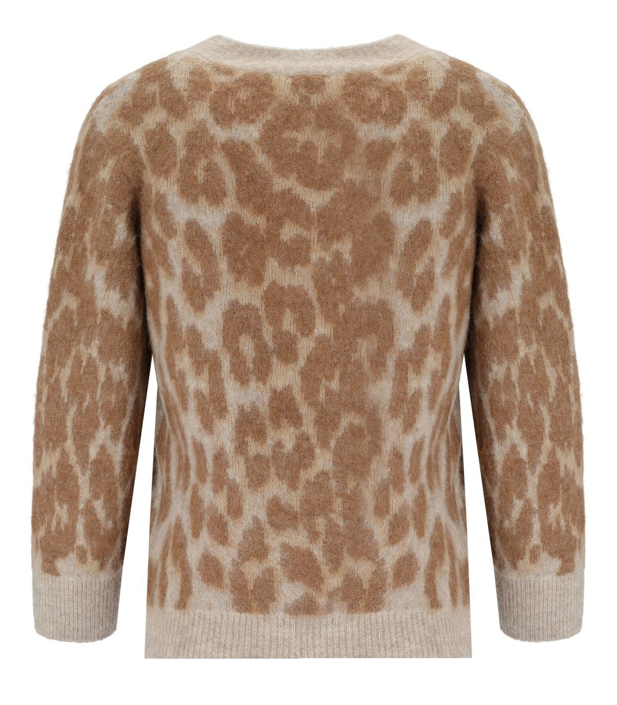 Ganni cardigan made from alpaca blend with animal print, in shades of beige and brown. Ribbed edges with embroidered logo, button closure. Relaxed fit. Composition: 42% alpaca, 34% wool, 24% recycled polyamide.