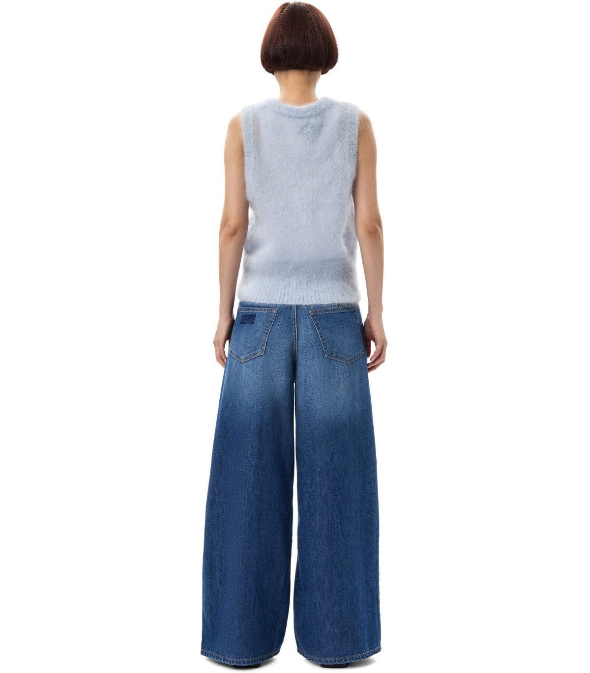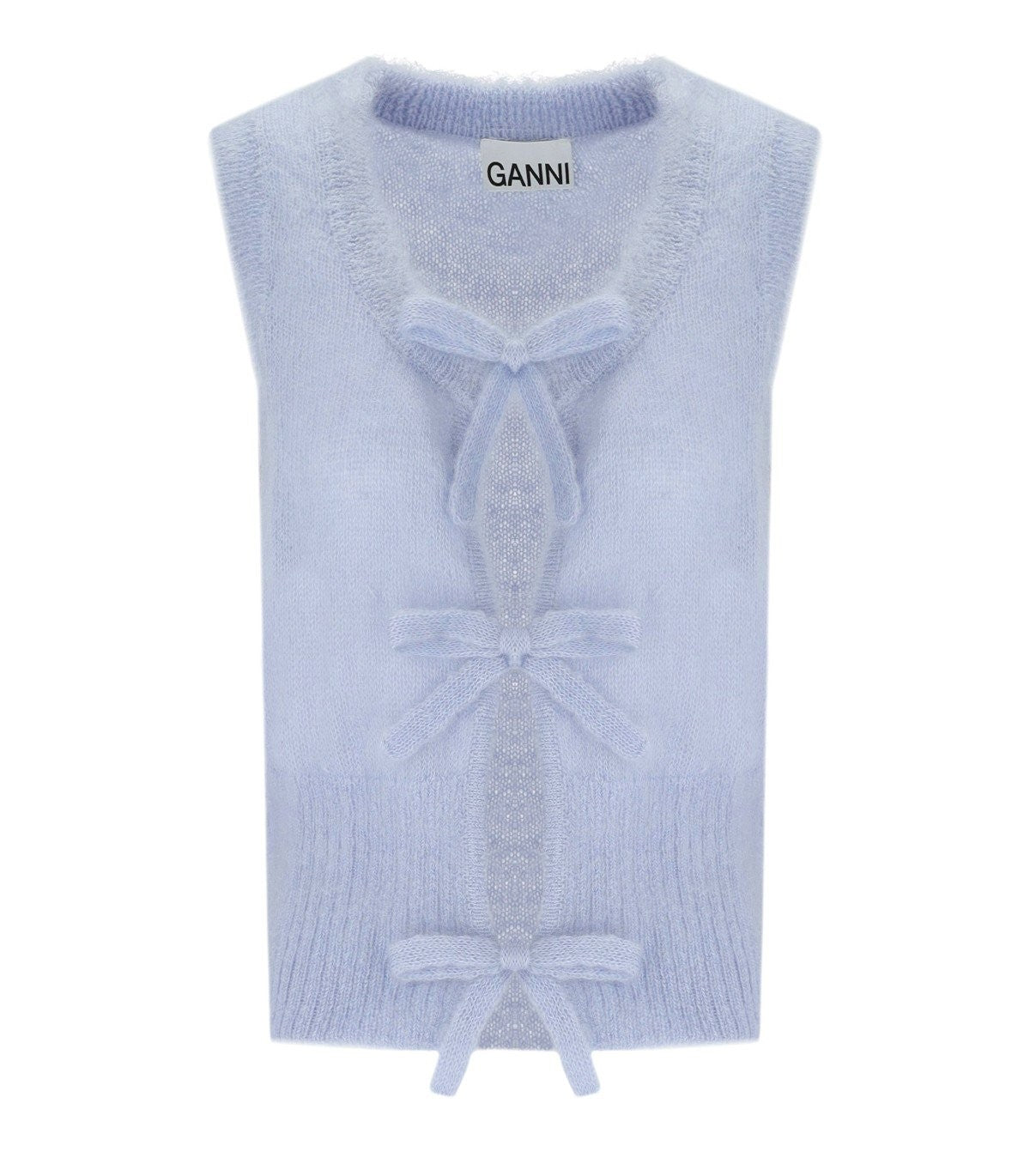Ganni sleeveless cardigan made of blue mohair blend, finished with ribbed edges. Closure with ribbon ties to be tied in a bow at the front. Regular fit. The model is 176 cm tall and wears size S. Composition: 55% mohair, 29% polyamide, 16% merino.