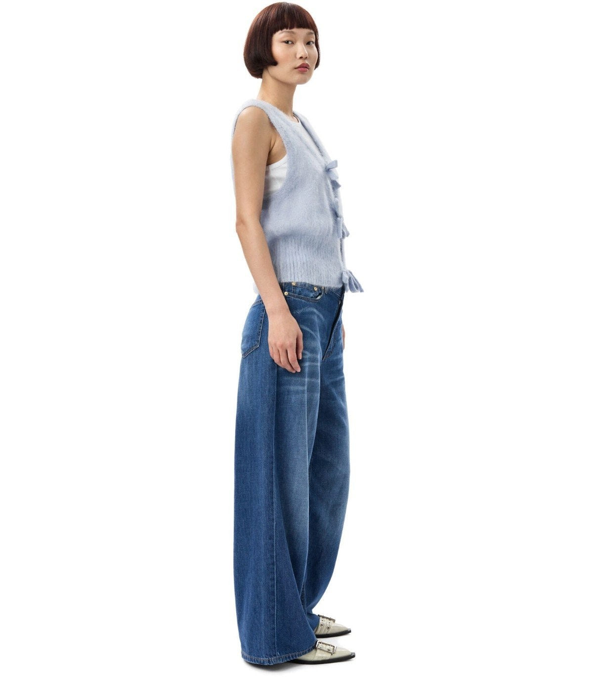 Ganni Heather Blue Sleeveless Cardigan With Bows