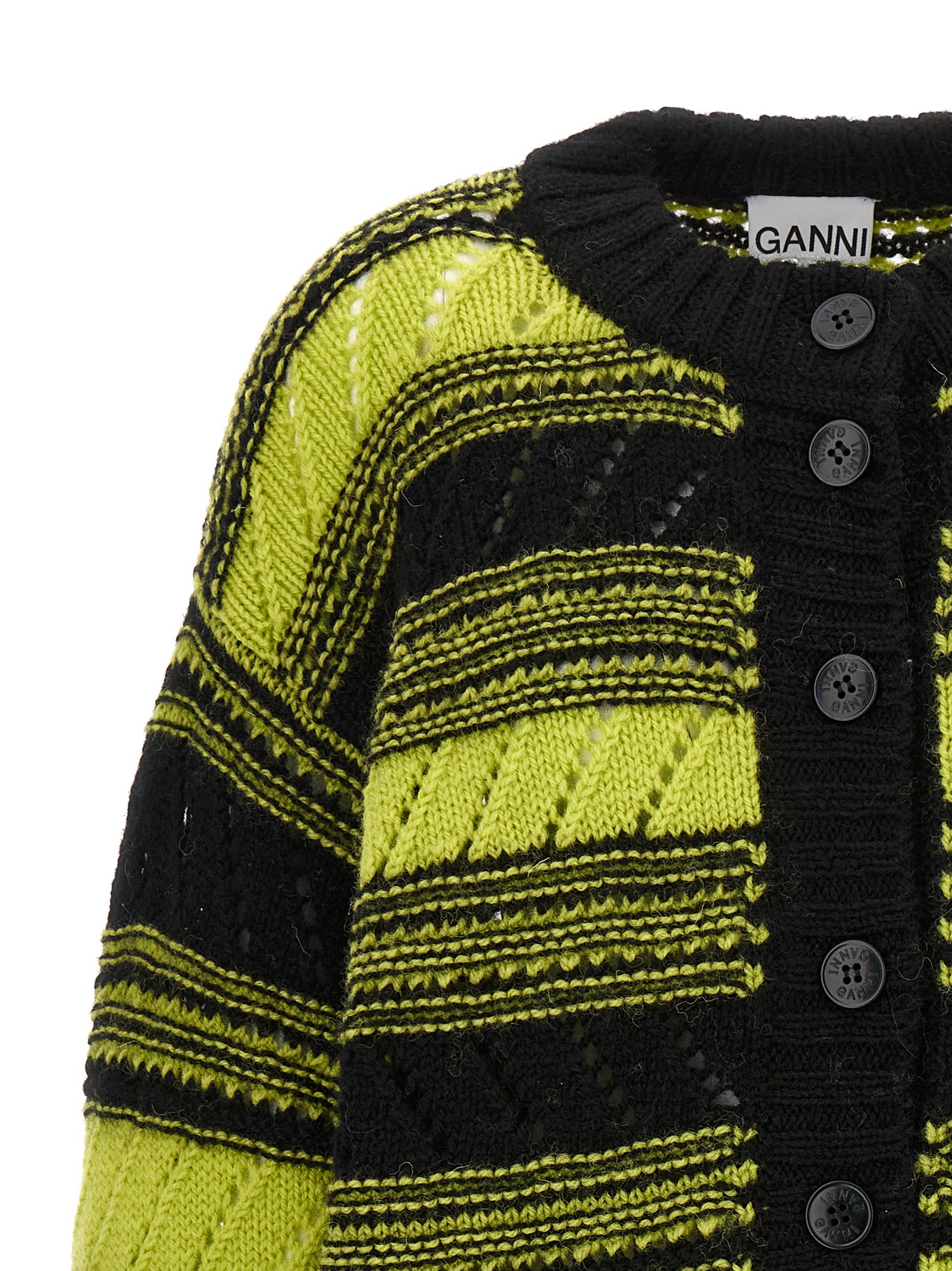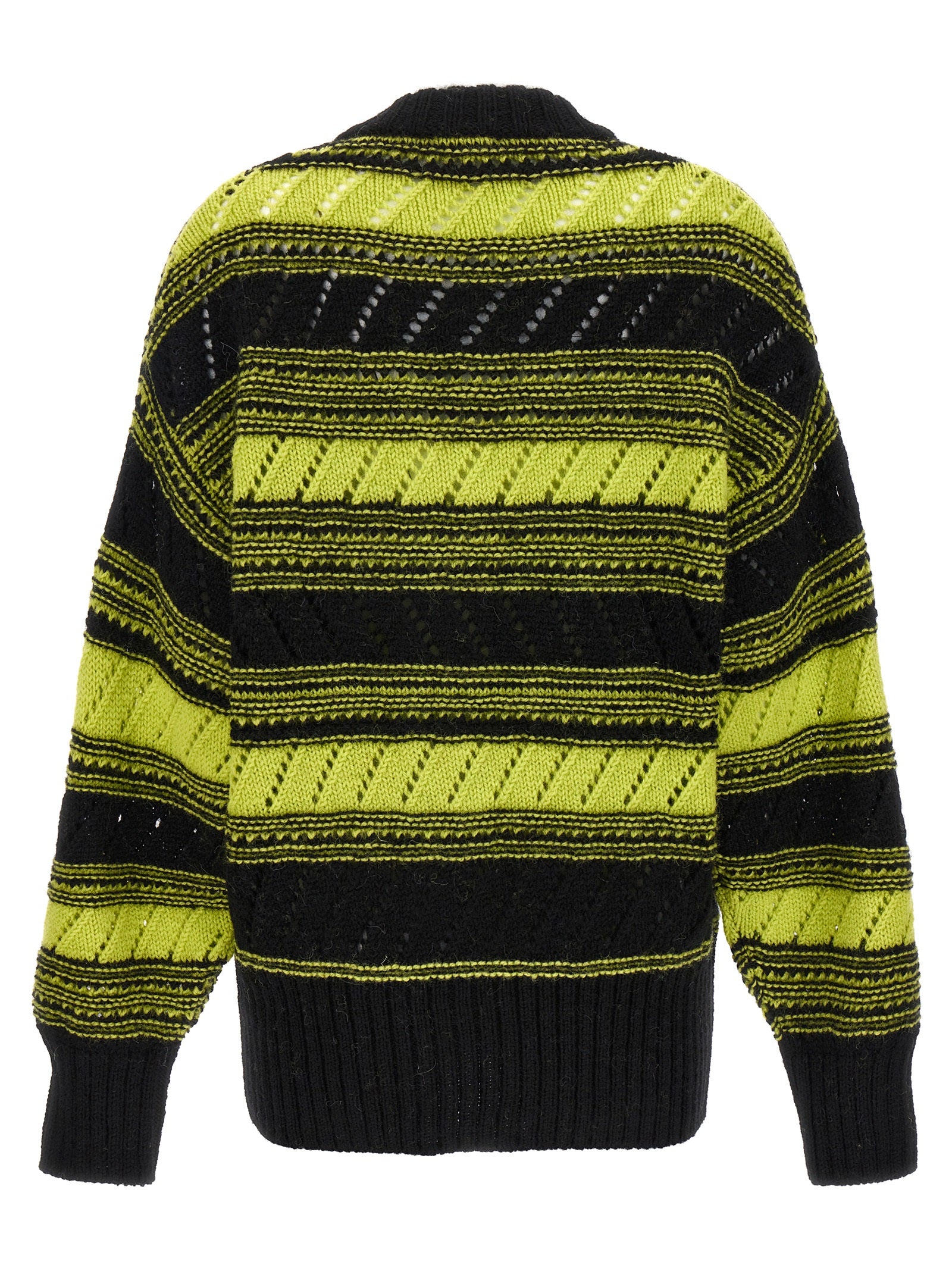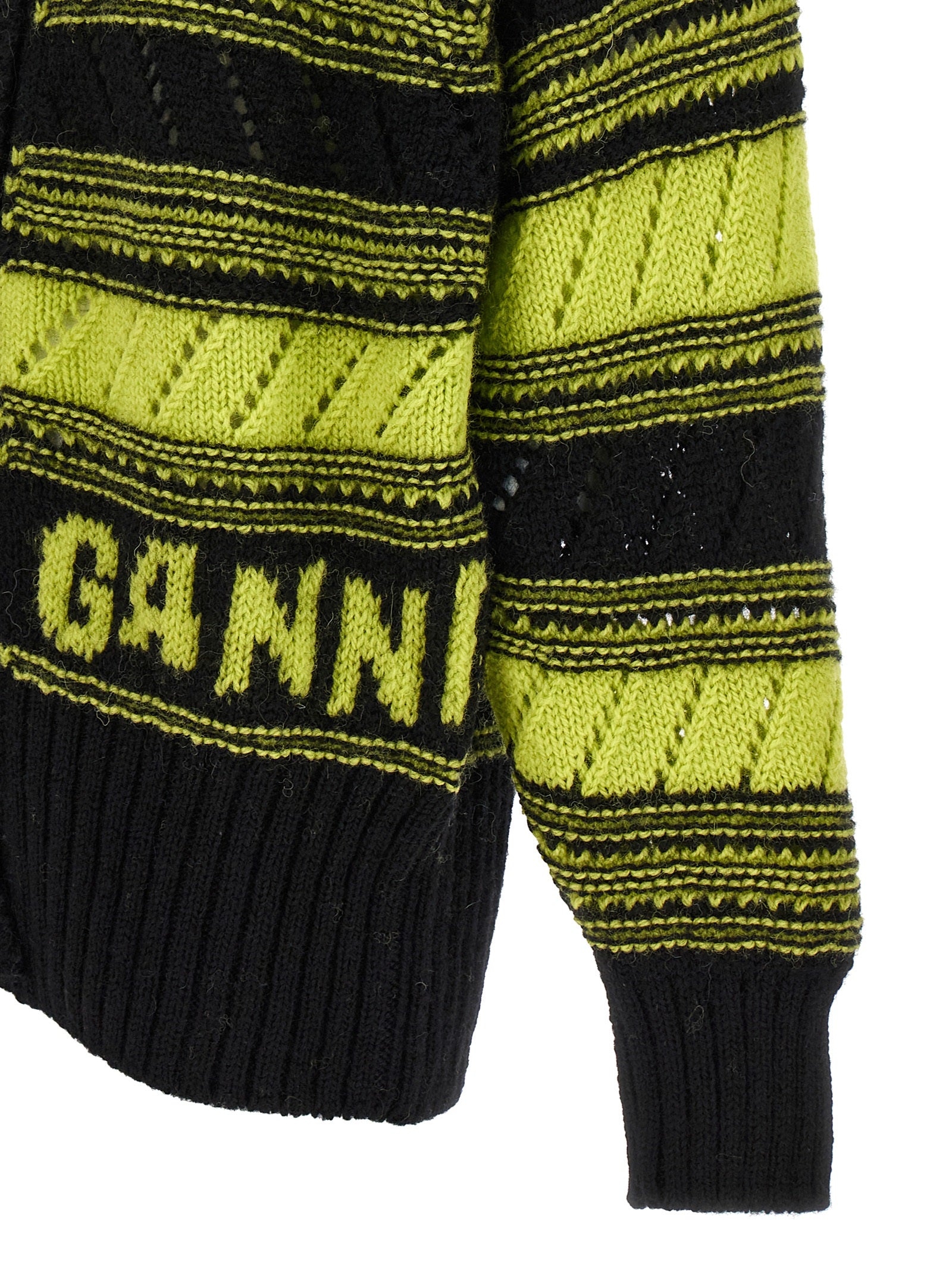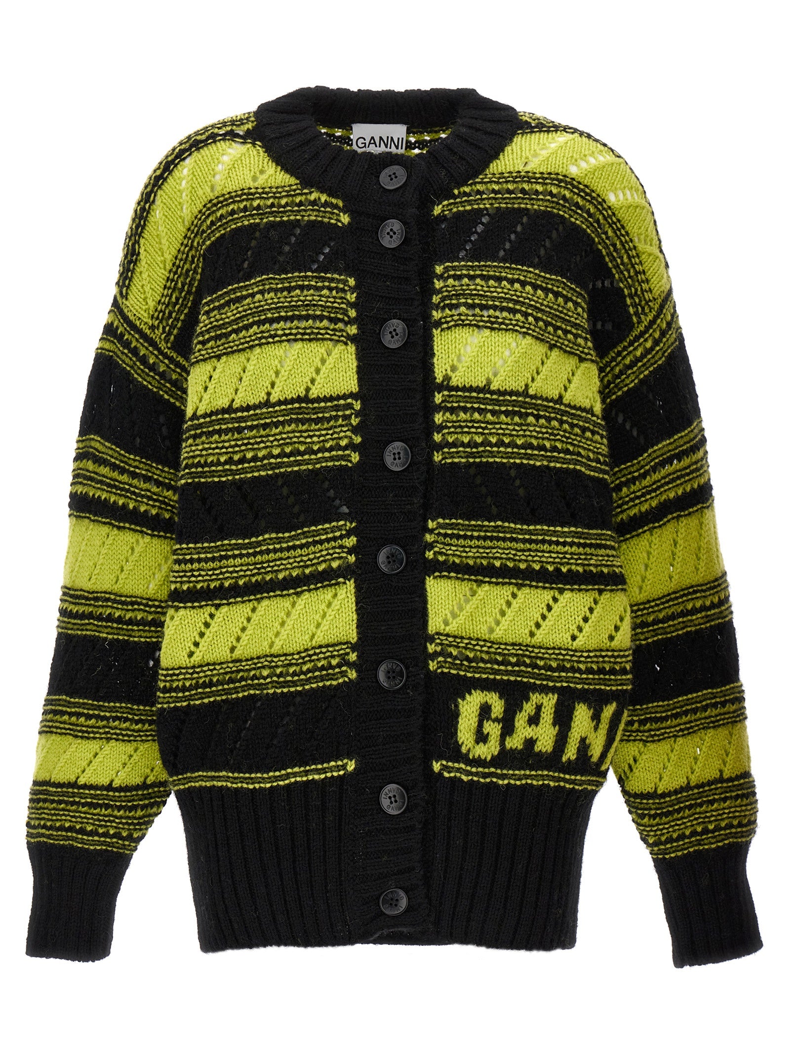 Wool cardigan with striped pattern and logo, crew neck, button closure, pockets, long sleeves.