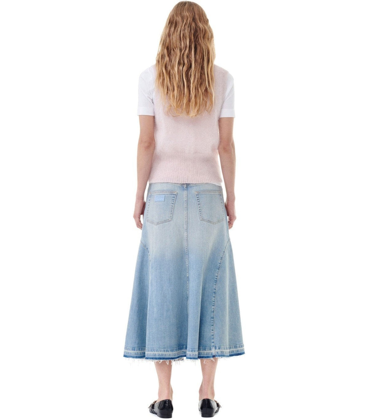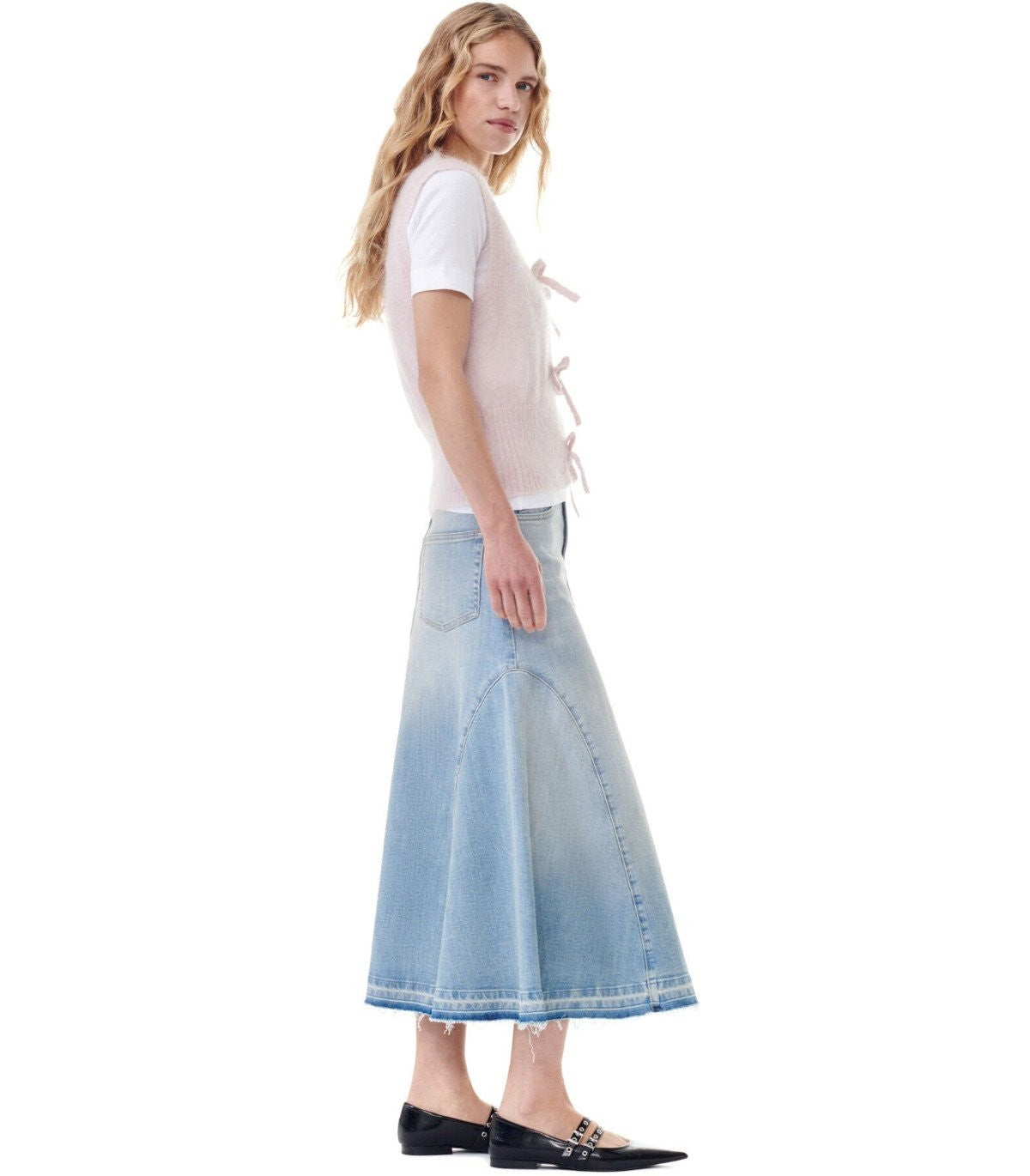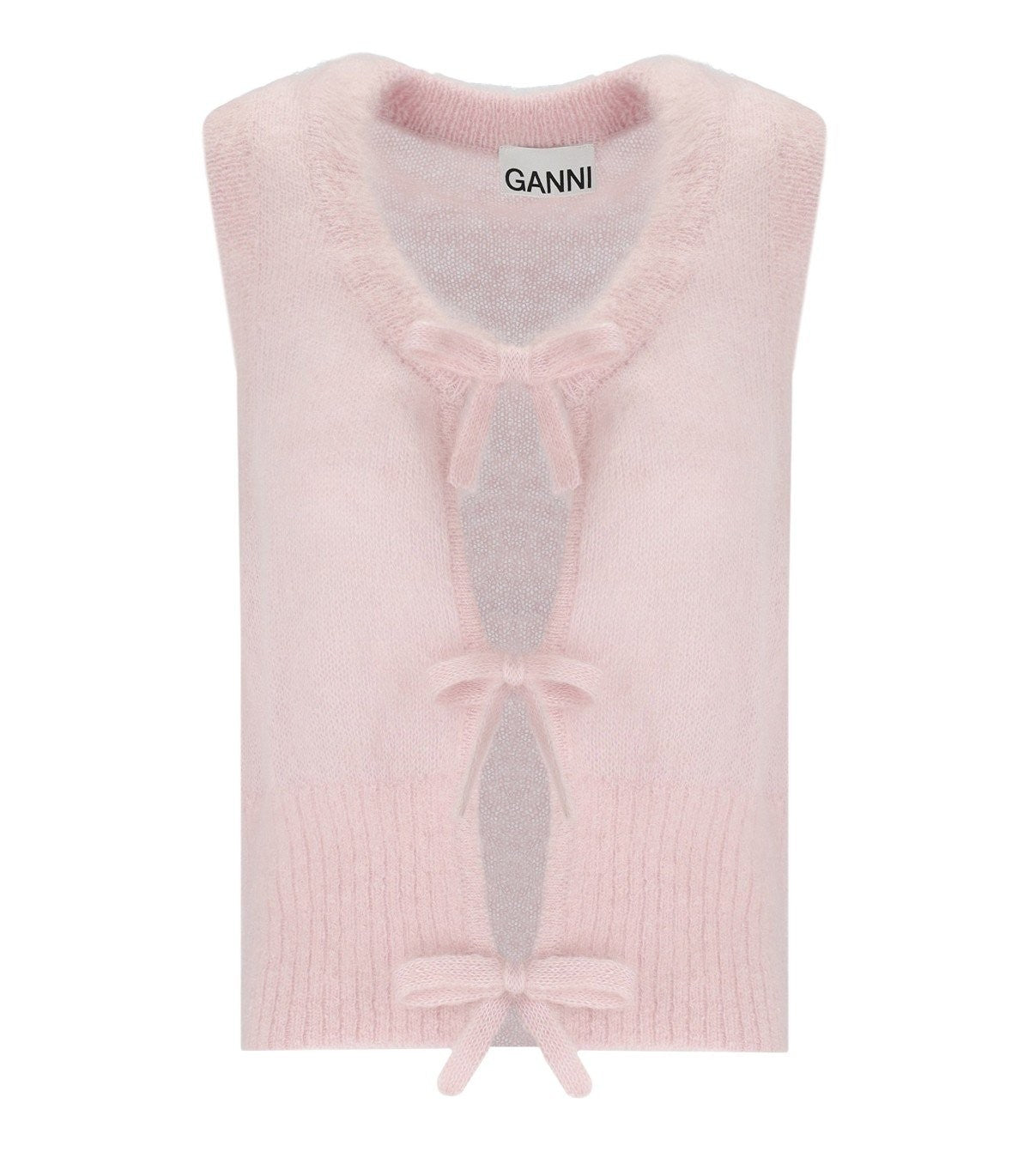 Sleeveless cardigan from Ganni made of a blend of mohair and merino wool in pink tones, featuring a front closure with three tie bows. Ribbed trim on the edges. Regular fit. The model is 177 cm tall and is wearing size S. Composition: 55% mohair, 29% polyamide, 16% merino wool.