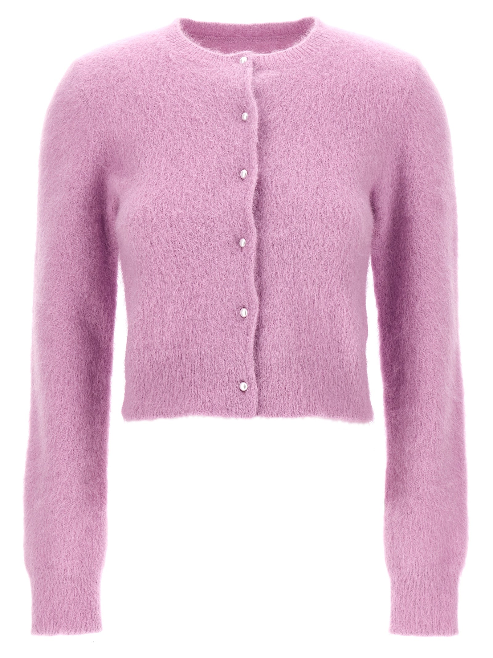 Angora blend cardigan with pearl button closure, crew neck, long cuffed sleeves.