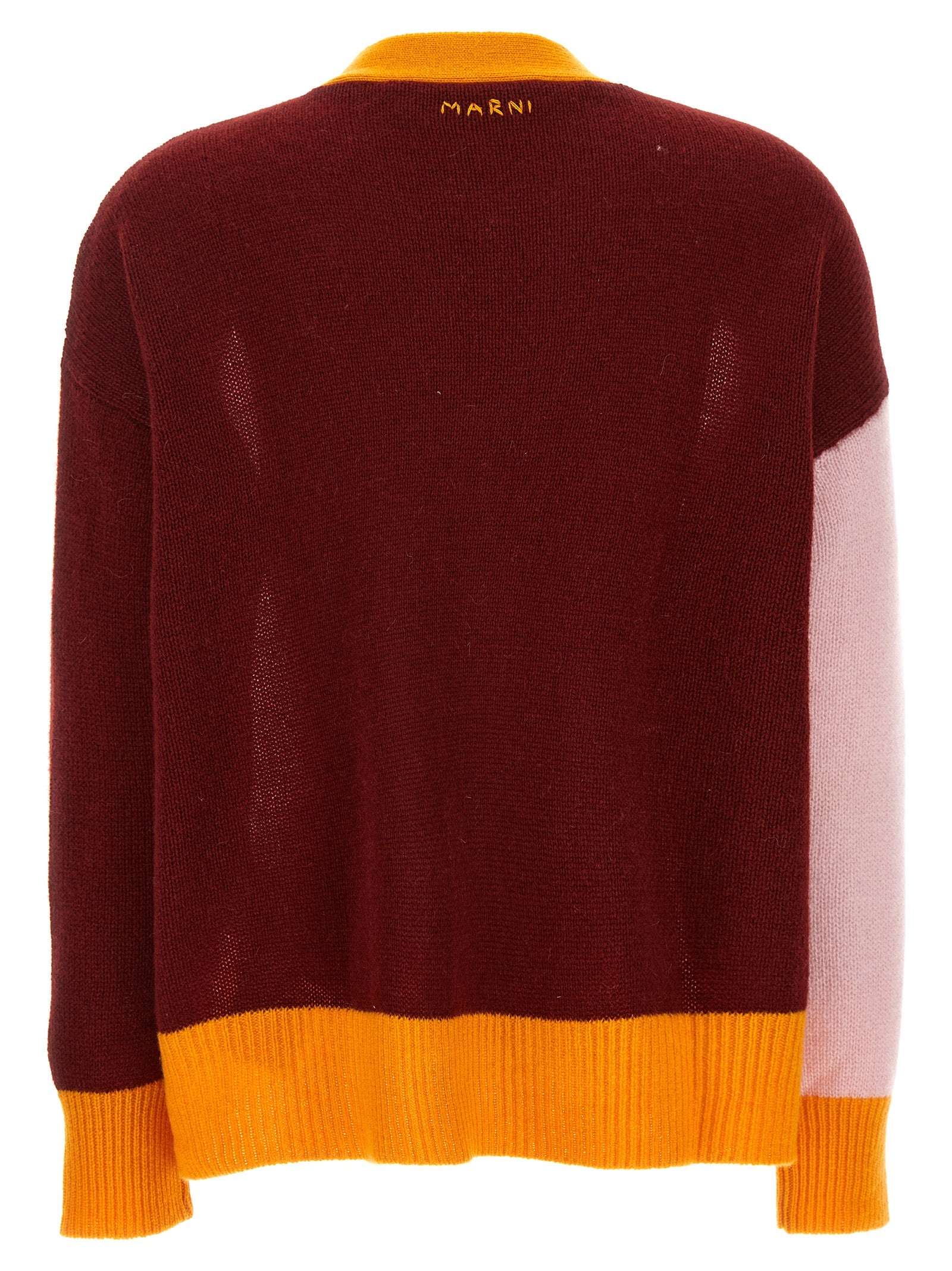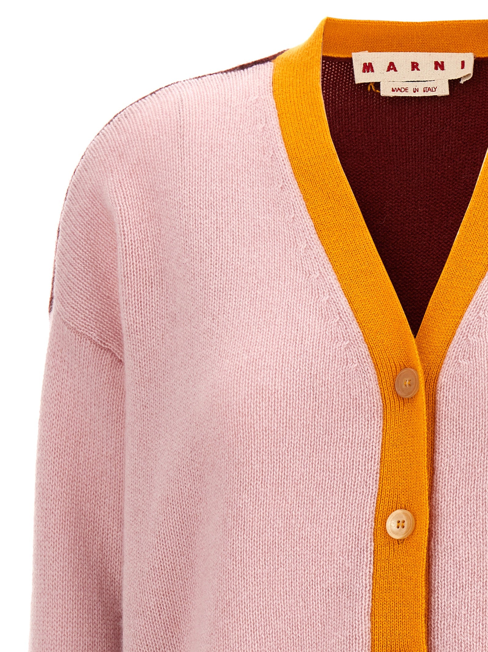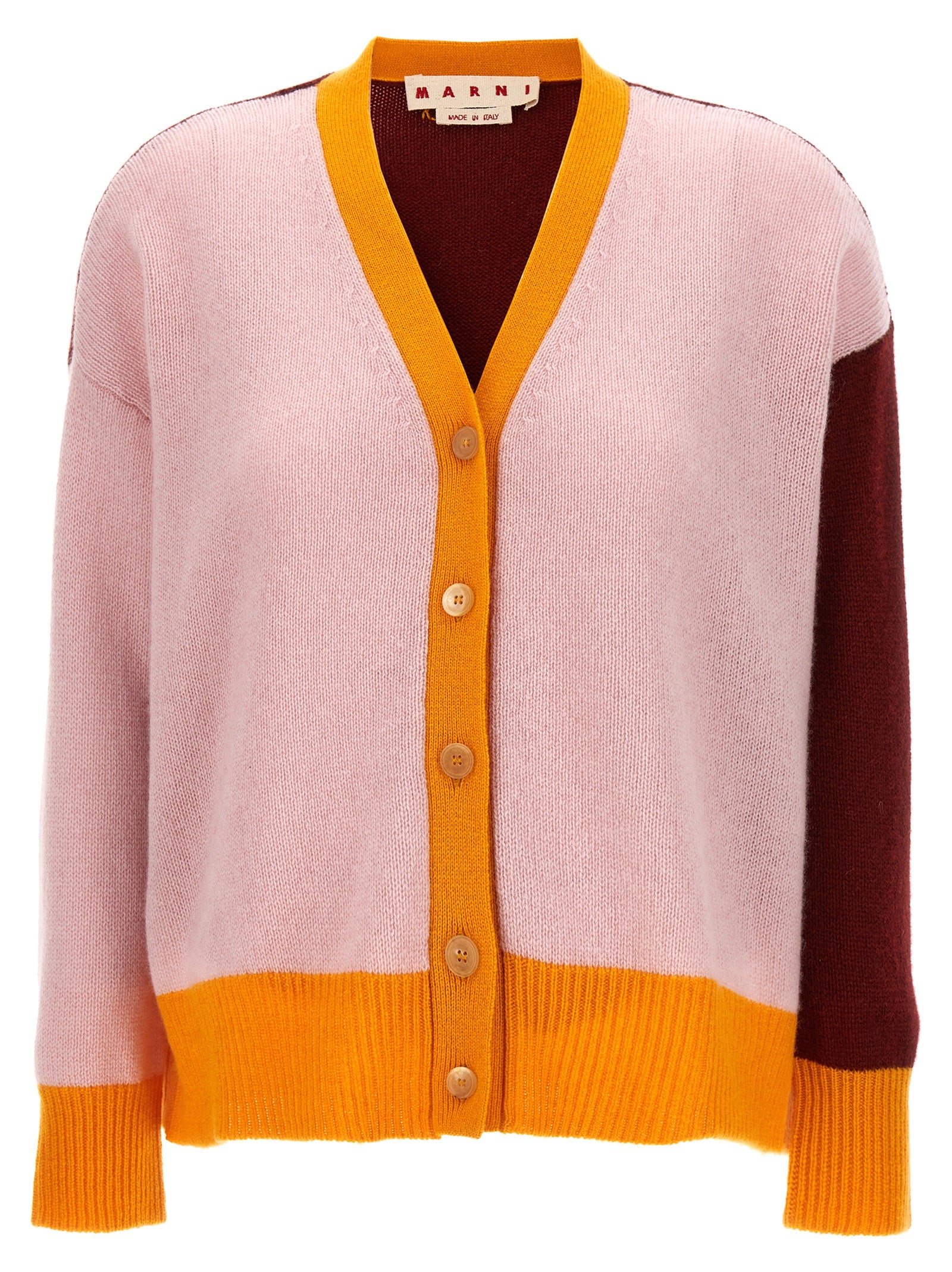 Colorblock cashmere cardigan with button closure, long cuffed sleeves.