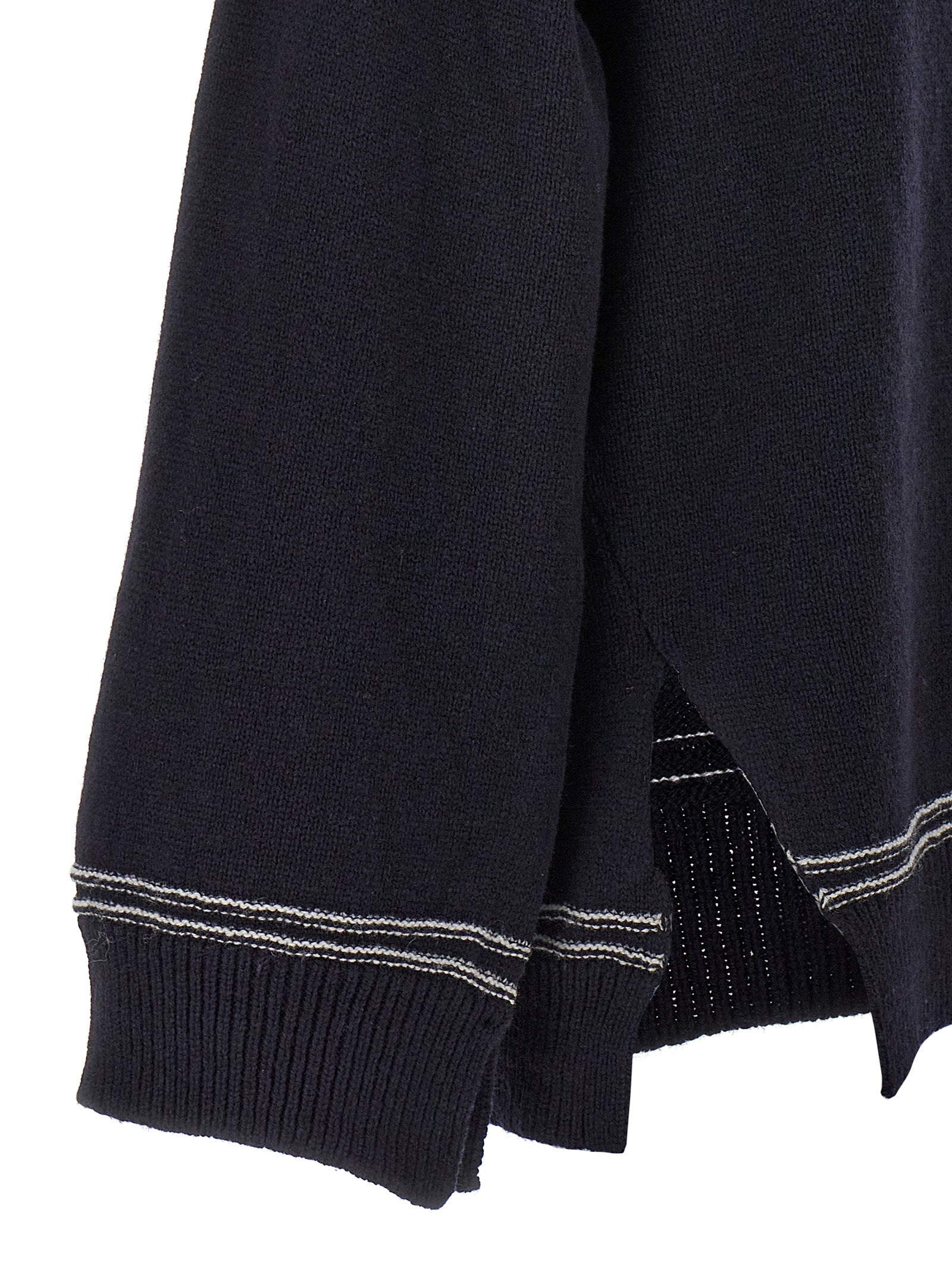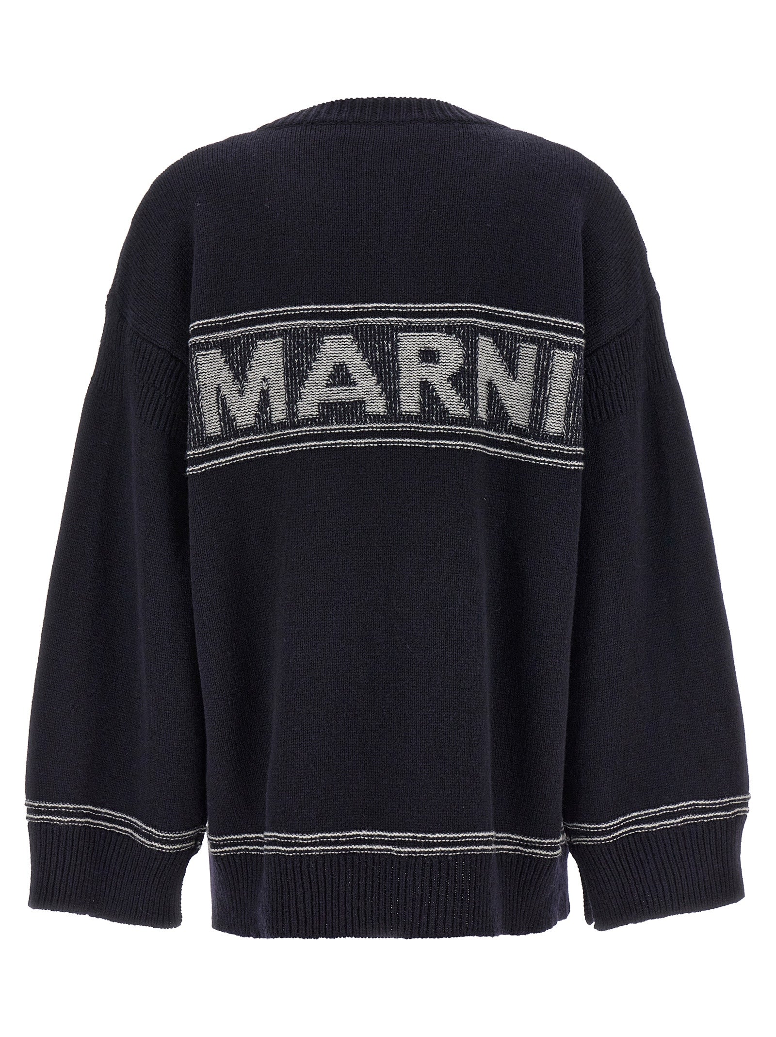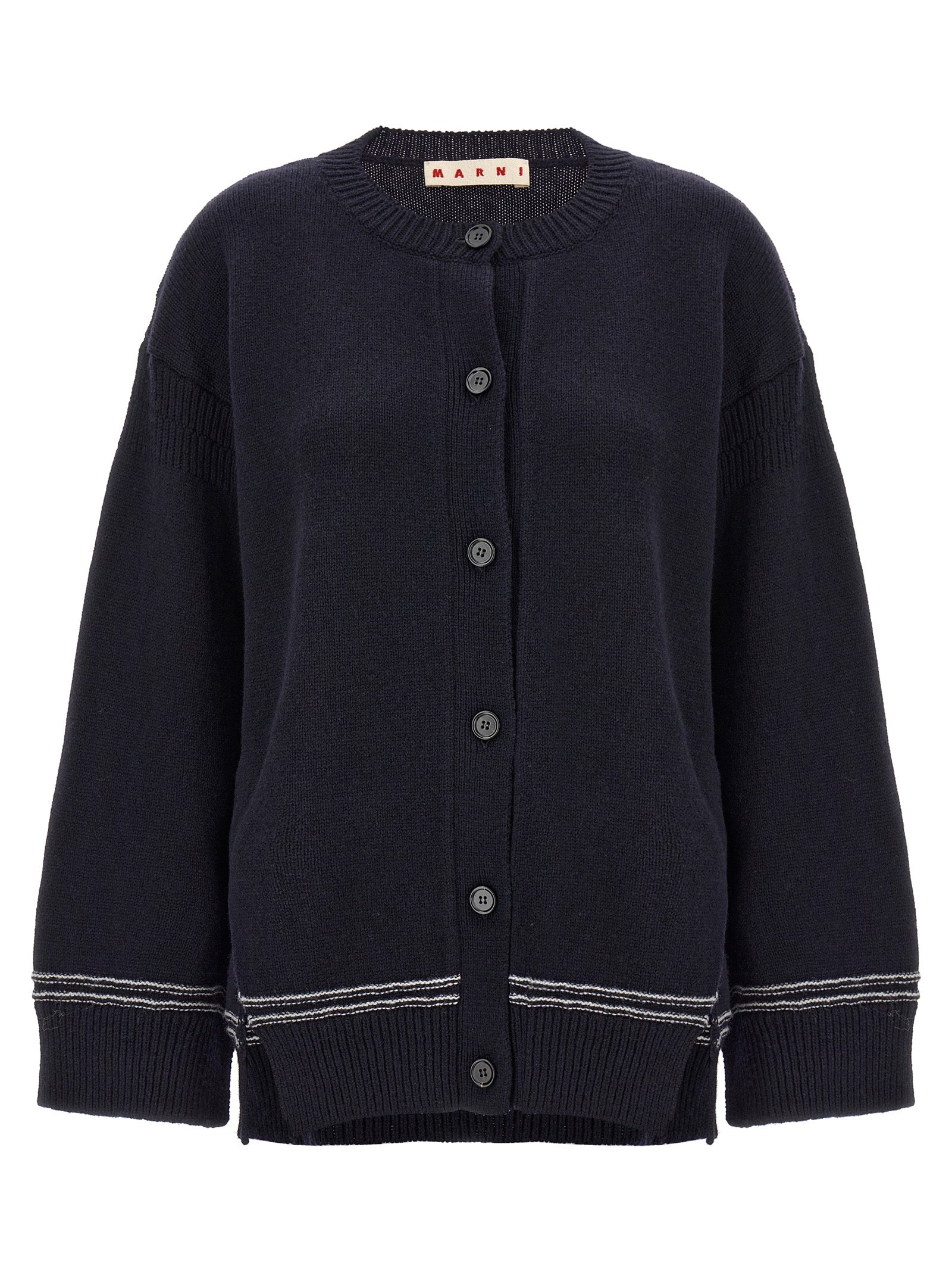 Wool cardigan, crew neck, front button closure, back intarsia with contrasting logo, side splits, long sleeves with cuffs and contrast stitching.