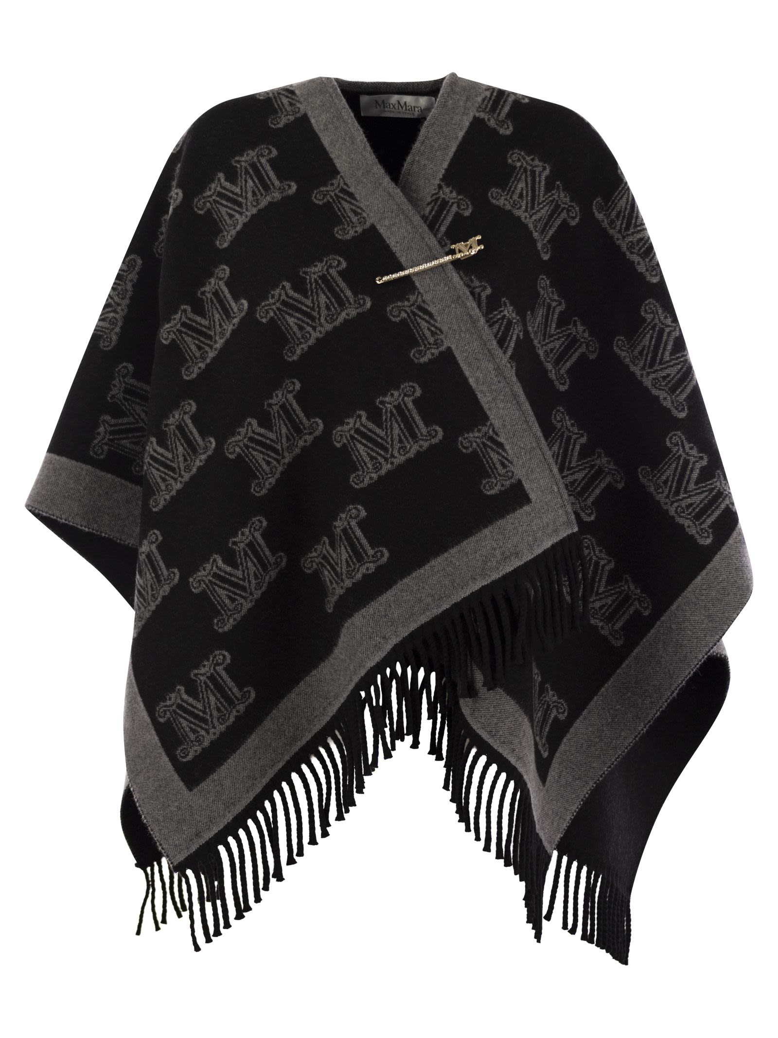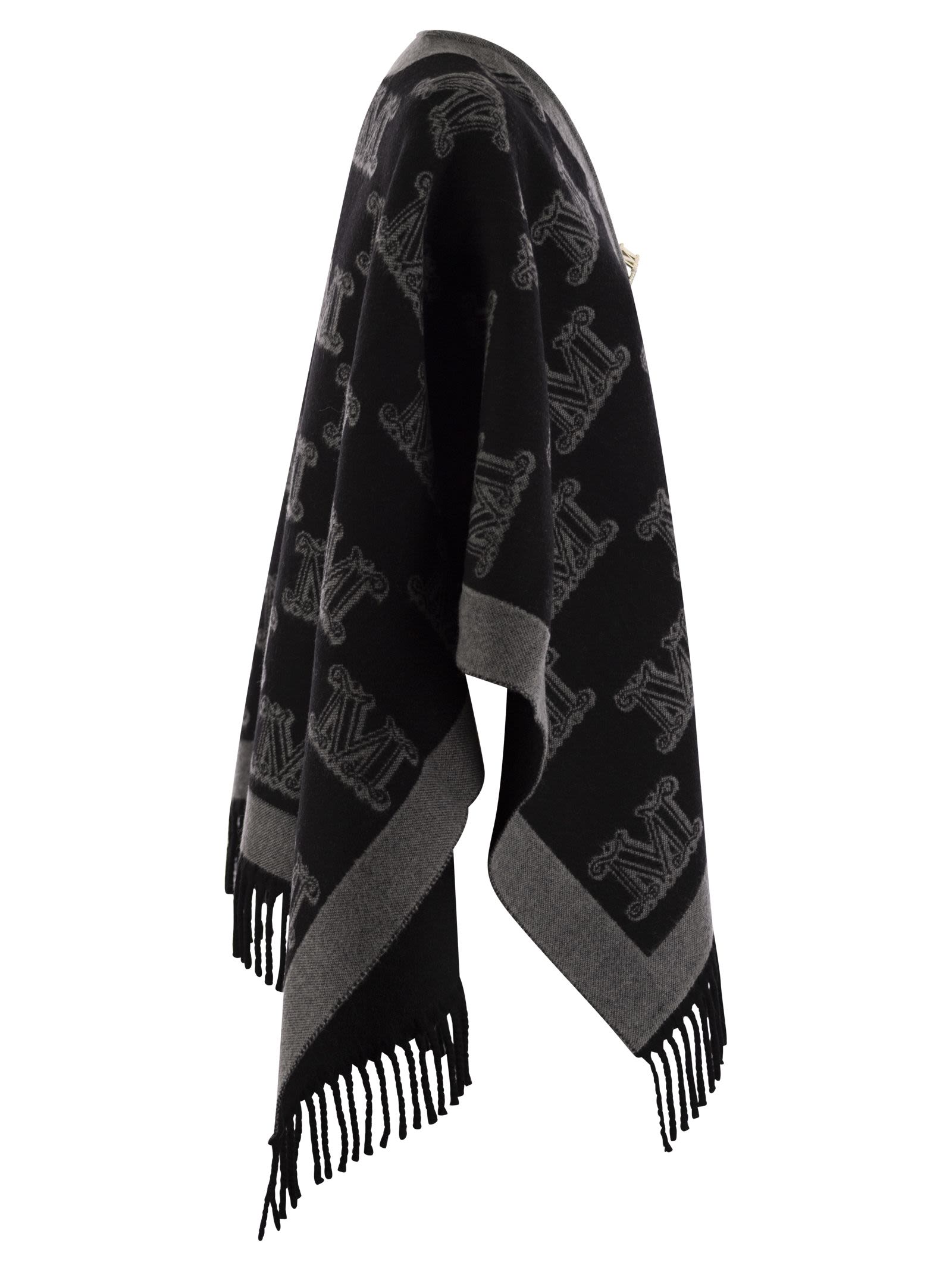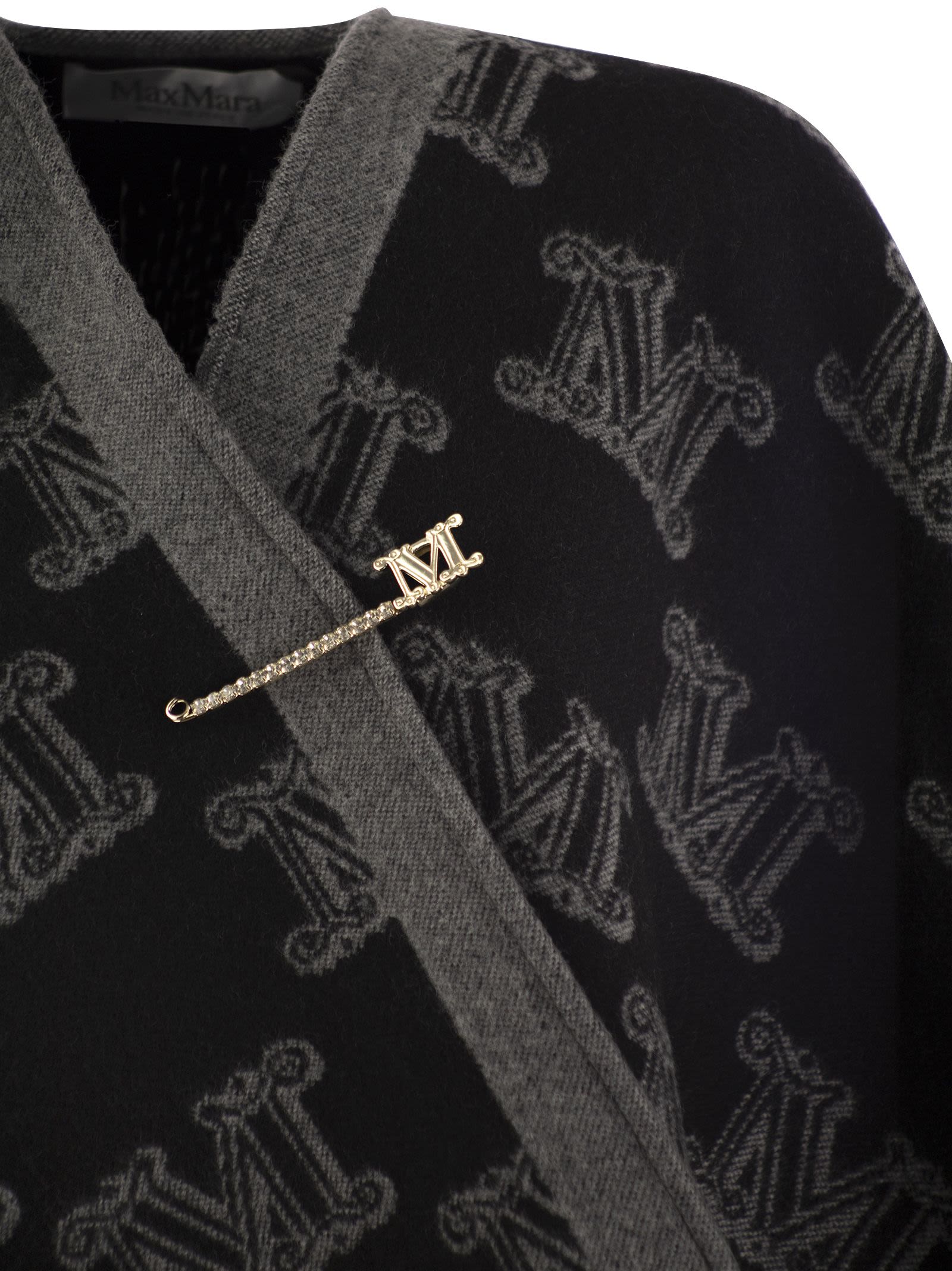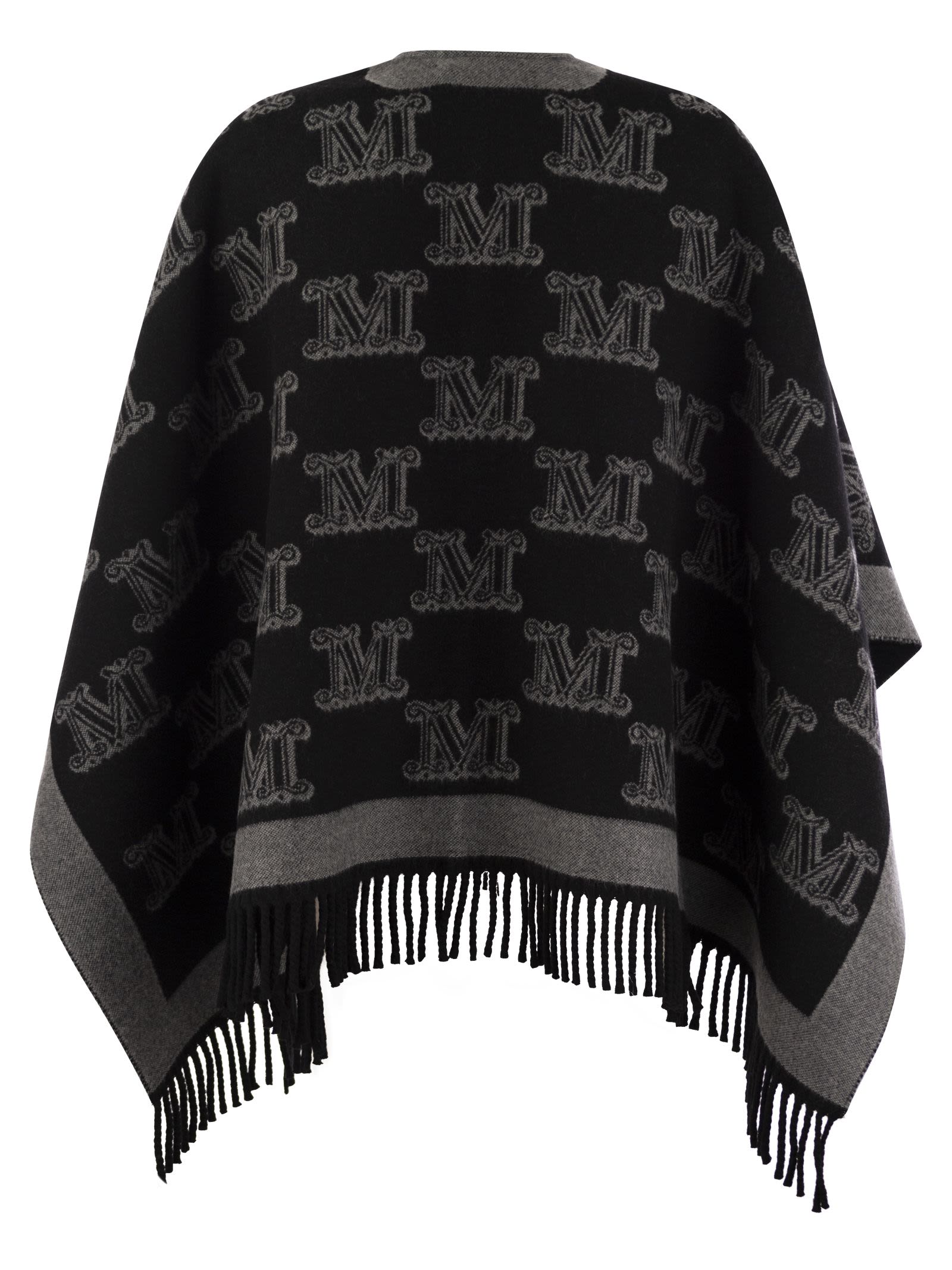 A cape in fine yarn-dyed pure wool yarn. Soft and snug, it is finished with Max Mara jacquard lettering, a fringed pattern on the hem and a brooch with diamonds. - Fringes on the edges - Lettering - Brooch DESIGNER ID: 2424736091600 008