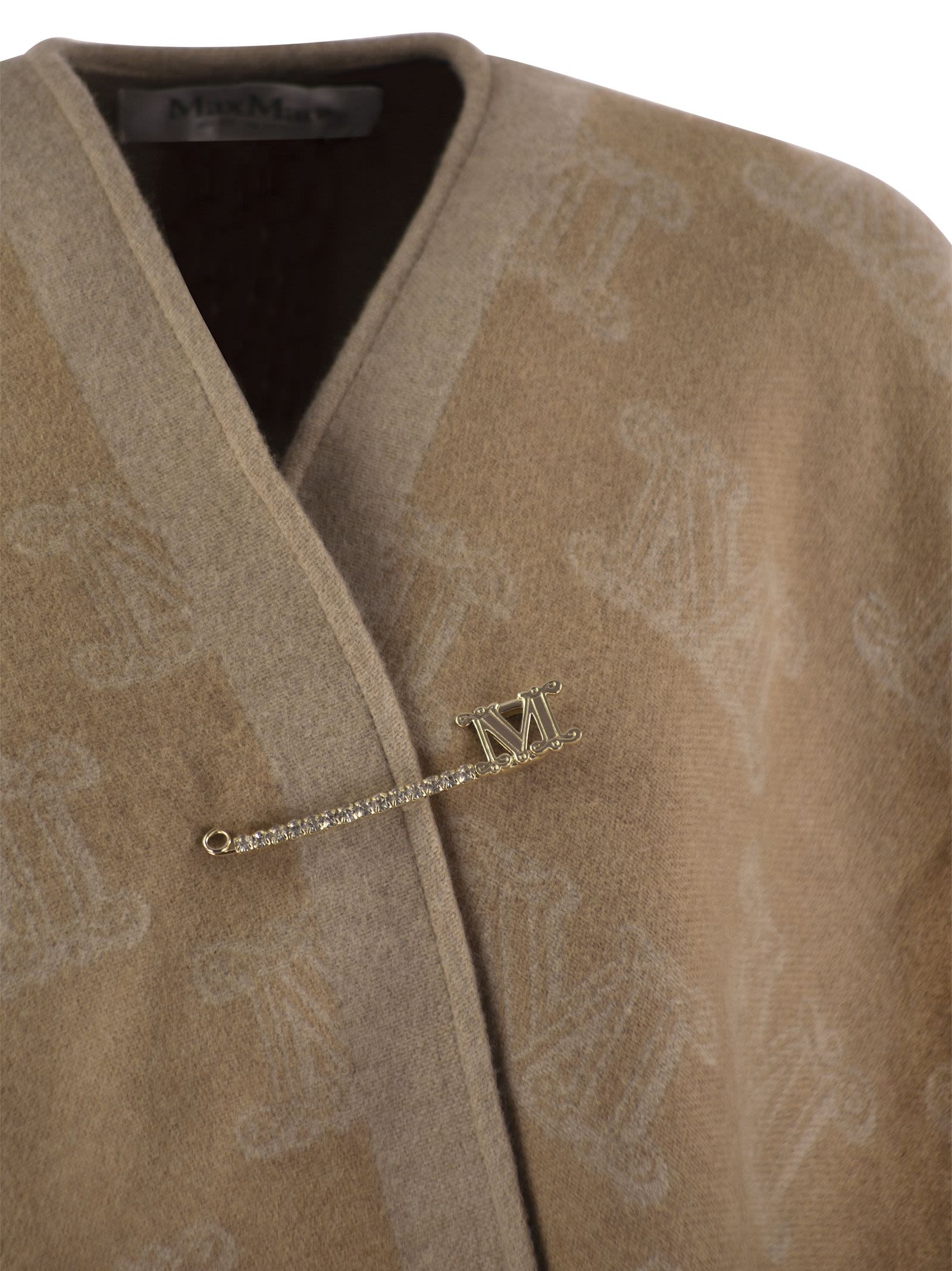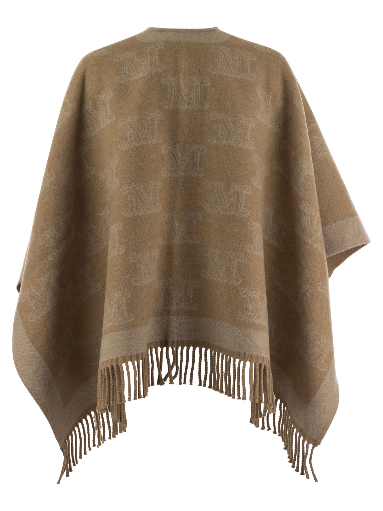 A cape in fine yarn-dyed pure wool yarn. Soft and snug, it is finished with Max Mara jacquard lettering, a fringed pattern on the hem and a brooch with diamonds. - Fringes on the edges - Lettering - Brooch DESIGNER ID: 2424736091600 007
