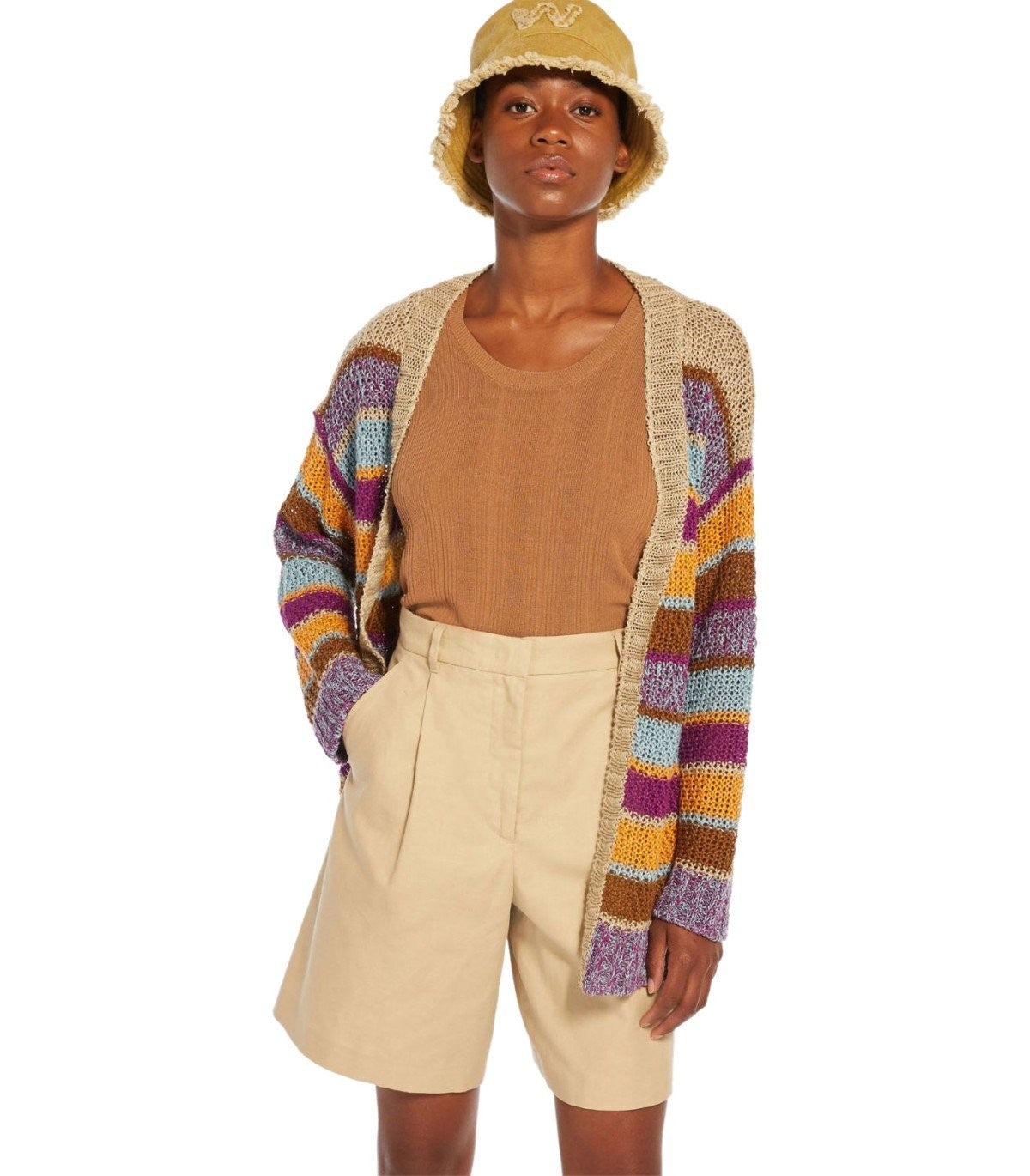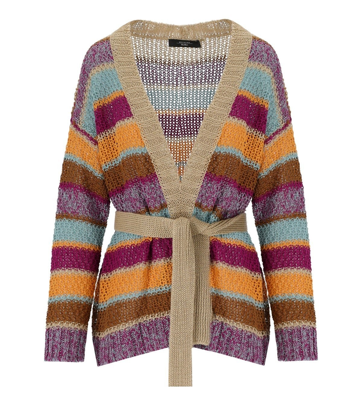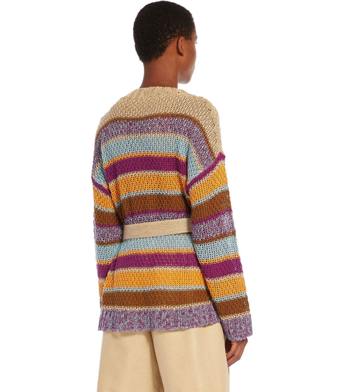 Kabala cardigan by Max Mara Weekend made of linen yarn, with a multicolor horizontal stripe pattern. Matching belt at the waist, soft fit. The model is 178 cm tall and wears size M. Composition: 100% linen.