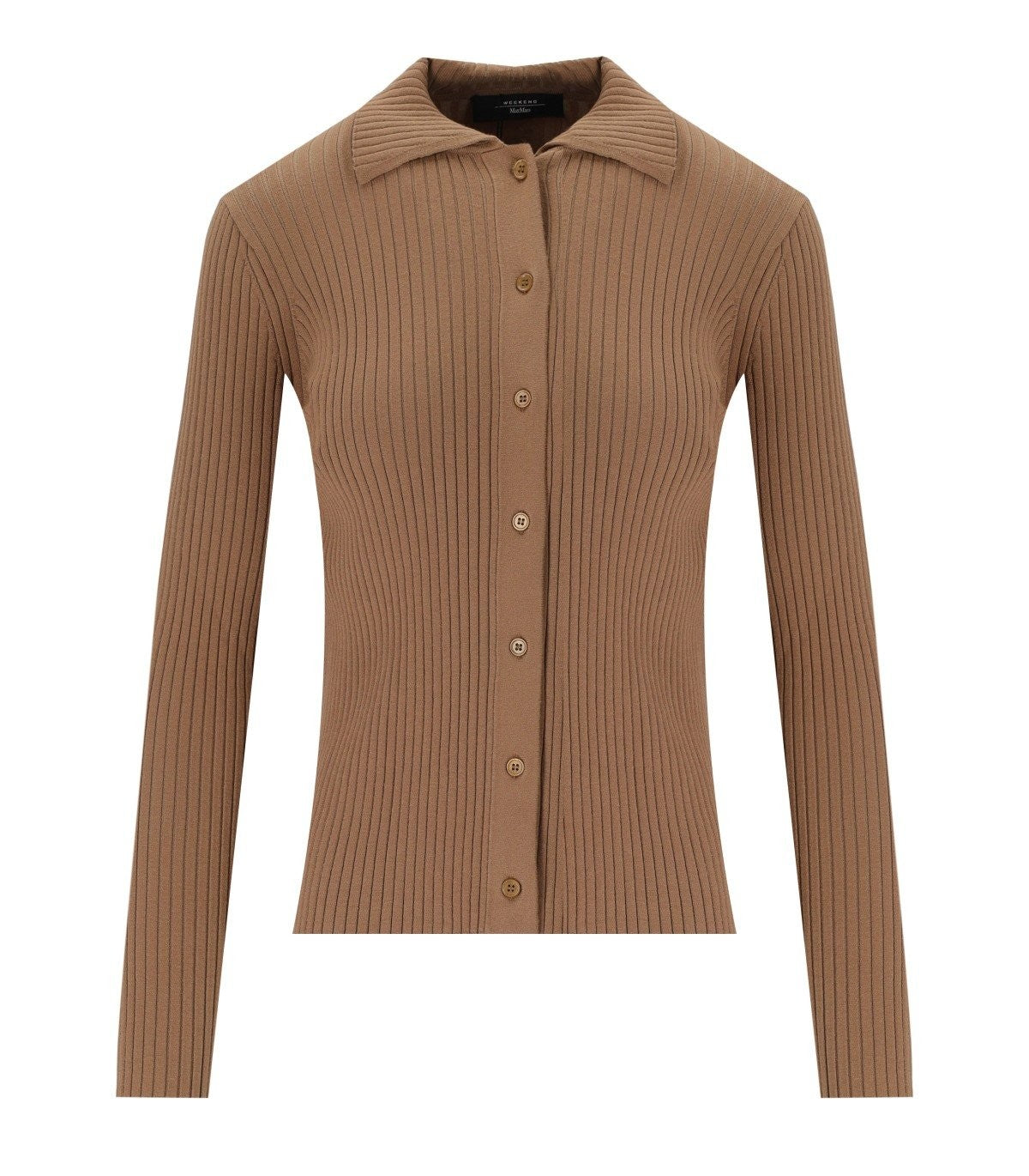Papiro cardigan from Max Mara Weekend made of ribbed viscose blend in shades of brown. Button closure, slim fit. The model is 178 cm tall and wears size M. Composition: 58% viscose, 20% polyester, 17% polyamide, 5% elastane.
