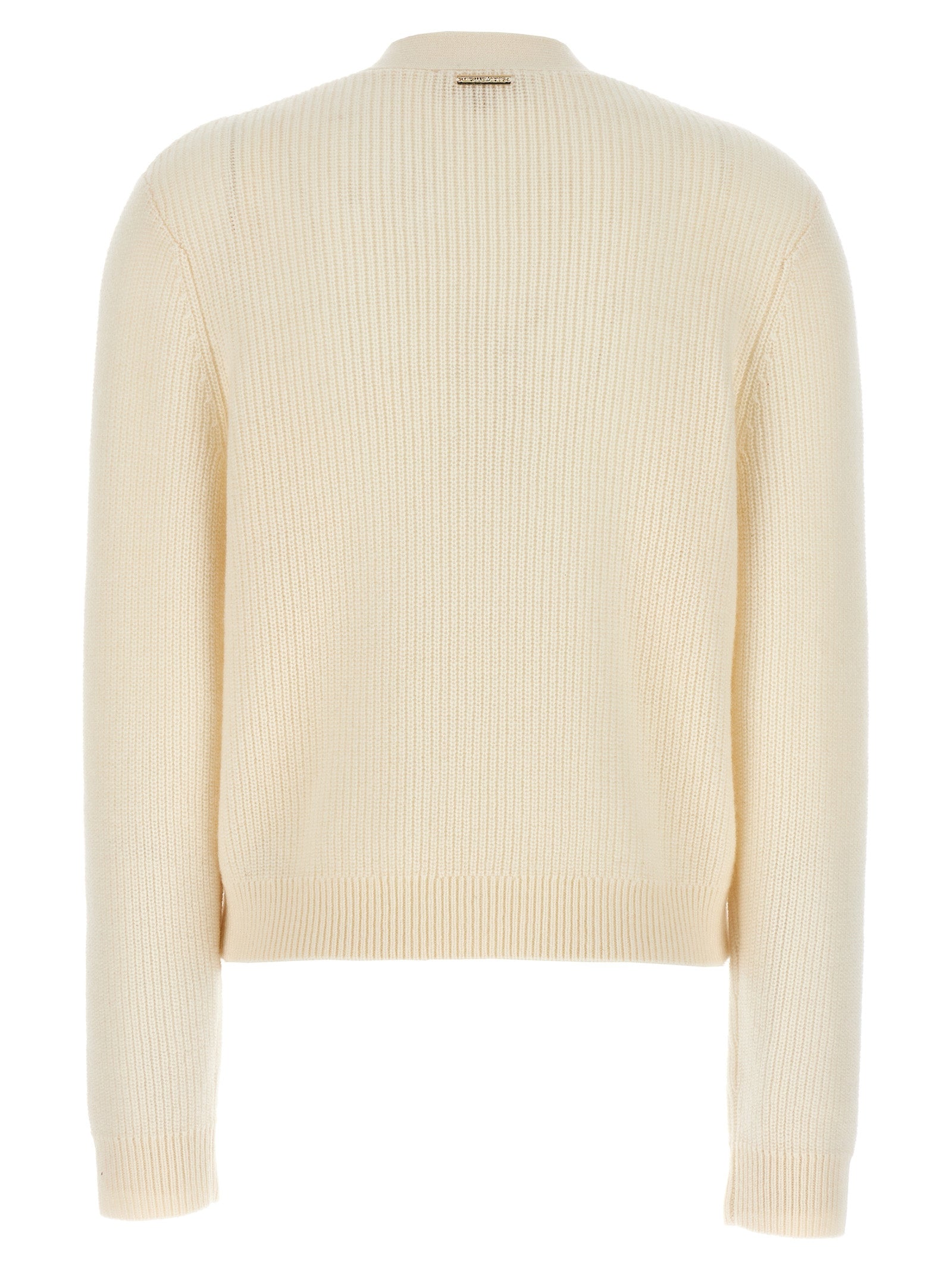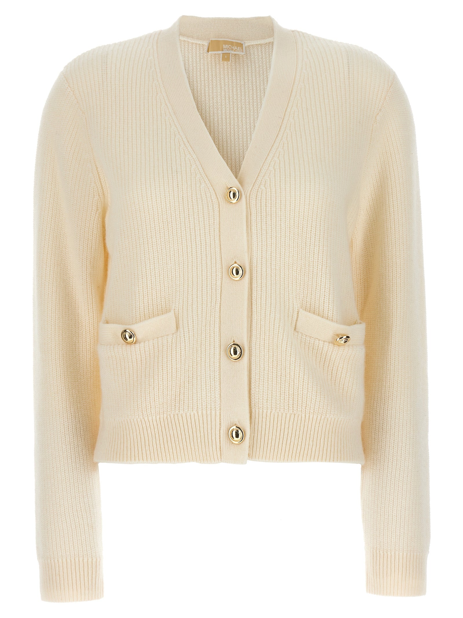 Wool and cashmere cardigan with logo button closure, front pockets, long cuffed sleeves.