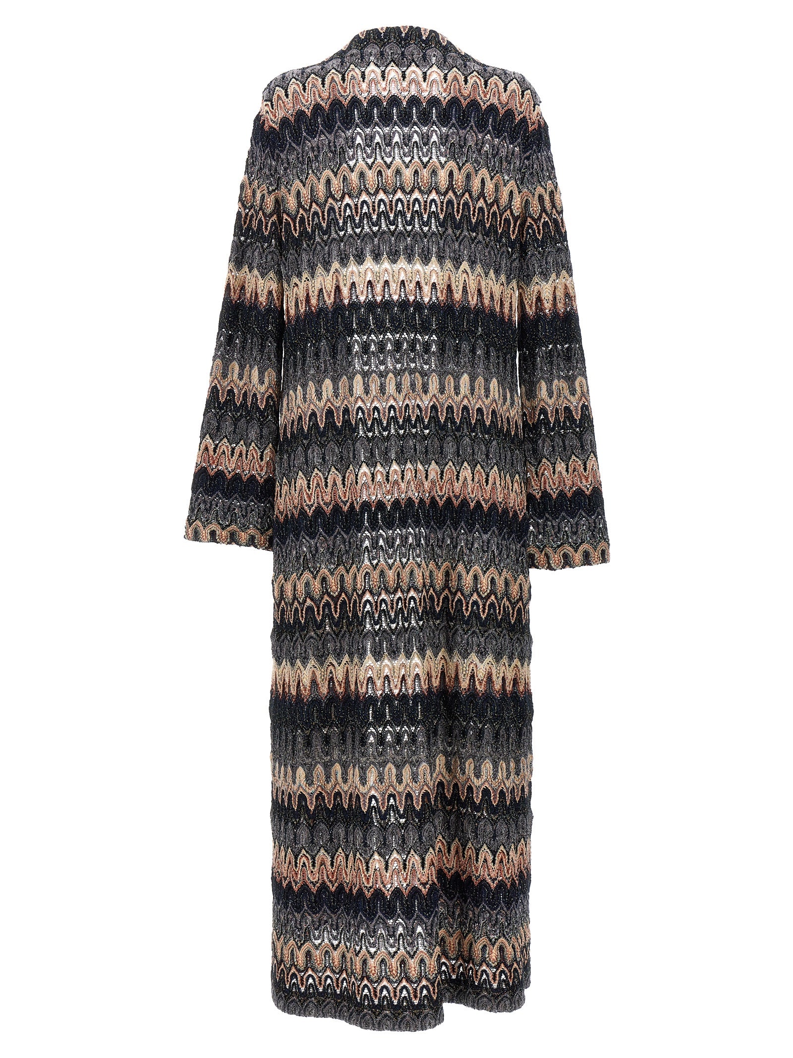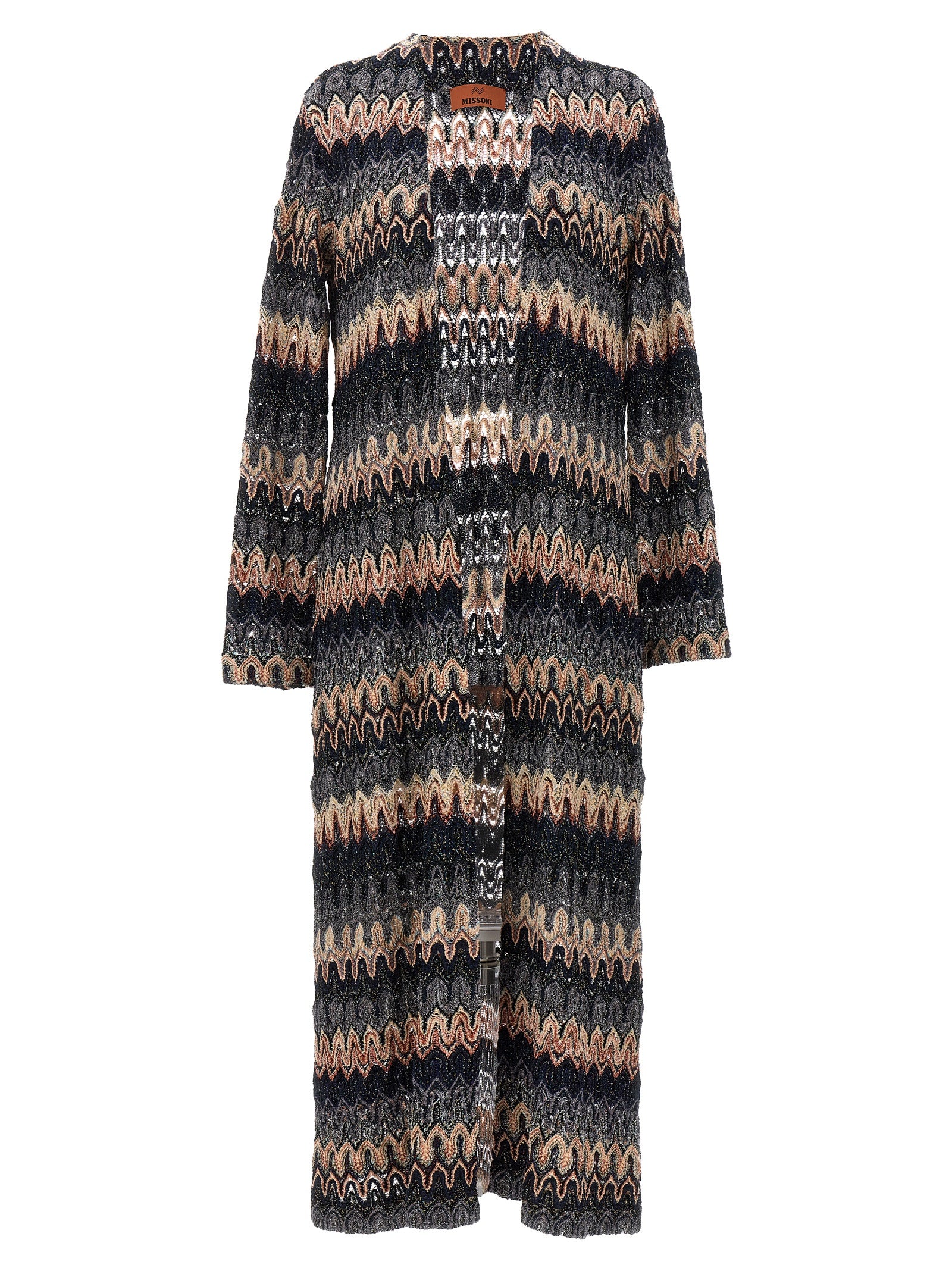 Long knitted cardigan with pattern, front opening, long sleeves.