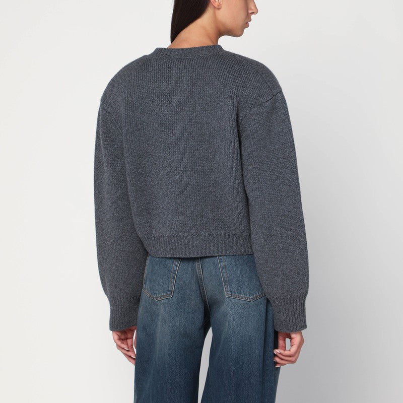 Short crew-neck cardigan by Róhe in grey wool, featuring a front button closure, long sleeves, dropped shoulders, and ribbed edges.