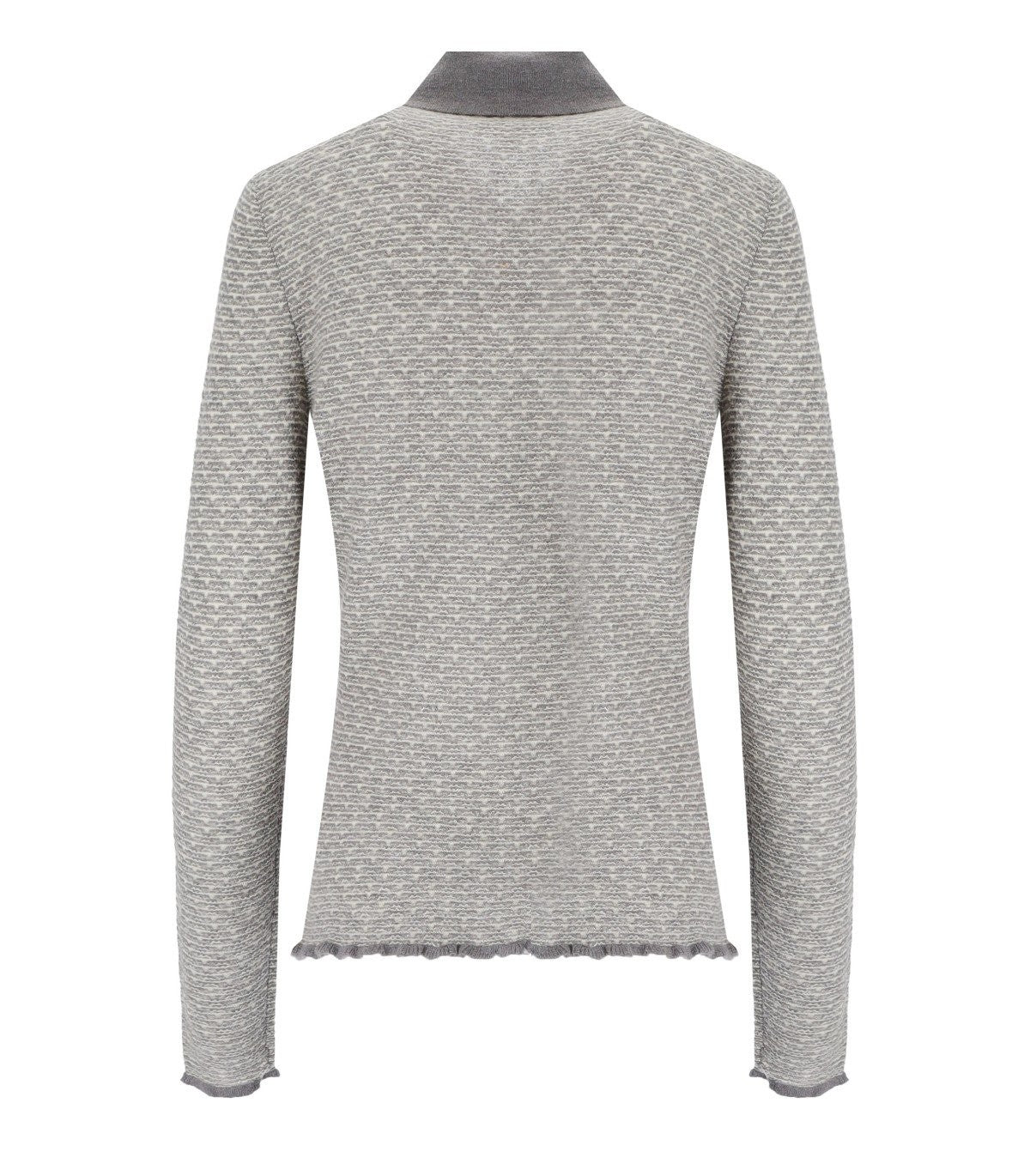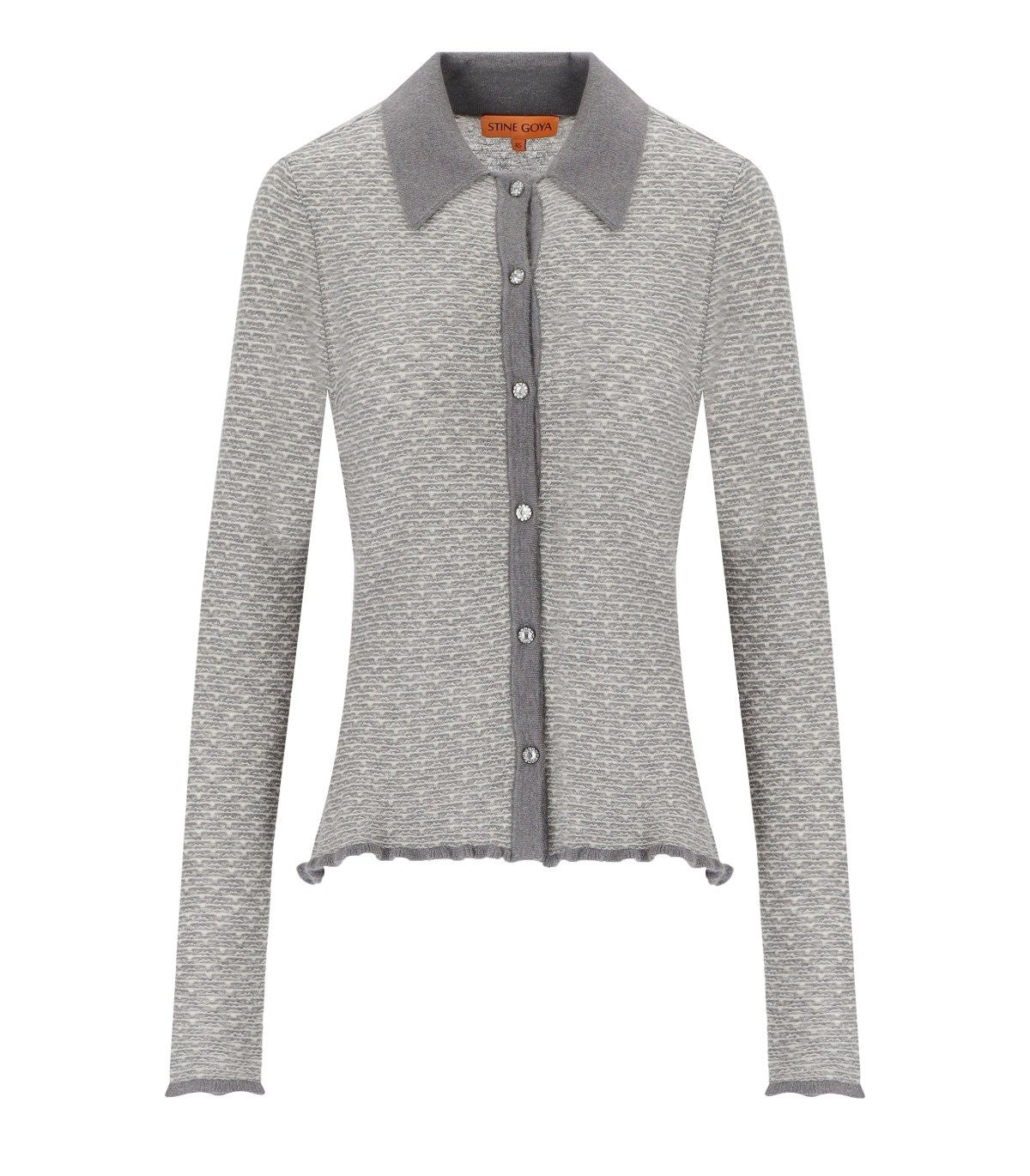 Bobbi cardigan by Stine Goya made of grey wool and alpaca blend, featuring a polo collar, ruched finishing on cuffs and hem and closure with jewel buttons. Close fit. The model is 176 cm tall and wears size XS. Composition: 32% wool, 32% polyamide, 31% alpaca, 5% polyester.