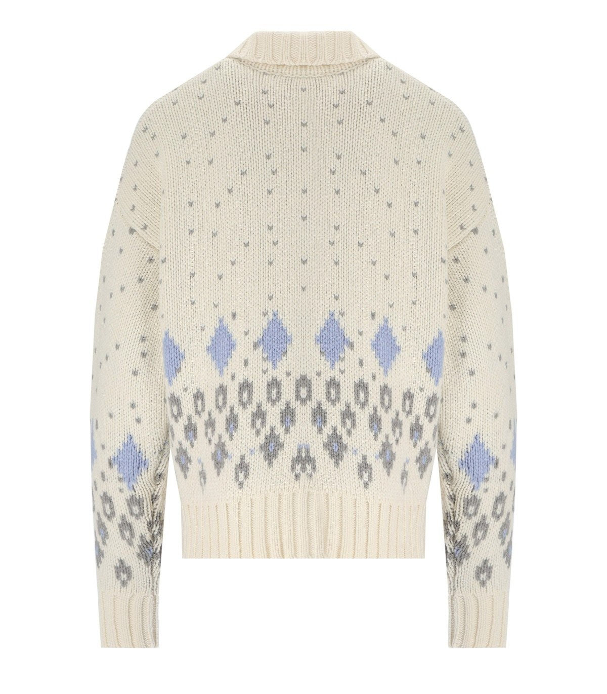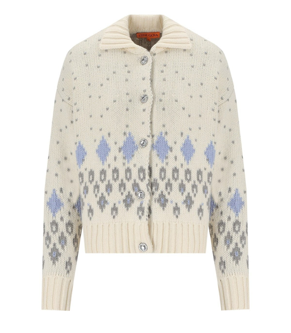 Rylee cardigan by Stine Goya made of cream-colored acrylic mohair blend fabric with geometric pattern in shades of grey and light blue. Ribbed edges and jewel button closure. Relaxed fit. Composition: 45% acrylic, 20% mohair, 35% nylon.