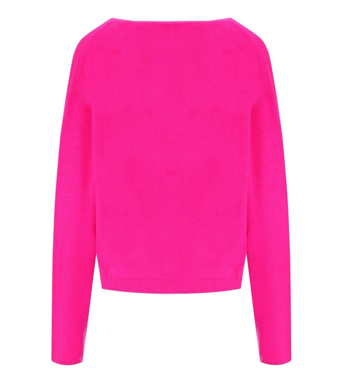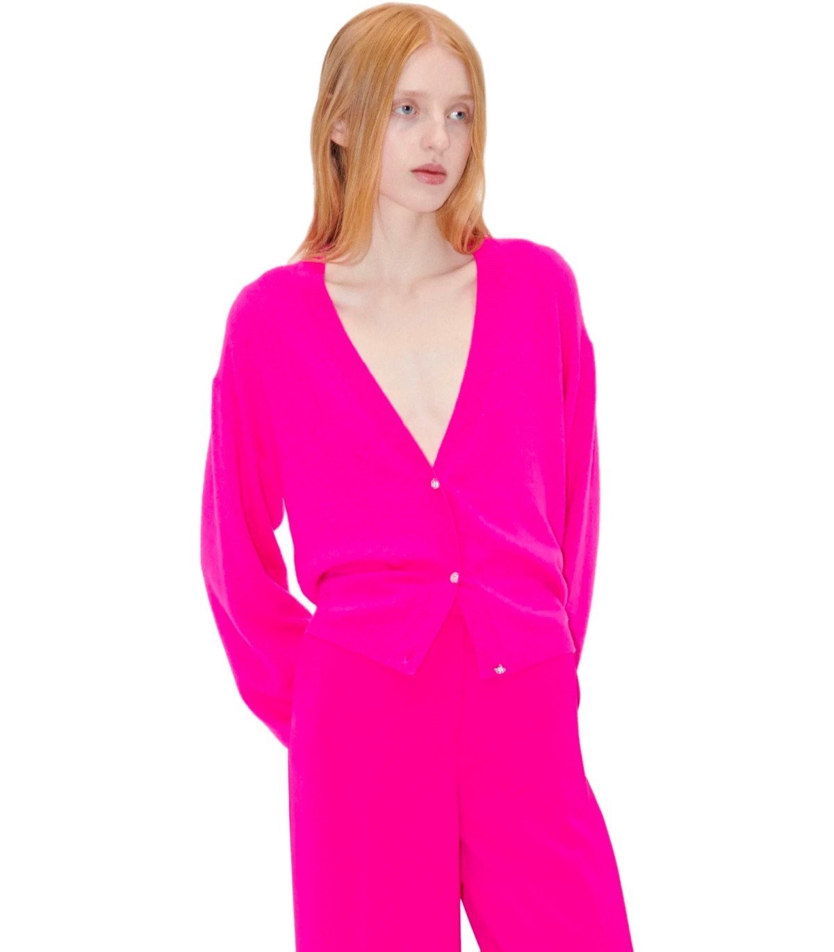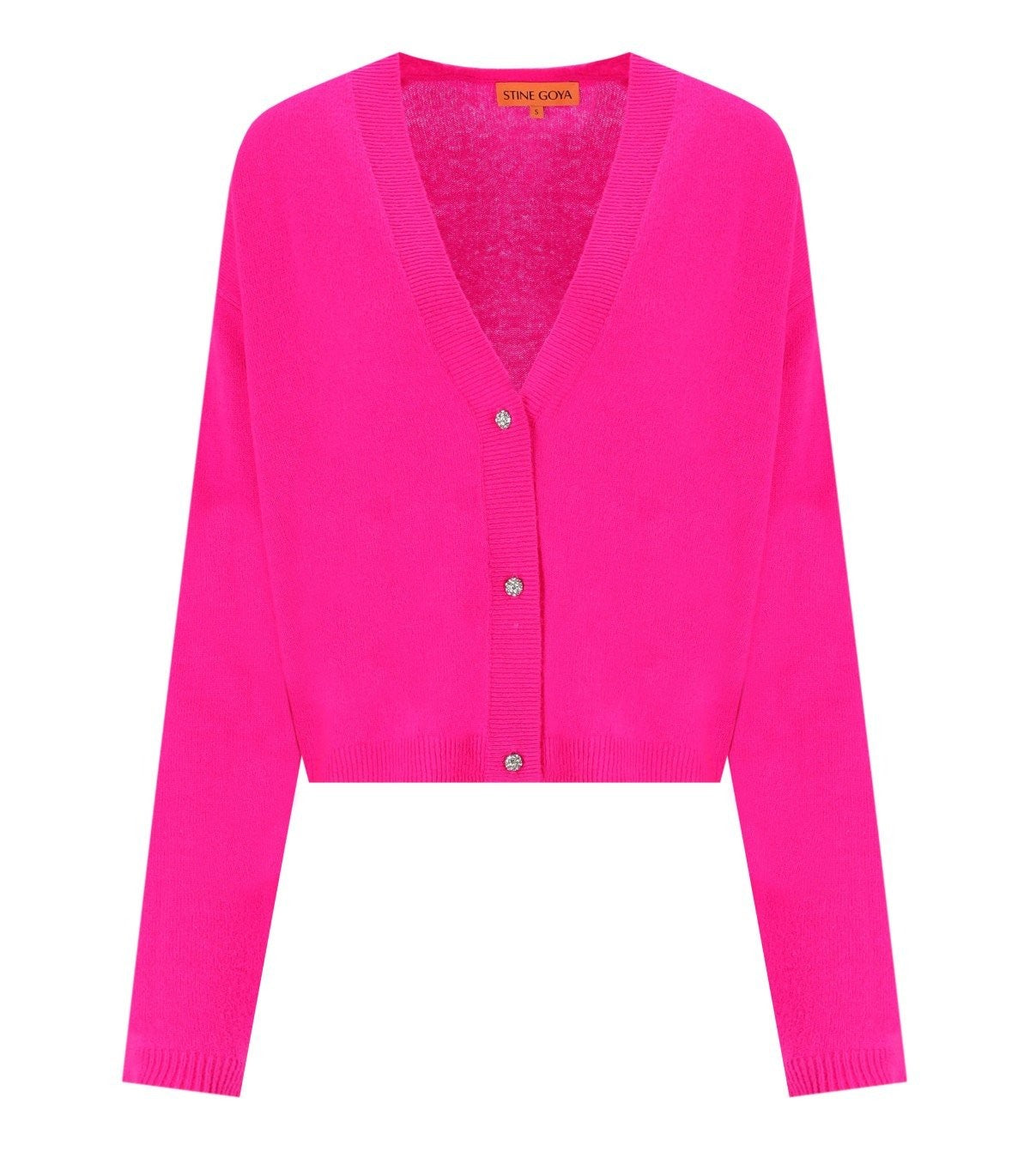 Suanne cardigan by Stine Goya made of a silk blend fuchsia wool. Wide V-neck, closure with jewel buttons. Soft fit. Model is 177 cm tall and wears size XS. Composition: 70% merino wool, 30% spun wool.