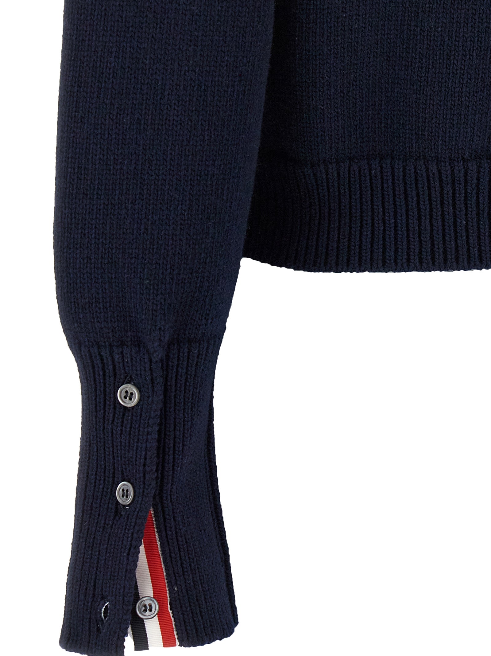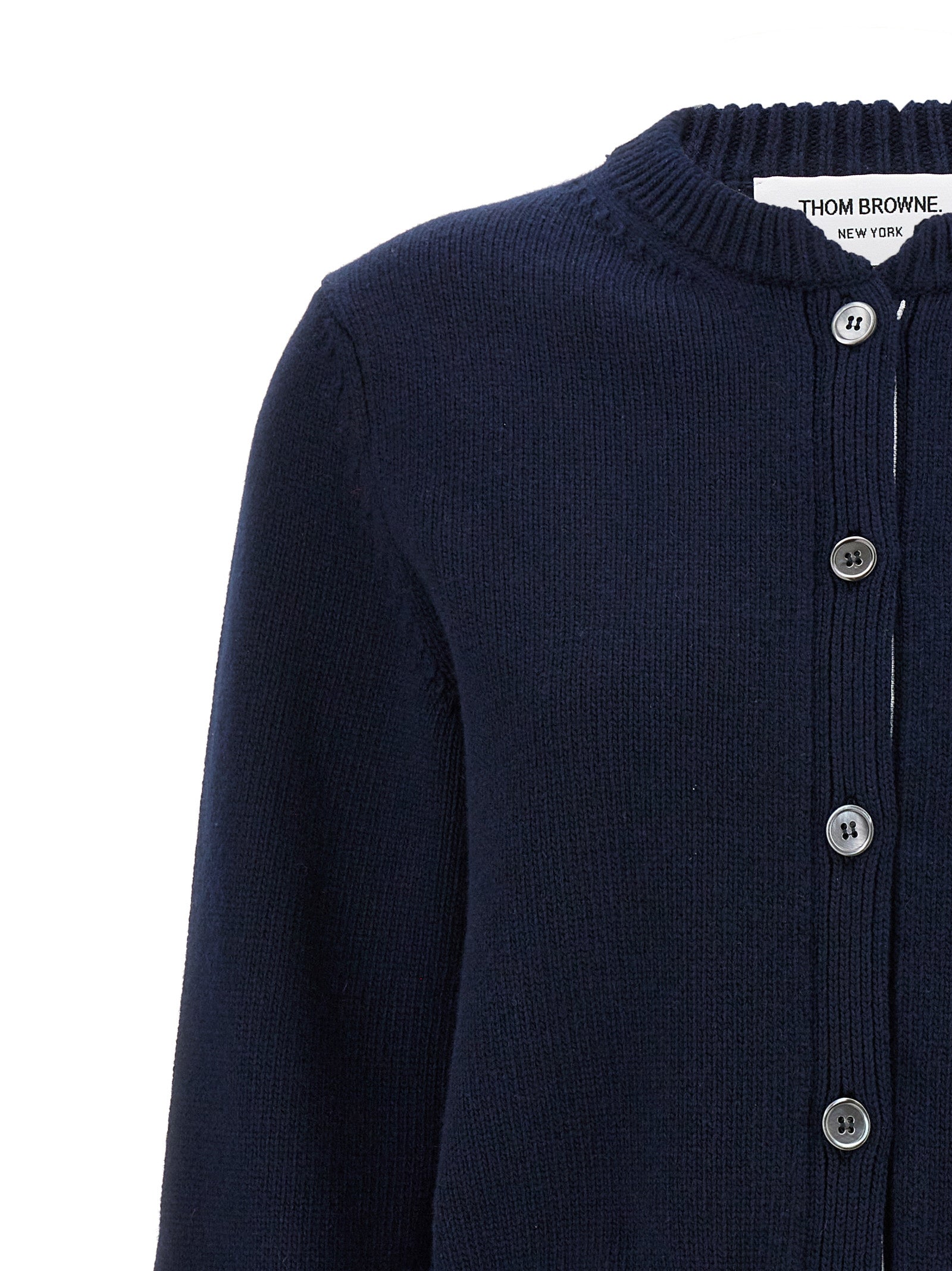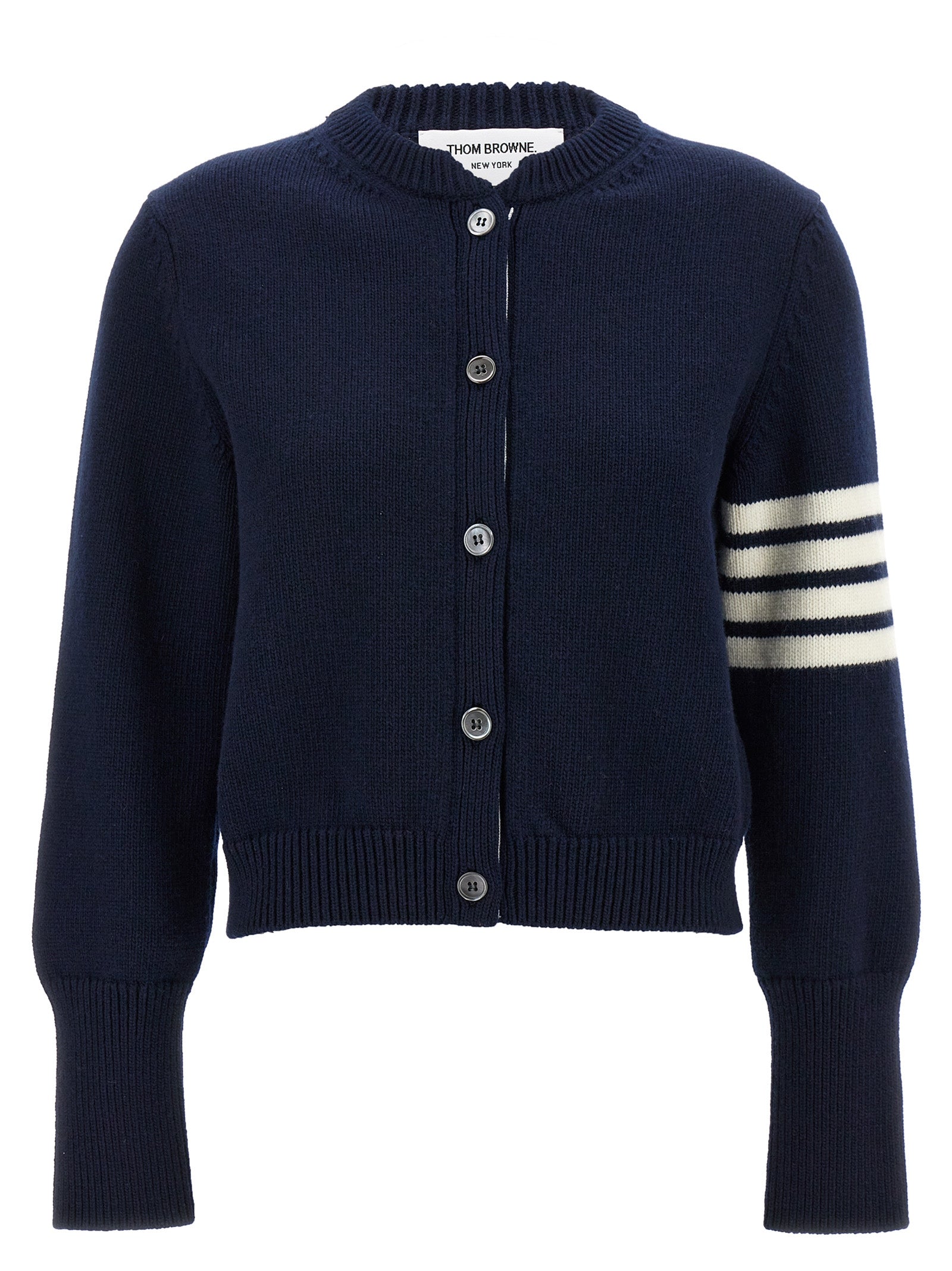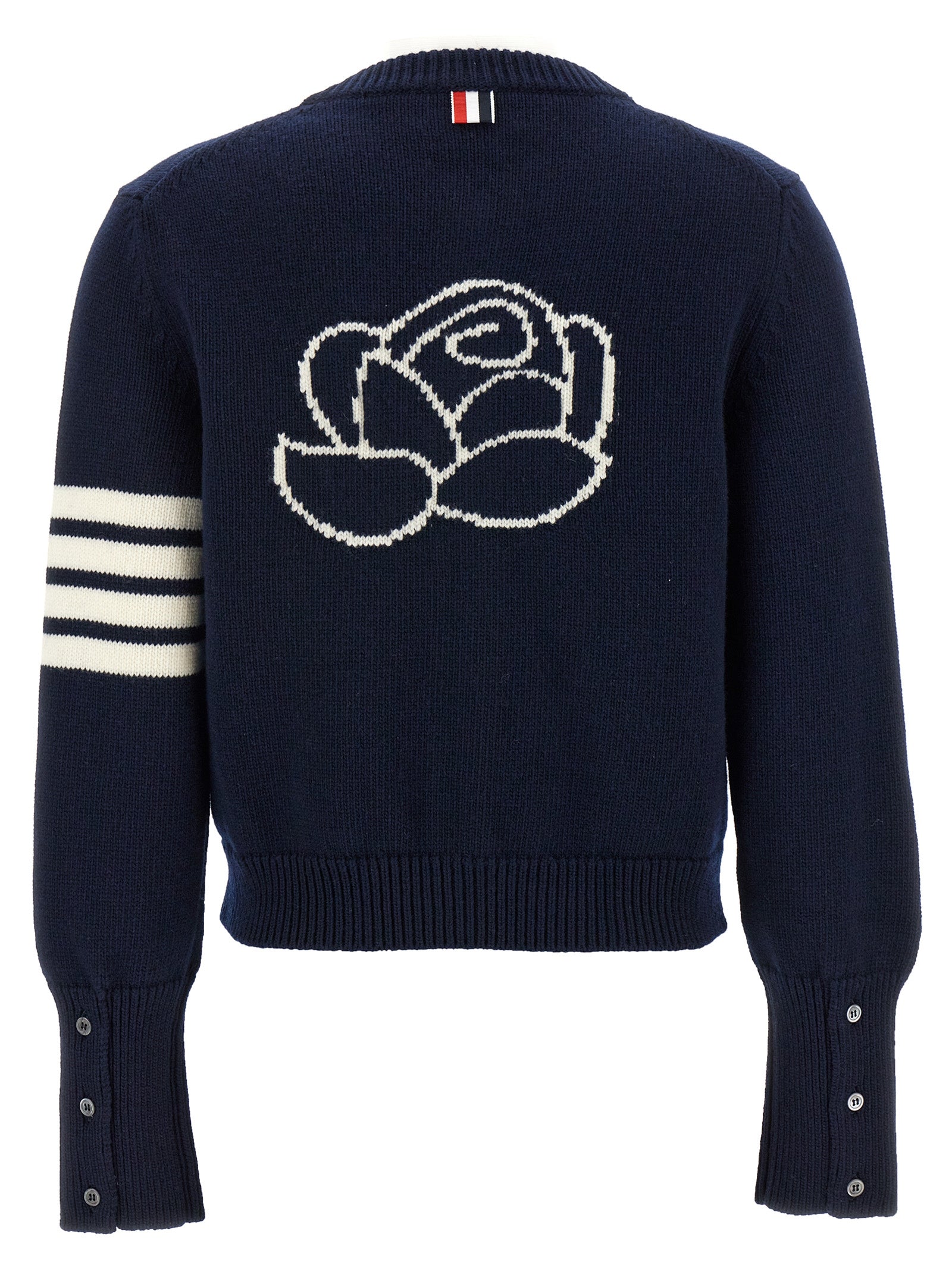 Wool cardigan with 'Rose Icon' intarsia at the back, 4 bar detail on the sleeve, button closure, long cuffed sleeves.