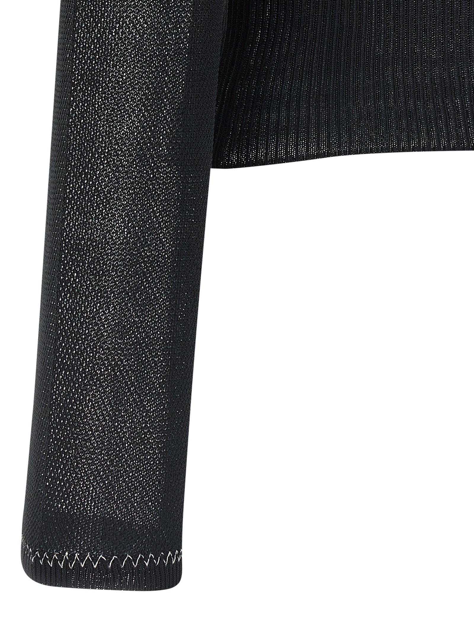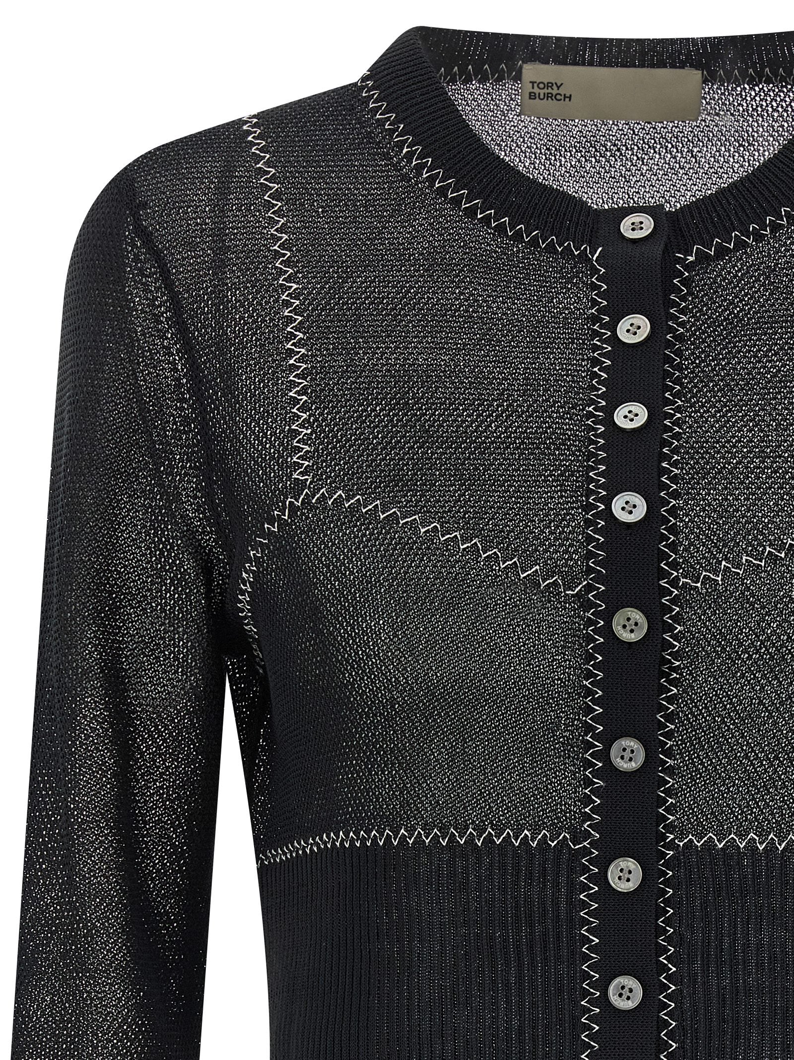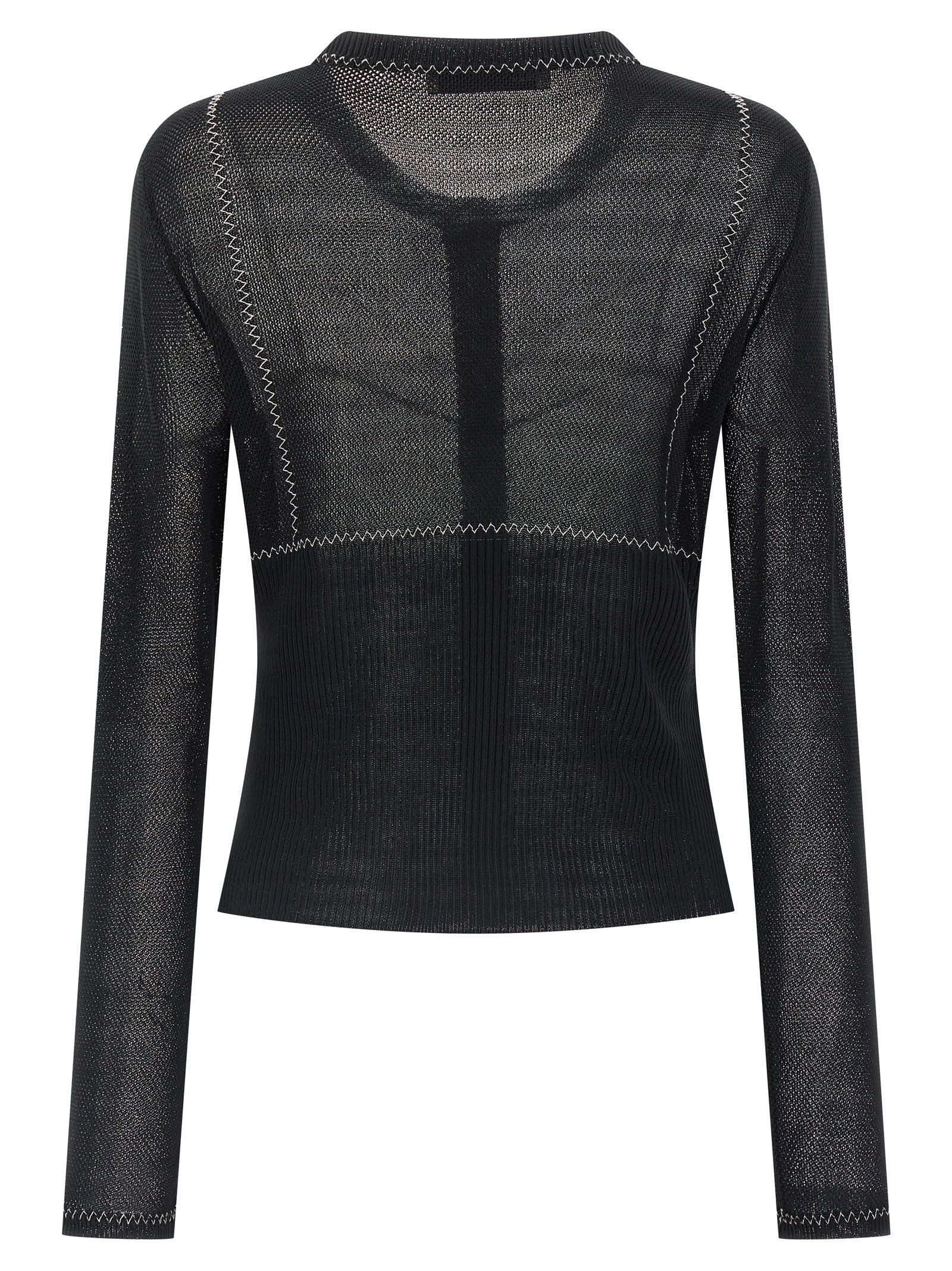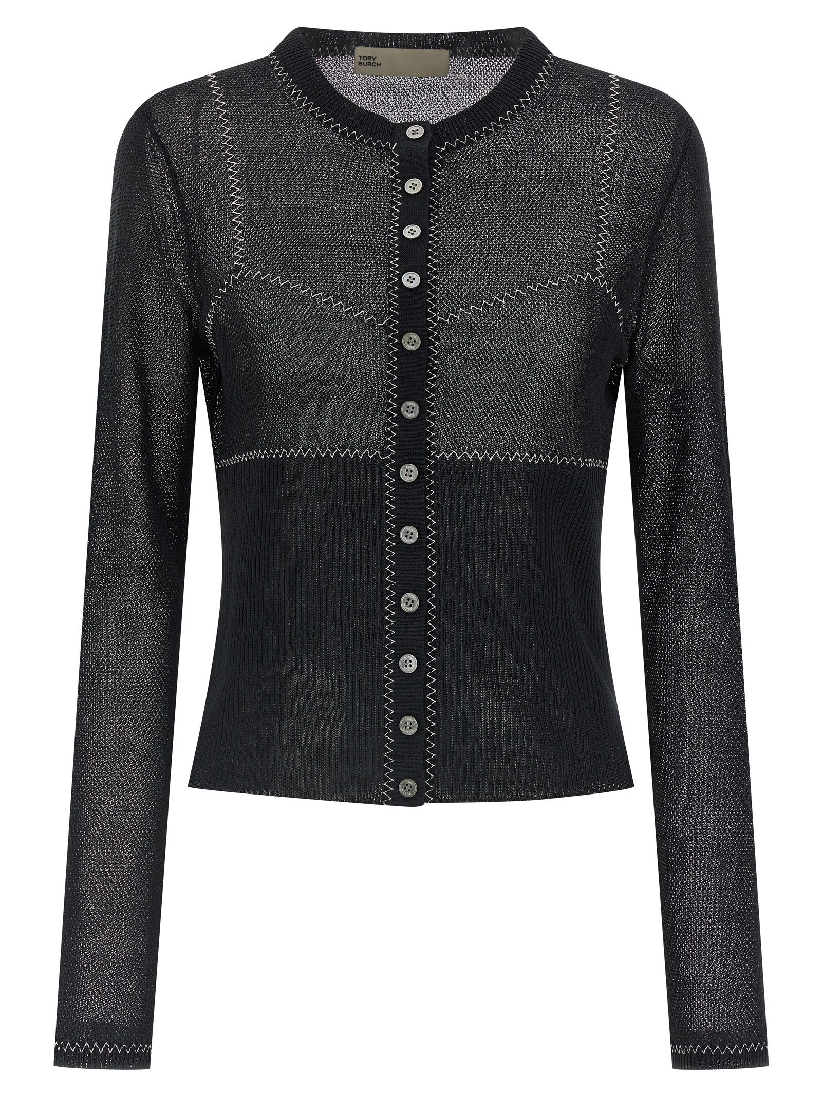 Semi-transparent mesh cardigan, crew neck, front button closure, contrast zigzag stitching detail, long sleeves with cuffs.