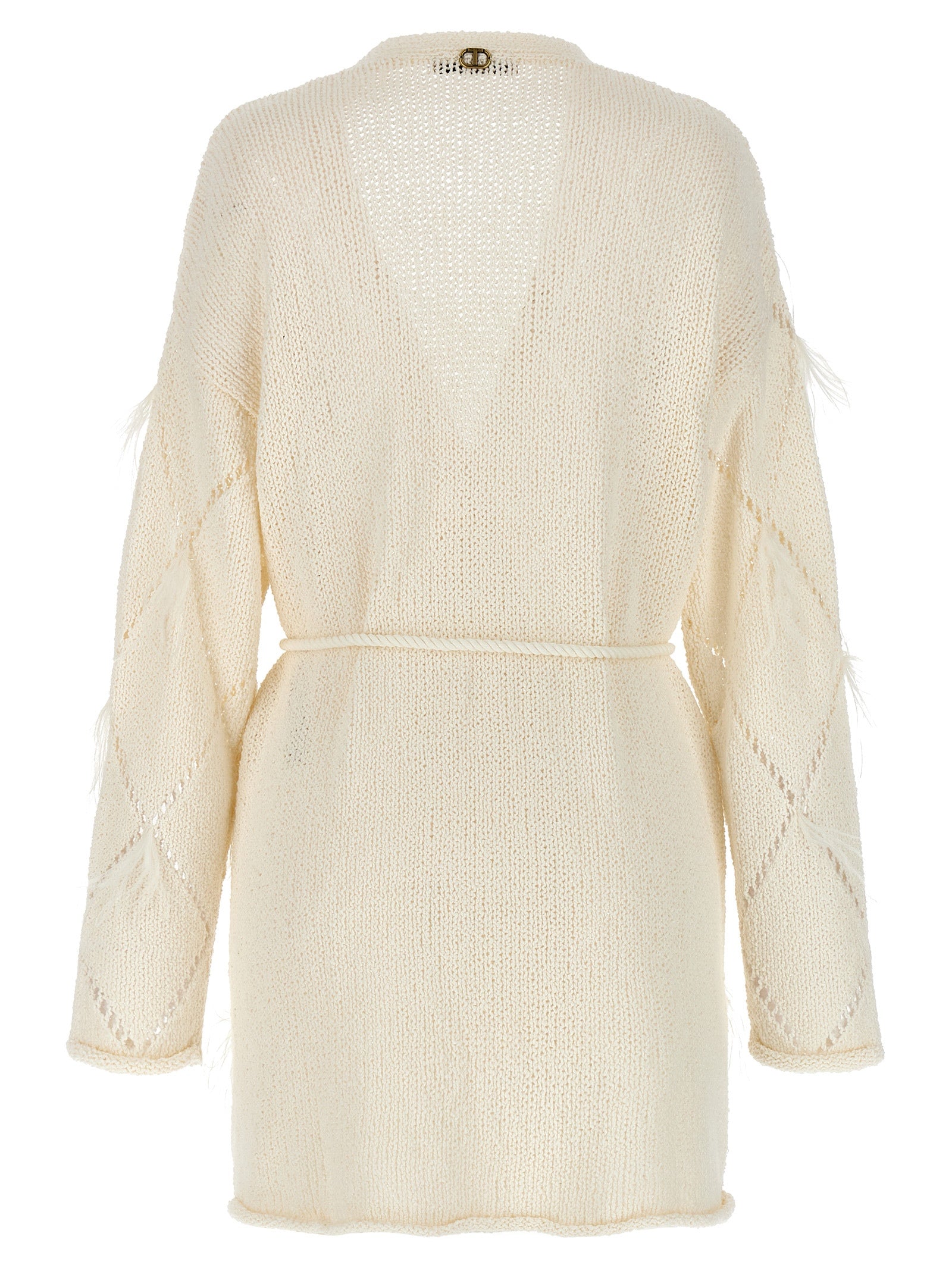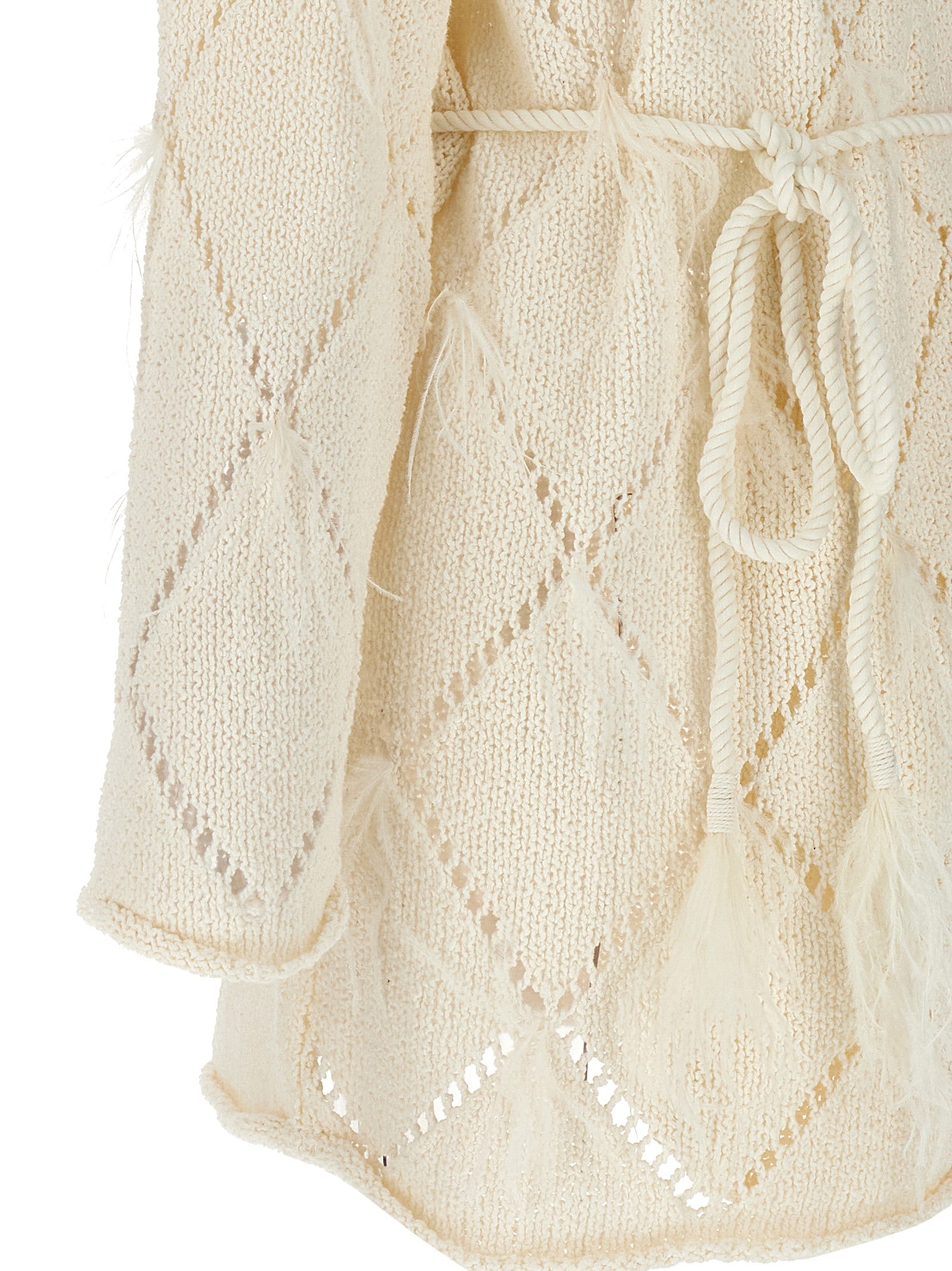 Openwork knit cardigan with tone-on-tone feathers, and removable belt detail.
