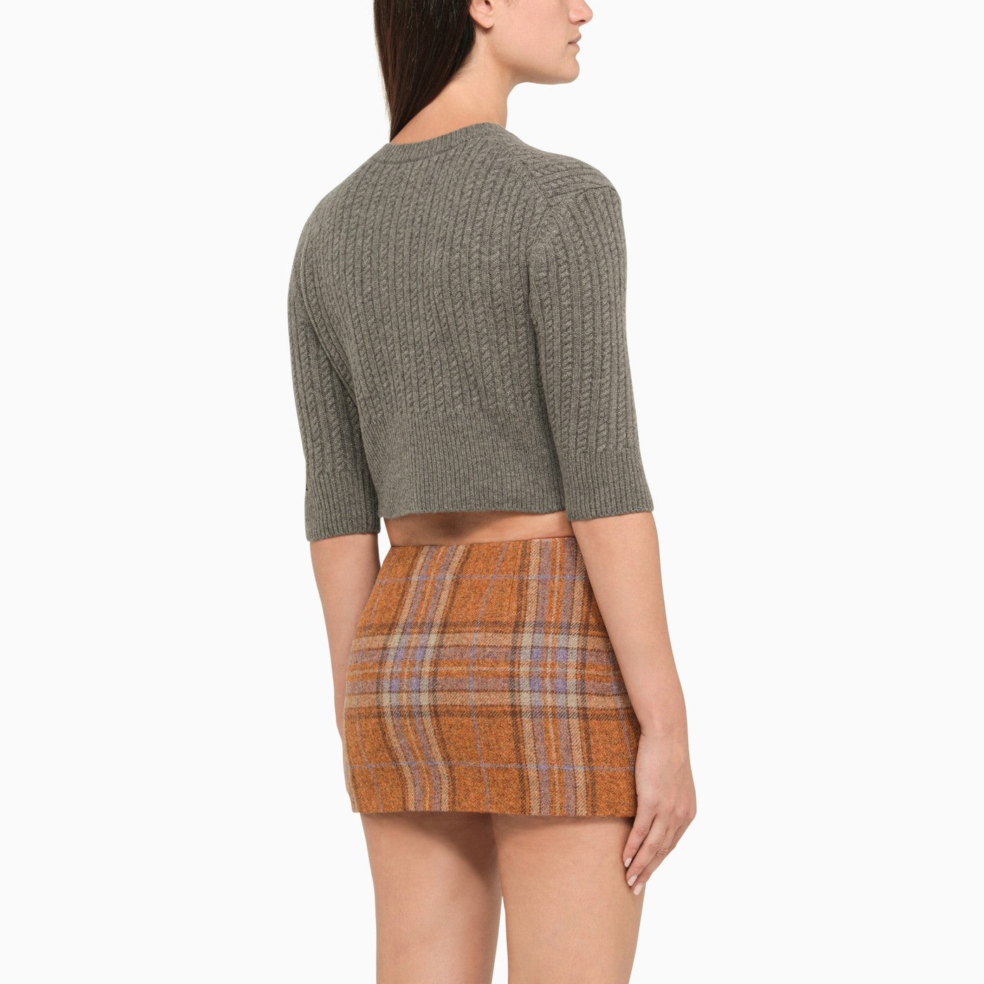 Grey wool jersey cardigan from We11Done featuring button front, logo patch on sleeve and cropped fit.
