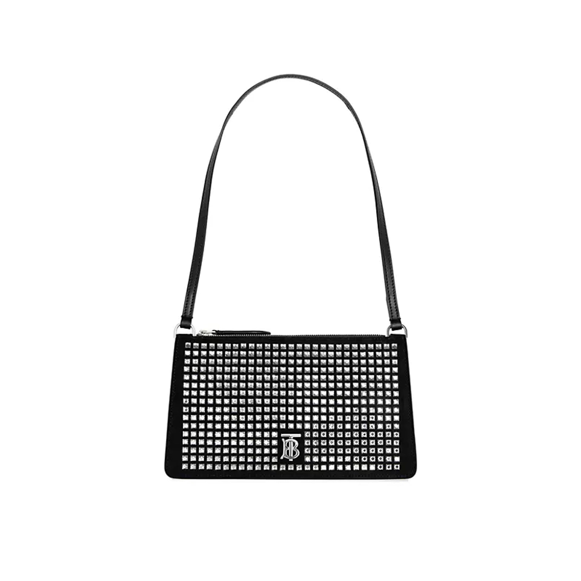 - Composition: 100% calf leather - Top zip closure - suede effect - Shoulder strap - All over crystals - TB hardware detail - Lenght 24 cm - Height 14 cm - Width 4 cm - Made in Italy -