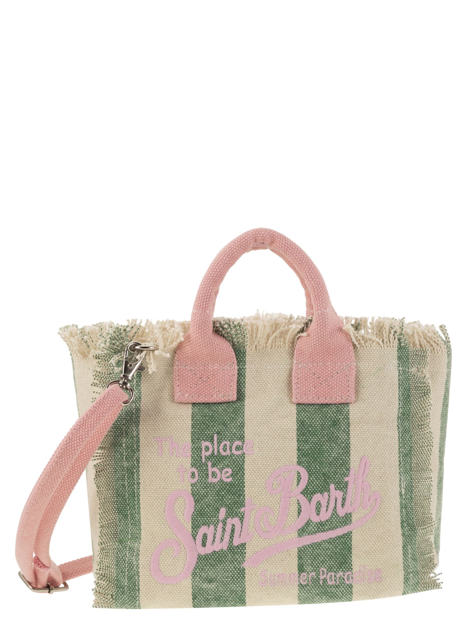 Introducing the Mini Vanity canvas bag, a chic accessory that perfectly combines comfort and elegance. Meticulously crafted from premium cotton canvas, this bag features a refined structure for a sophisticated look. With its compact dimensions, it strikes the ideal balance between practicality and style. The bag comes with a removable shoulder strap, offering versatile carrying options tailored to your preferences. Despite its smaller size, the Mini Vanity Canvas Bag boasts a spacious interior, making it the perfect companion for various occasions. Available in a wide range of colours, this miniature masterpiece allows you to express your unique style effortlessly. Choose from a range of shades to complete your outfit and make a statement wherever you go. Enhance your accessories collection with this refined and versatile canvas mini bag that perfectly combines fashion and functionality. - Canvas Mini Vanity Bag - Striped print - Cotton canvas material - Exclusive Saint Barth logo embroidery - Zip closure - Inside pocket with zip - With removable shoulder strap DESIGNER ID: VAMI001 01211F