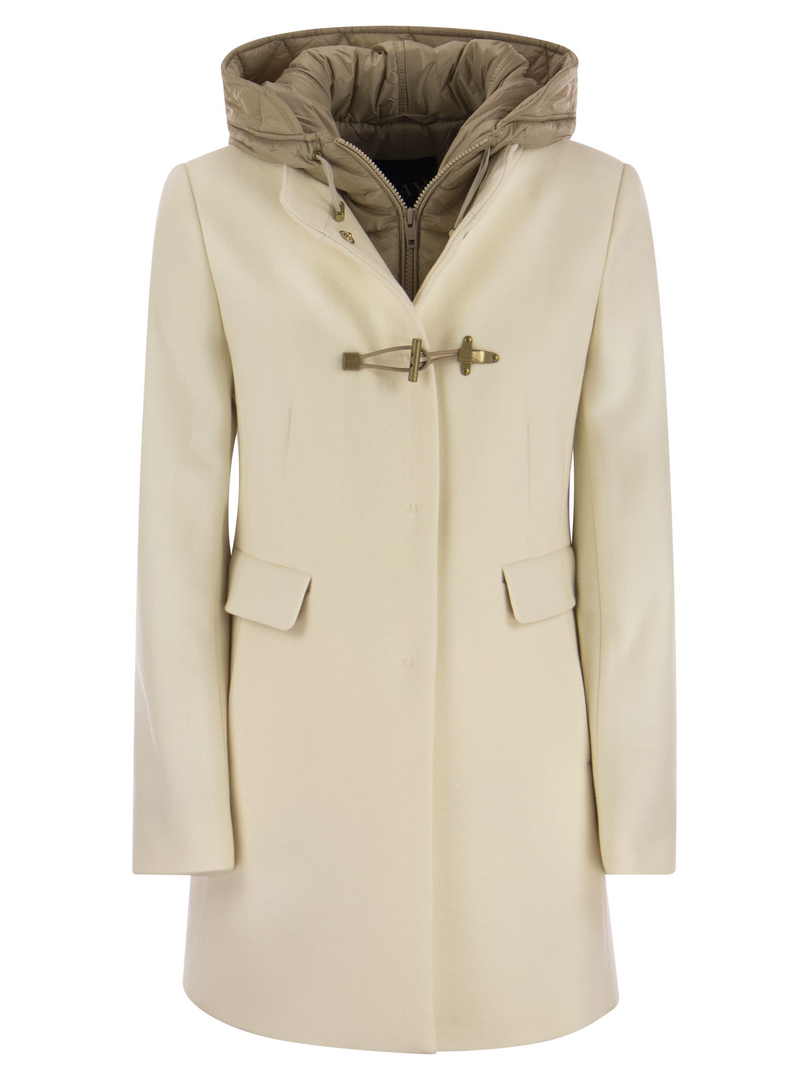 Double front duffle coat in soft wool-blend cloth, with bib and hood padded with technical wadding. Fitted with double-entry flap pockets, it has a zip fastening, concealed snap fasteners and Fay frog fastening. Enriched by the internal label with the garment's name. - Made in Italy - Fay women's Toggle Coat - Regular fit - Hooded DESIGNER ID: NAW59473430SGLB008