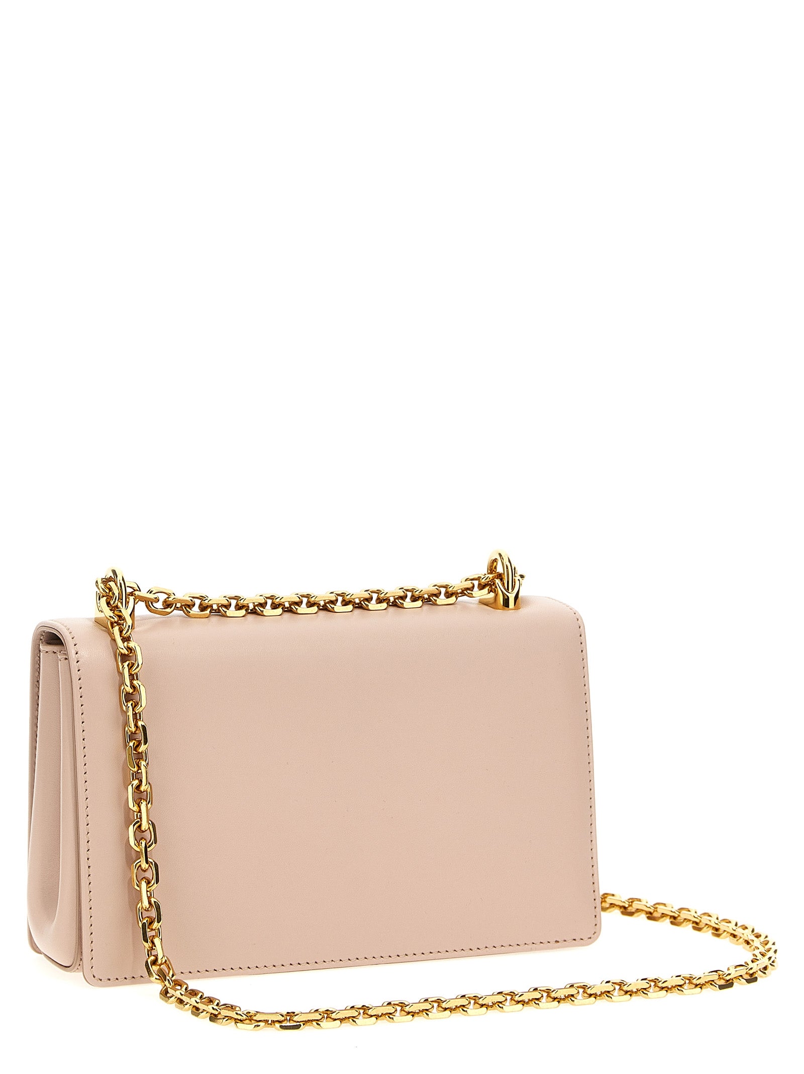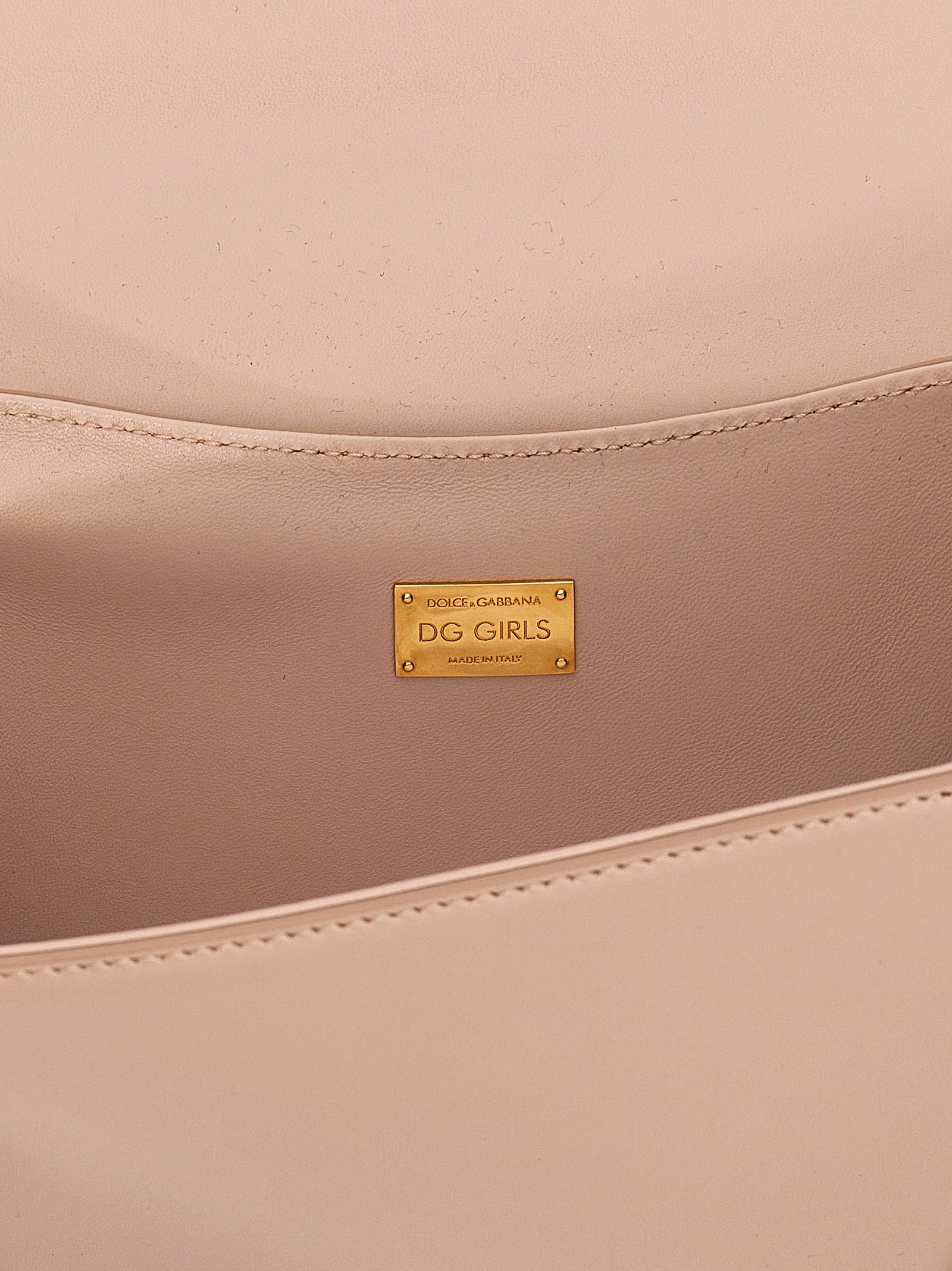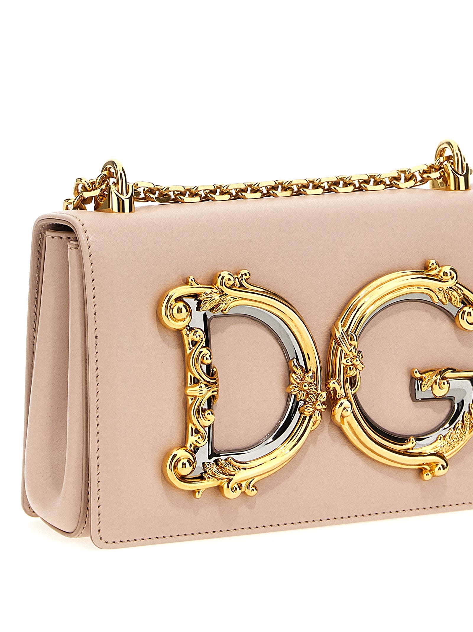 'DG Girls' leather crossbody bag, magnetic flap closure, front metal logo appliqué, chain shoulder strap.