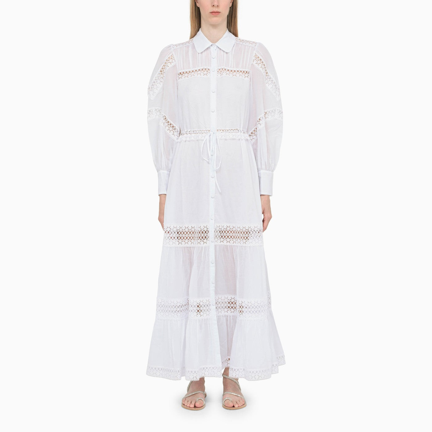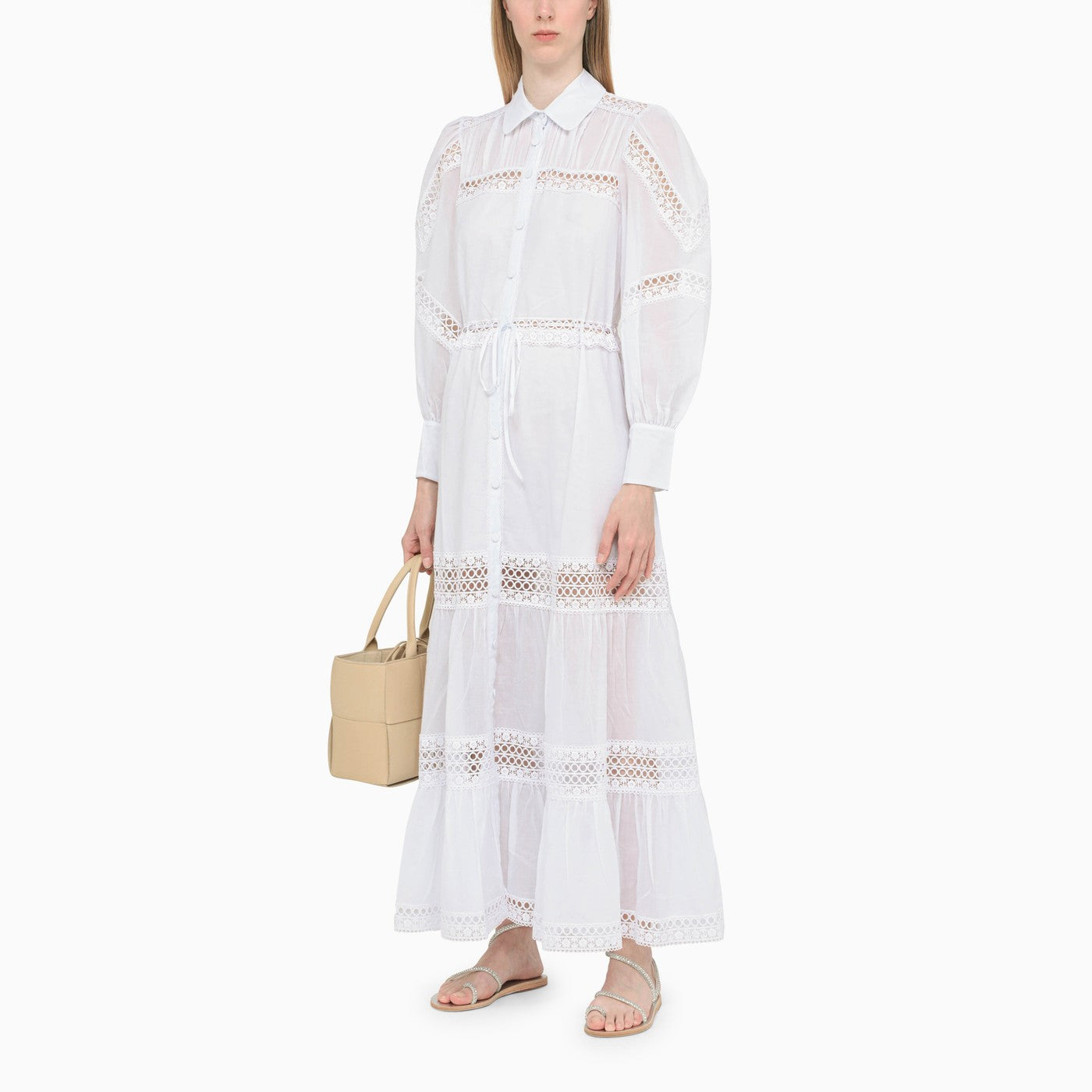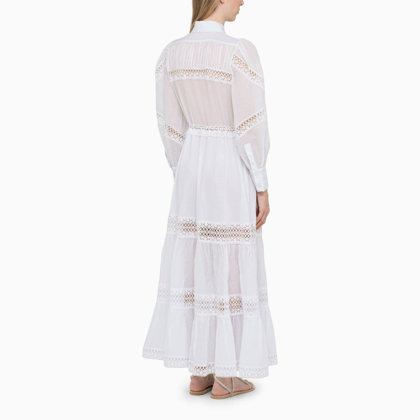 White cotton long dress by Charo Ruiz, featuring tone-on-tone lace and trimmings, long sleeves and button fastening at the front.