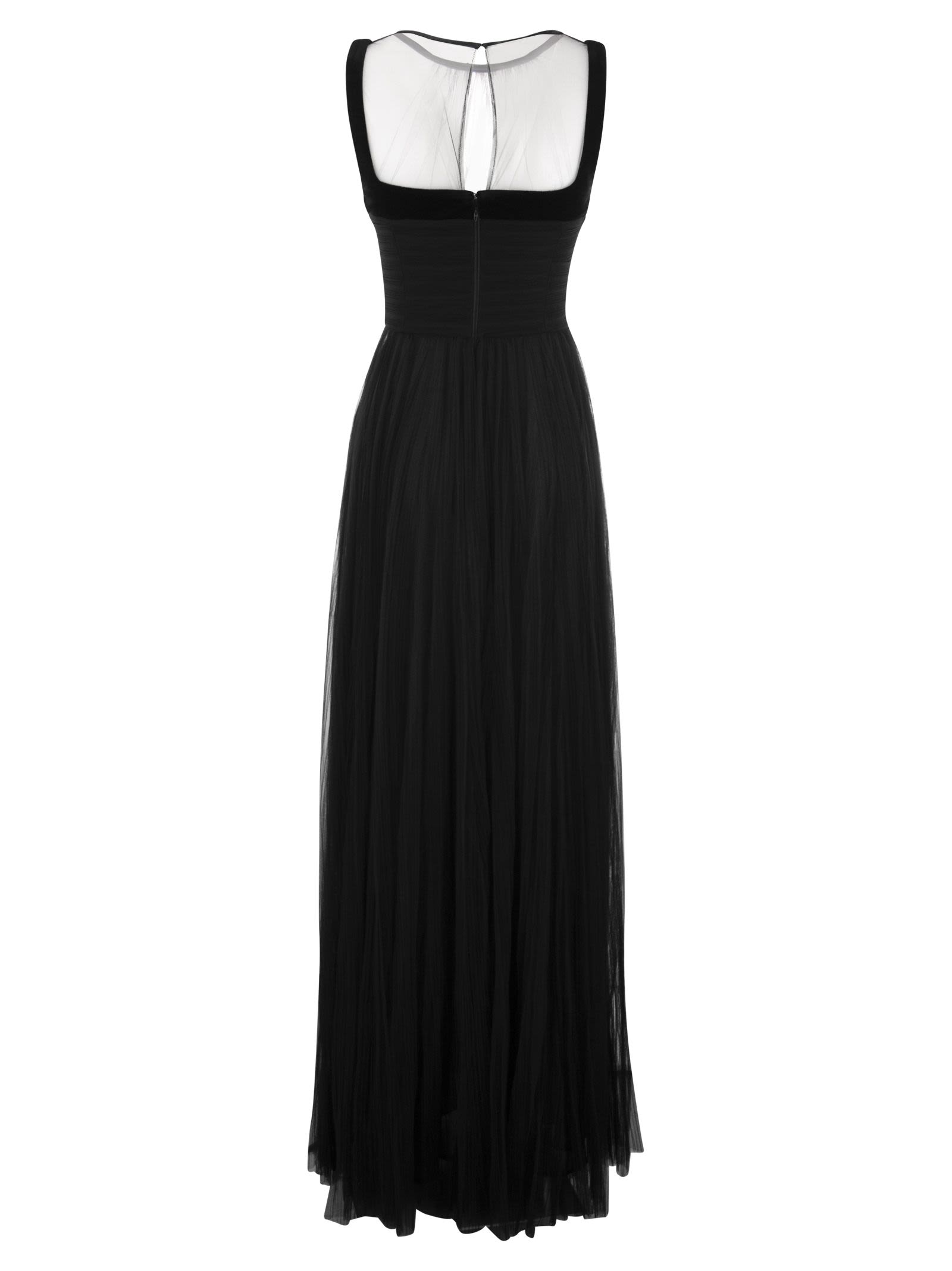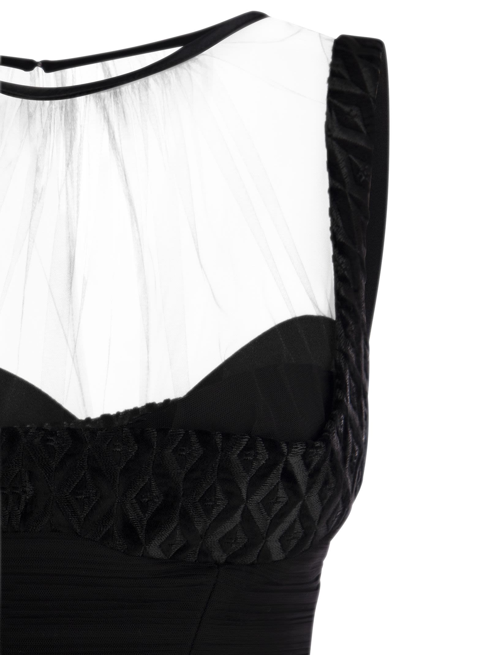 Red carpet dress with embroidered velvet rhombus-effect bodice and gathered tulle. The wide pleated tulle skirt has a side slit in the hip. - Georgette lining - Invisible zip at back DESIGNER ID: AB40036E2 110