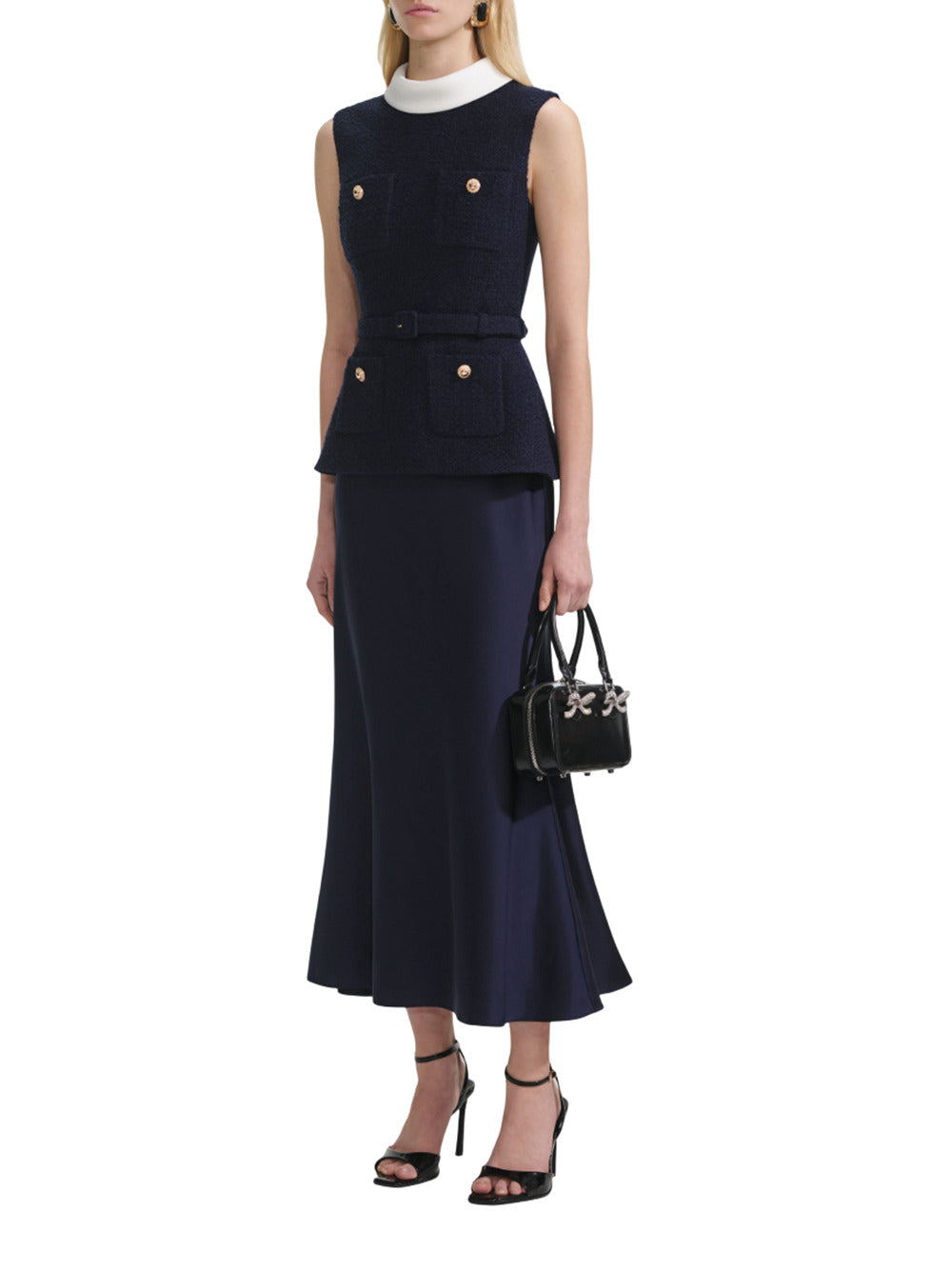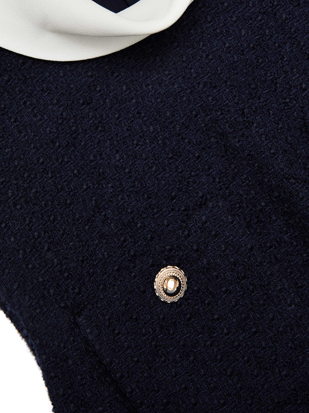 Textured navy boucle and shimmering satin blend seamlessly in this tailored midi dress. A belted waist, high neckline and gold buttons add a touch of feminine elegance - wear with heels for timeless elegance.