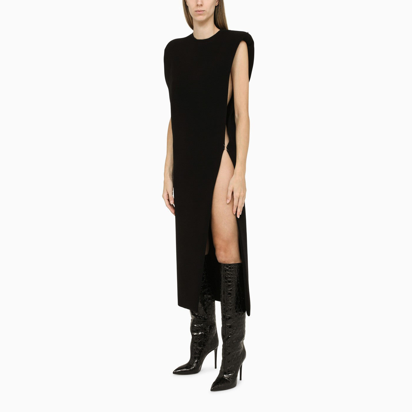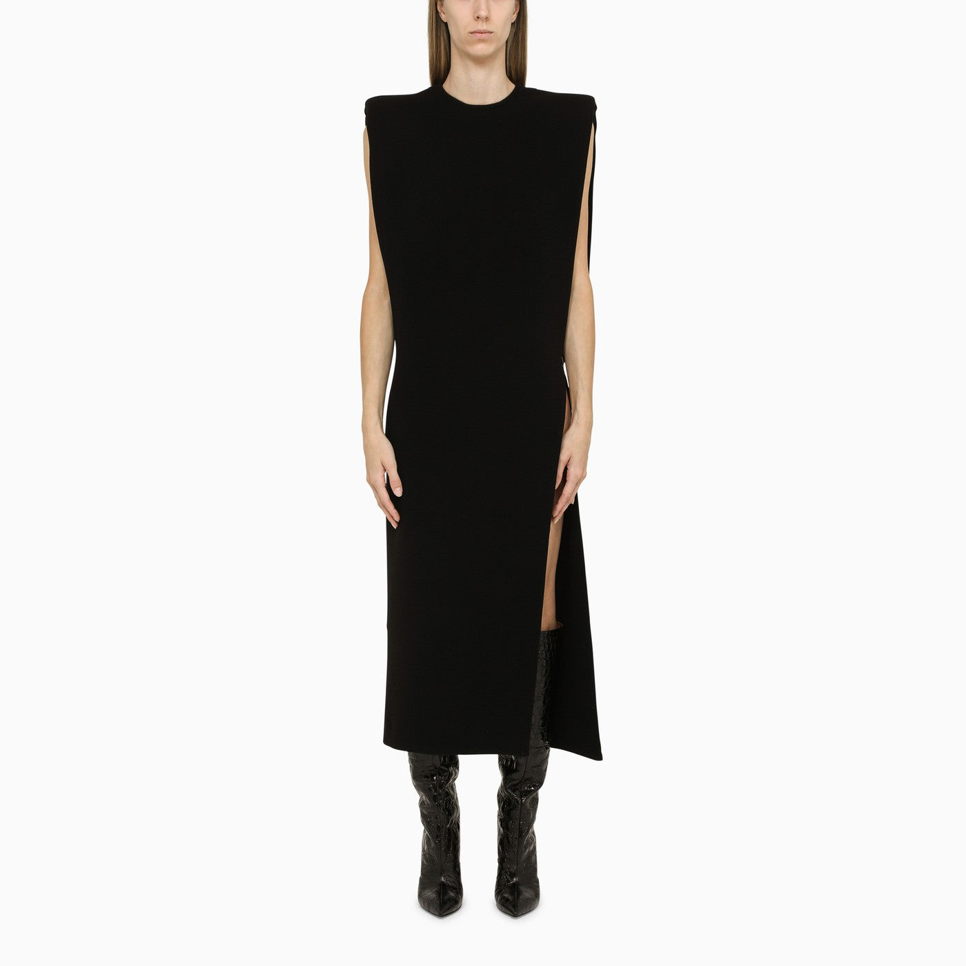 Long Sportmax dress in black wool with padded shoulders, a large slit on the side and a zip closure on the back.