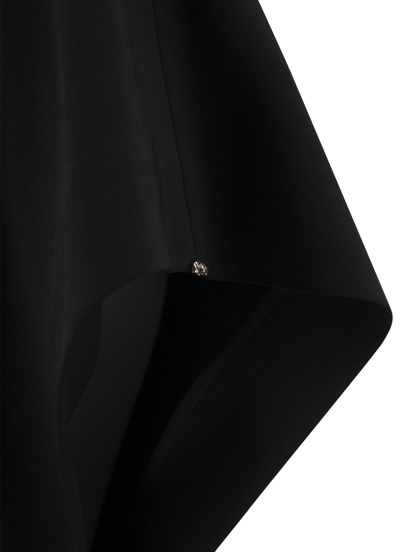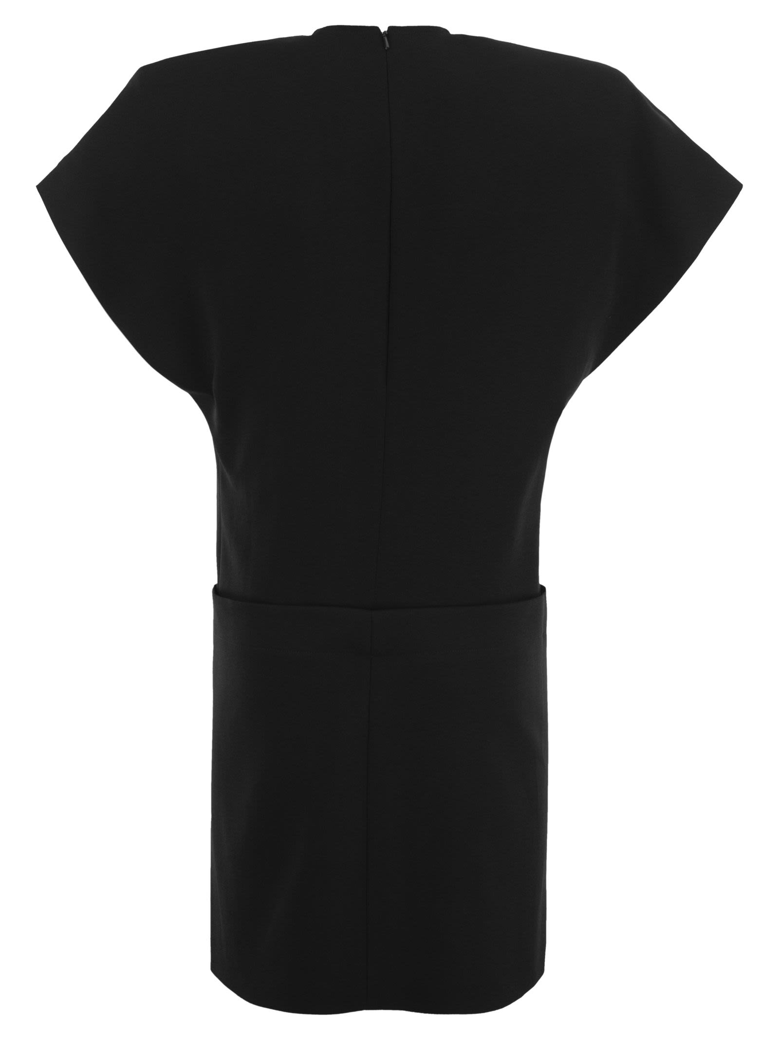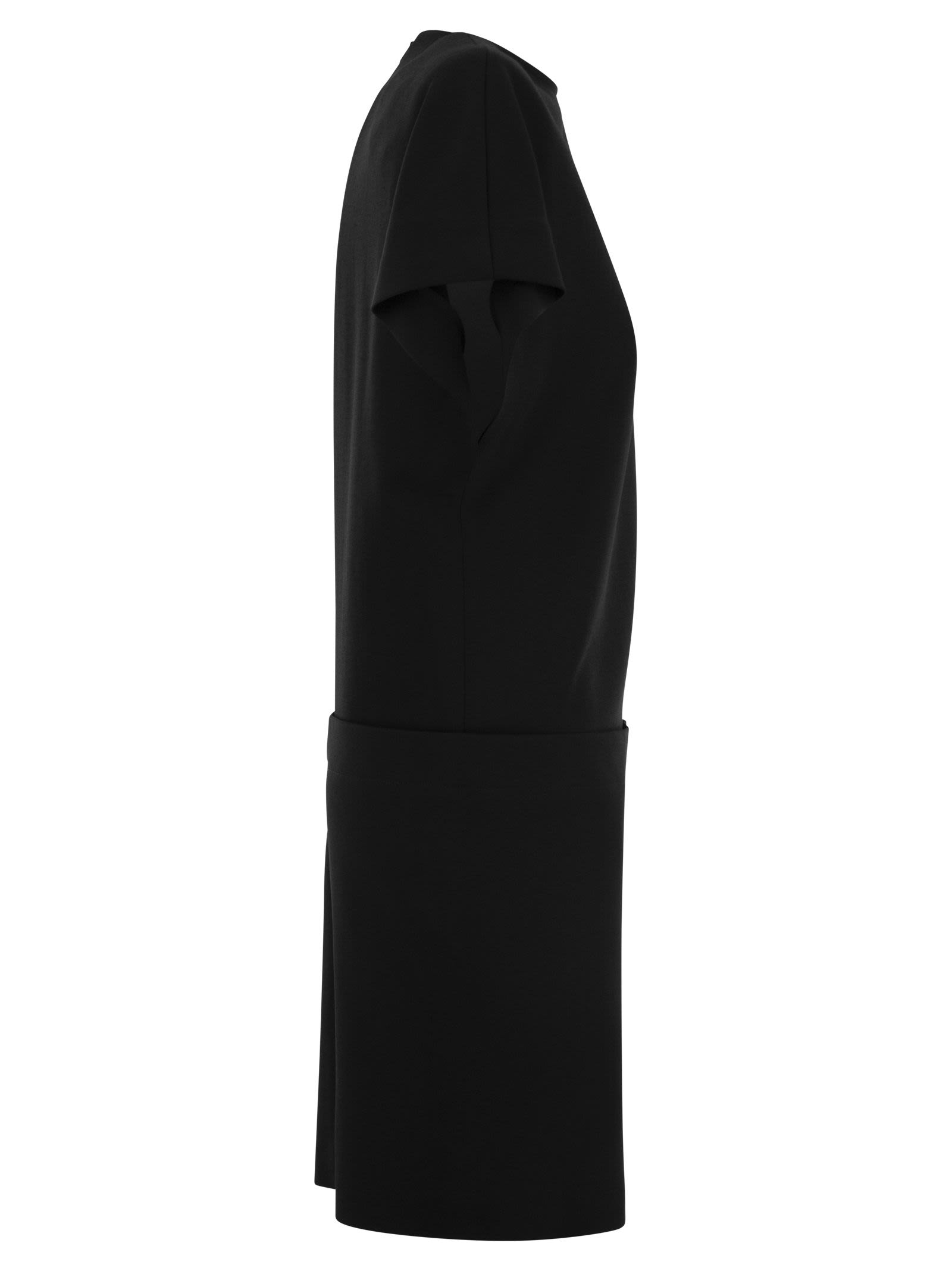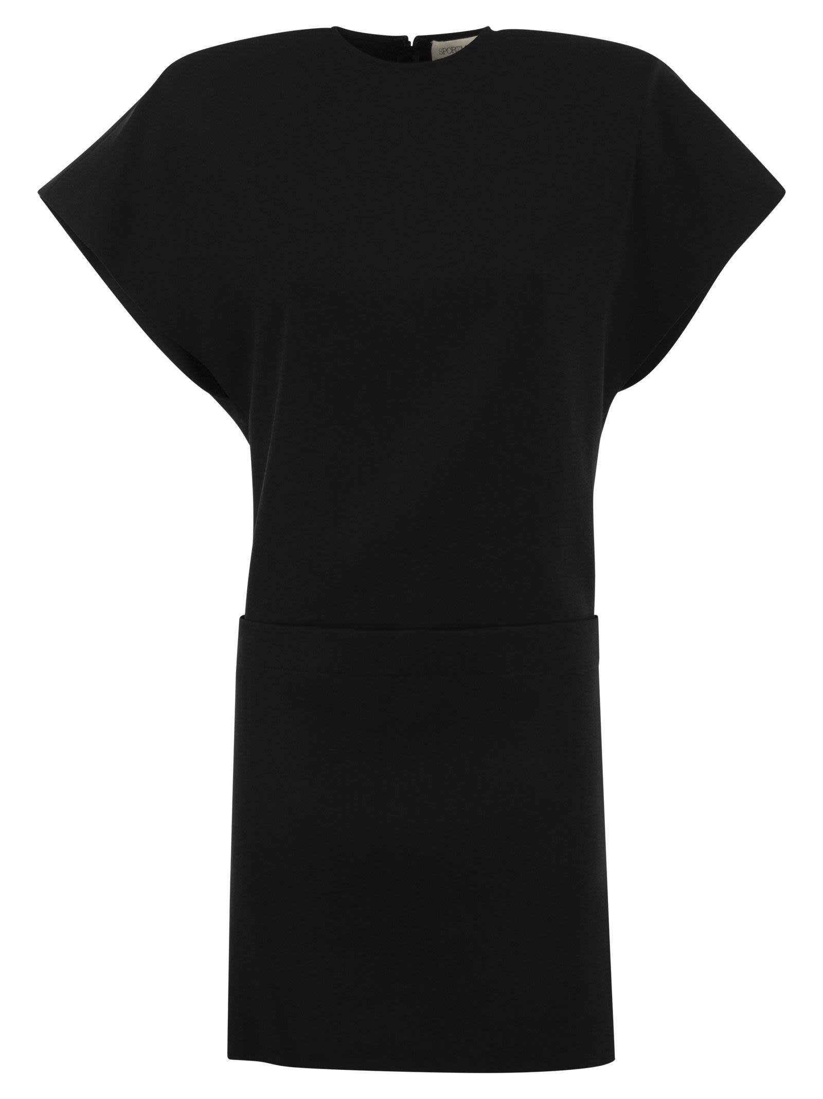 Mini dress in stretch viscose crepe cady. The kimono construction on the top rests on the hips creating a slight drape on the bodice. Sleeves with wide lap and padded inner straps. The waist is low, defined by an insert folded up with stitching. - Straight fitted skirt - Invisible back zip opening DESIGNER ID: 2322210132600 001