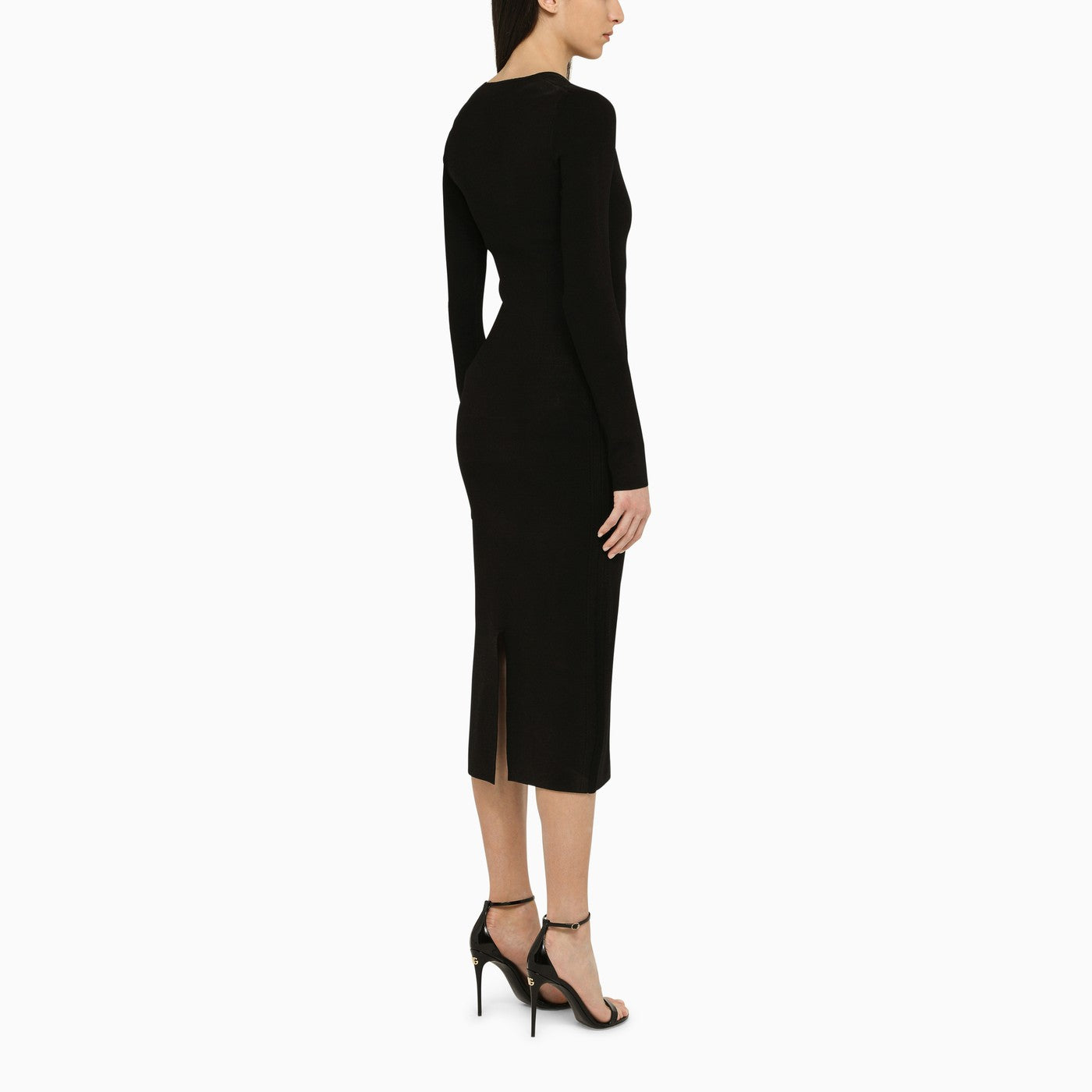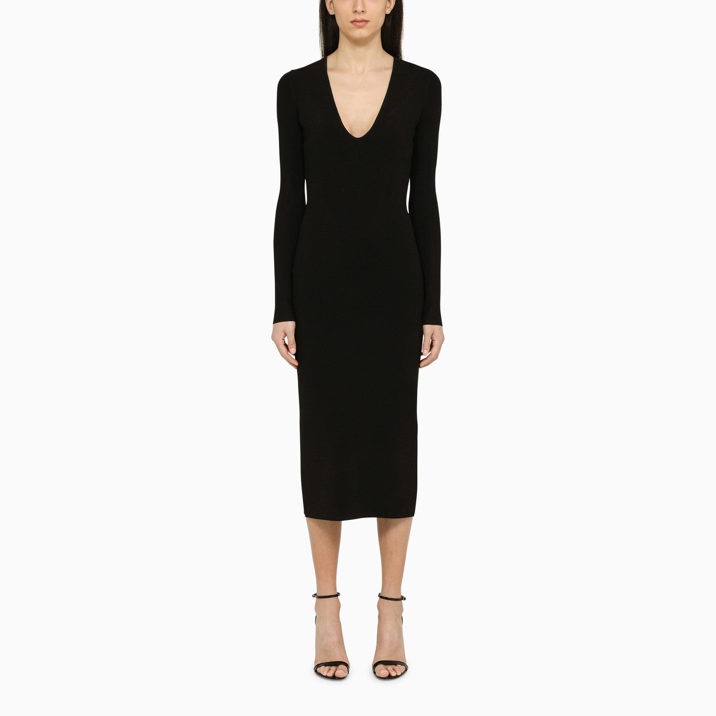 Black knit sheath dress by Victoria Beckham featuring long sleeves, back slit and midi length.