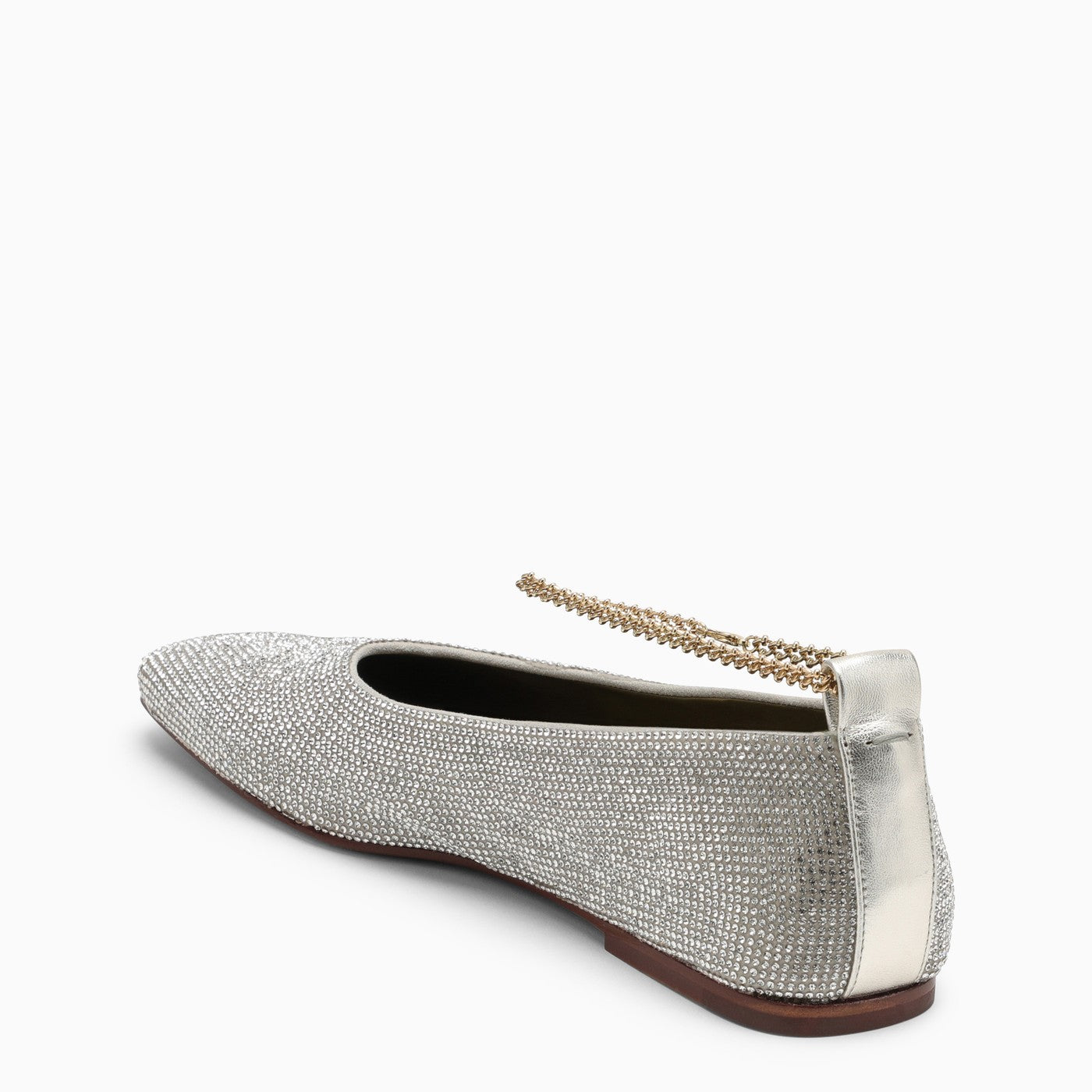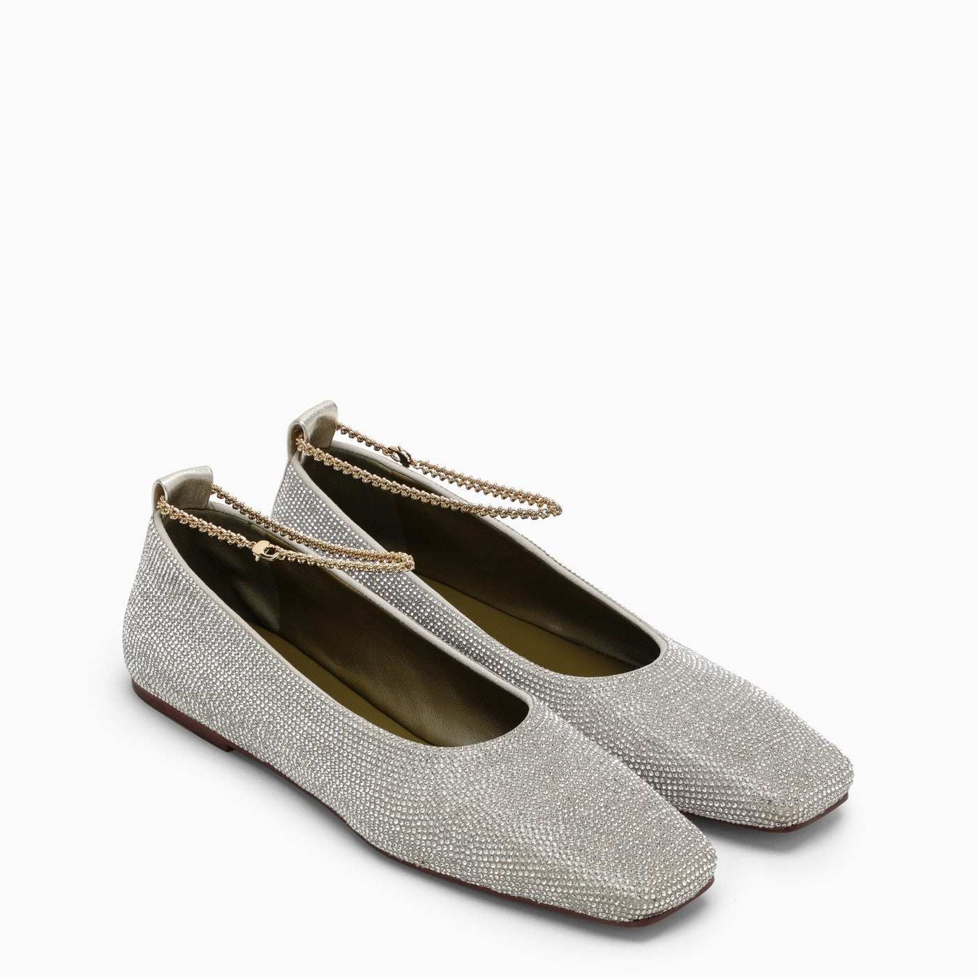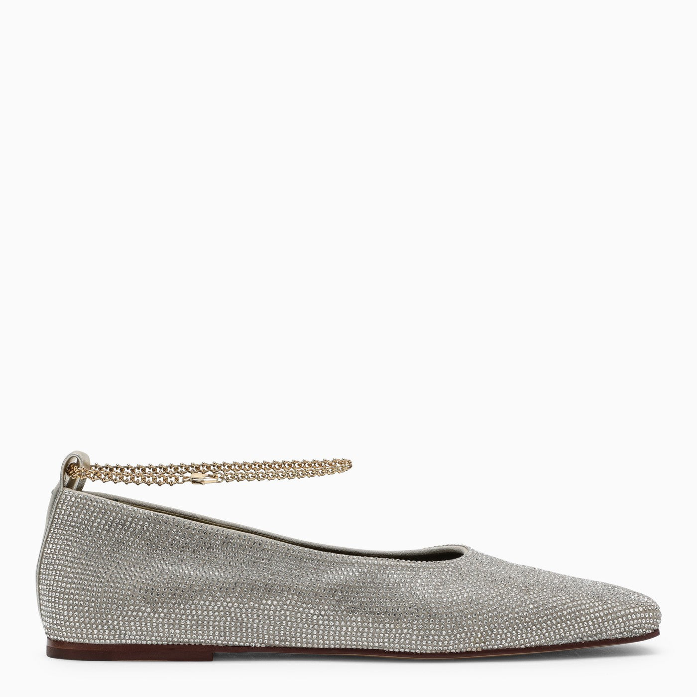 Silver leather ballerina by Maria Luca with rhinestones, featuring a chain ankle strap, square toe and leather sole.